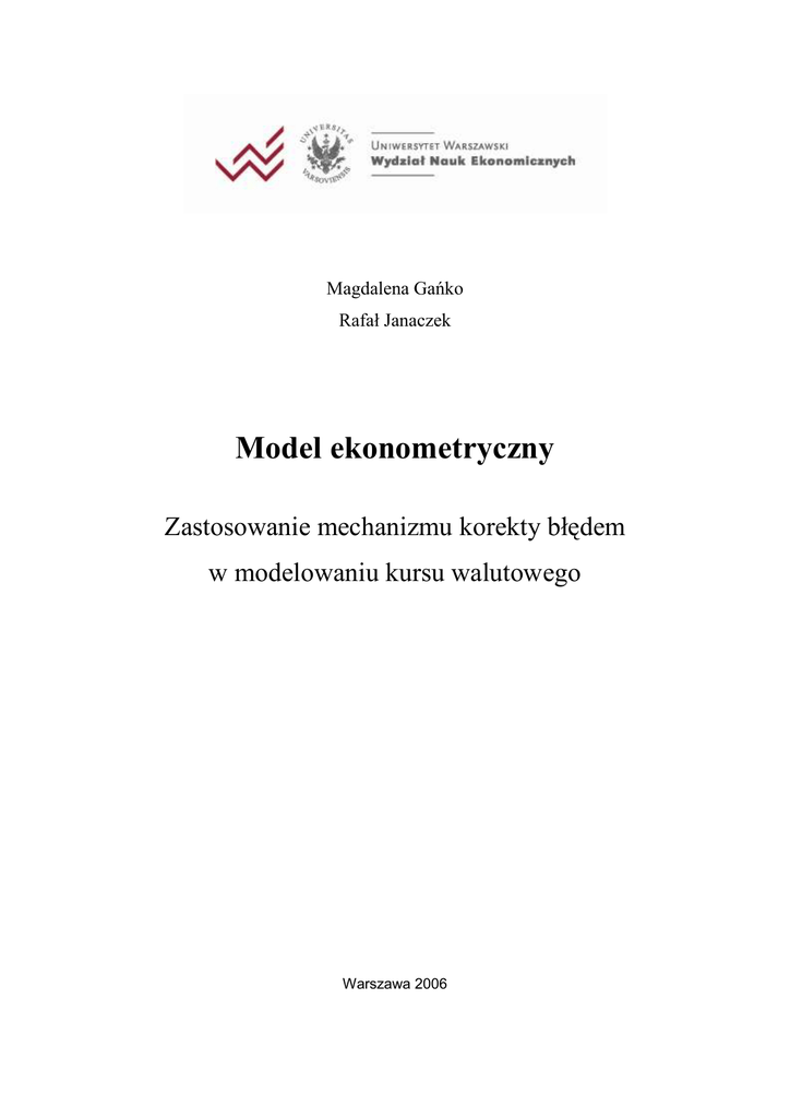 Magdalena Gańko Rafał Janaczek Model ekonometryczny Zastosowanie mechanizmu korekty błędem w modelowaniu kursu walutowego Warszawa 2006 Spis treści Wstęp ......................................................................................................................3 Rozdział I Podstawowe informacje teoretyczne ....................................................................4 1. Kurs walutowy.....................................................................................................4 2. Parytet siły nabywczej .........................................................................................5 3. Mechanizm korekty błędem ................................................................................7 Rozdział II Model ekonometryczny .........................................................................................9 1. Baza danych.........................................................................................................9 2. Postać modelu......................................................................................................9 Rozdział III Interpretacja wyników estymacji.......................................................................23 1. Interpretacja wektora koinegrującego................................................................23 2. Interpretacja pozostałych parametrów modelu..................................................26 2.1. Opis i interpretacja oszacowania poszczególnych współczynników w mechanizmie korekty błędem.....................................................................26 2.2. Ocena stopnia wyjaśnienia zróżnicowania cechy zależnej zróżnicowaniem zmienności cech niezależnych....................................................................27 2.3. Testowanie istotności parametrów strukturalnych – weryfikacja hipotez..27 2.4. Łączna hipoteza istotności..........................................................................28 2.5. Testowanie poprawności formy funkcyjnej ...............................................28 Podsumowanie .....................................................................................................29 Bibliografia...........................................................................................................32 2 Wstęp W badaniach tendencji rozwoju gospodarki każdego kraju nie można pominąć wpływu zagranicy na jego sytuację ekonomiczną. W dobie postępującej globalizacji coraz większego znaczenia nabierają rosnące przepływy kapitałów, dóbr i usług. Wzrost tych powiązań sprawia, że bardzo ważnym zagadnieniem staje się umiejętność określania przyszłego poziomu kursu walutowego. Z tego powodu analiza zmienności kursu walutowego oraz wskazanie czynników makroekonomicznych wpływających na jego poziom są tematem wielu badań ekonomicznych. Lata 90-te stanowiły okres rozwoju modeli tzw. długookresowego kursu równowagi. Jest on definiowany jako kurs, przy którym gospodarka znajduje się w równowadze wewnętrznej (wytwarzany produkt krańcowy jest równy produktowi potencjalnemu) oraz zewnętrznej (saldo rachunku obrotów bieżących bilansu płatniczego jest równe, co do wartości długookresowemu poziomowi salda rachunku kapitałowego). Najczęściej stosuje się następujące modele: Fundamental Equilibrium Exchange Rate (Williamson, 1985), Behavioral Equilibrium Exchange Rate (MacDonald, 1997), Permanent Equilibrium Exchange Rate (Clark i MacDonald, 2000) czy Natural Real Exchange Rate (Stein, 1994). W pracy naszej prezentujemy model kursu walutowego Francji oparty na teorii parytetu siły nabywczej. Ponieważ szeregi kursów walutowych zazwyczaj są niestacjonarne, wiele badań z zakresu analizy zmienności kursu walutowego wykorzystuje modele kointegracji (Johansen, 1991). W niniejszym opracowaniu przedstawione wyniki uzyskane zostały przy użyciu Mechanizmu Korekty Błędem. Pracę podzielono następująco: w rozdziałach pierwszym przedstawiono podstawowe informacje teoretyczne, dotyczące zagadnień, teorii i modelu zastosowanego w badaniu. W drugim przedstawiono model ekonometryczny. W rozdziale trzecim dokonano interpretacji wyników otrzymanych w rozdziale drugim i porównania modelu kursu walutowego Francji z innymi wybranymi wynikami badania kursu walutowego za pomocą parytetu siły nabywczej. Końcową część pracy stanowi podsumowanie uzyskanych wyników. 3 Rozdział I Podstawowe informacje teoretyczne 1. Kurs walutowy Kurs walutowy stanowi cenę jednej waluty wyrażoną w innej walucie. Odgrywa on istotną rolę w wymianie międzynarodowej, ponieważ pozwala na porównywanie cen towarów i usług wytwarzanych w różnych krajach. Wahania i poziom kursu walutowego kształtuje wiele czynników, przy czym za najważniejsze uchodzą: zmiany poziomu dochodu narodowego, zmiany poziomu cen (w tym nominalnych stóp procentowych), charakter cen (elastyczne, okresowo sztywne), poziom realnych stóp procentowych, zmiany w majątku (przez rachunek bieżący bilans płatniczego), preferencje walutowe w akumulacji majątku, ryzyko finansowe, ryzyko polityczne, psychologia uczestników rynku walutowego, instytucjonalna struktura rynków walutowych.1 Należy podkreślić, że wraz z ewolucją gospodarek i postępem w integracji rynków międzynarodowych następowały zmiany w ocenie wagi poszczególnych czynników i ich wpływu na kształtowanie się kursów walutowych. Istnienie wielu kryteriów, które mogą stanowić podstawę klasyfikacji teorii kursu walutowego, sprawia, że trudno jest stworzyć ich jasny podział. W zasadzie teoria kursu walutowego dotyczy tylko kursów zmiennych, ponieważ przy stałych kursach walutowych przedmiotem zainteresowania nie jest sam kurs, ale zmiany zachodzące w bilansie płatniczym. Jednak wiele teorii gospodarki międzynarodowej łączy w dużych modelach zarówno efekty zmian kursów walutowych, jak i zmiany zachodzące w bilansie płatnicz