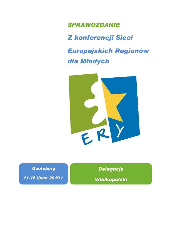 SPRAWOZDANIE Z konferencji Sieci Europejskich Regionów dla Młodych Goeteborg Delegacja 11-16 lipca 2010 r. Wielkopolski W dniach 11-16 lipca 2010 roku delegacja województwa wielkopolskiego reprezentowała region na kolejnej z cyklu konferencji Sieci Europejskich Regionów dla Młodych, która odbywała się w Szwecji. W skład delegacji naszego regionu wchodzili: Łukasz Puślecki – Reprezentant Departamentu Edukacji Urzędu Marszałkowskiego Województwa Wielkopolskiego w Poznaniu, Henryk Józefowski – Prezes Stowarzyszenia Europejskie Centrum Spotkao, Tomasz Bździak – Wiceprezes SECS oraz Piotr Zimnowłodzki i Wojciech Guziałek – członkowie Stowarzyszenia. Tematem przewodnim tegorocznej konferencji był wpływ młodzieży na podejmowanie decyzji. Informacje na ten temat zaprezentowali nie tylko gospodarze – przedstawiciele regionu Vastra Gotland, ale również wszyscy pozostali goście, członkowie Sieci ERY – Emilia Romagna (Włochy), Aquitaine (Francja), Hessen (Niemcy), Dolny Śląsk, Gozo (Malta), Pays de la Loire (Francja) i Wielkopolska. Nad przebiegiem konferencji oraz wartością merytoryczną ze strony szwedzkiej czuwali również członkowie dwóch stowarzyszeo: Get To Know Us Sweden oraz Ung Energi. Dnia pierwszego, po zakwaterowaniu na terenie kampusu w miejscowości Billstromska, zostaliśmy przywitani przez reprezentantów stowarzyszenia Get To Know Us Sweden, którzy zapoznali nas również z programem wydarzeo następujących dni. Wieczorem, wszystkich pochłonęło kibicowanie swoim faworytom w Mistrzostwach Świata w piłce nożnej, które jako niemal obowiązkowy punkt programu seminarium, transmitowane były na ekranie w sali konferencyjnej. Drugi dzieo przebiegł pod hasłem rozmaitych wykładów. Oficjalnego otwarcia seminarium oraz wprowadzenia do warsztatów dokonał Lars Nordstrom, przedstawiciel Departamentu Zdrowia regionu Vastra Gotland, odpowiedzialnego w Szwecji także za politykę młodzieżową, warunki życia, czy kulturę. Pierwszym wykładem, jaki wysłuchaliśmy i z którego wynieśliśmy wiele dobrych praktyk, była prelekcja delegacji Gozo, prezentująca działanie Lokalnych Rad Młodzieży na wyspie. Zaprezentowano mocne i słabe strony uczestnictwa młodzieży w samorządzie lokalnym, jako przykład wpływu młodych ludzi na podejmowanie decyzji. Podczas drugiego z kolei warsztatu, przedstawiciel UNISER z Emilia Romagna zaznajamiał nas z programami i funduszami UE przeznaczonymi dla młodzieży. Obejmowało to praktyki, wolontariaty, programy aktywizacji zawodowej oraz wiele innych. Trzecia tura należała do naszego regionu. Do tematu wpływu młodzieży na podejmowanie decyzji podeszliśmy w sposób nieco nietypowy. Zaprezentowaliśmy bowiem działanie Uczniowskiego Komitetu Obrony Szkoły oraz organizację marszu w obronie VIII LO w Poznaniu w sytuacji nieporozumienia o budynek szkoły między Urzędem Miasta a poznaoską Kurią Biskupią. Pozostałą częśd poświęconego na nasz wykład czasu wykorzystaliśmy na zaproszenie delegacji na III Europejskie Spotkanie Młodzieży – Poznao 2011, prezentując główne założenia projektu i rys programu zajęd. Projekt organizacji III ESM spotkał się z olbrzymim zainteresowaniem i aprobatą uczestników seminarium. Opcjonalnie można było wybrad także inne, trwające równolegle z wymienionymi trzema seminariami, wykłady. Prezentacja Hesji na temat pracy młodzieży w regionie oraz wystawy sztuki ‘documenta13’, Akwitanii, na temat Konwencji o Ochronie Praw Dziecka ONZ, jej historii, projektach zaznajamiania młodzieży z Konwencją, a także jej realizacji oraz Emilia Romagna o wpływie młodzieży w regionie. Druga częśd dnia przeznaczona była na prezentacje odnoszące się do tematu przewodniego, lecz prezentujące praktyki wywodzące się z regionu Vastra Gotland. Pierwszy wykład przedstawiał wpływ młodzieży na planowanie urbanistyczne, drugi, na program aktywizacji i reorganizacji miejscowości Amal. Trzeci natomiast poświęcony był w całości przedstawieniu działao stowarzyszeo Get To Know Us Sweden i Kultur Ungdom, wpływających na zaangażowanie młodzieży w różnego typu działania. Po ciężkim dniu uczestnictwa w prelekcjach, zaczerpnięciu ciekawych doświadczeo i praktyk z regionów Europy, przyszedł czas na zajęcia sportowe i integracyjne. Nie zabrakło również wizyt terenowych. We wtorek, trzeciego dnia, gościliśmy we wsi Stenungsgarden. Tam poznaliśmy działania przeprowadzane dla zaangażowania młodzieży zamieszkującej obszary wiejskie. Przedstawiono nam także wiadomości na temat wpływu młodzieży na rozwój obszarów wiejskich. Zgodnie z planem udaliśmy się także do Goeteborgu. W ramach wykładu: wpływ młodzieży obszarów miejskich, zaprezentowano nam centrum młodzieżowe, w którym młodzi ludzie mogą rozwijad swoje umiejętności w dziedzinie muzyki, taoca, teatru, czy sztuk plastycznych. Później, przyszedł czas na zwiedzanie stolicy regionu. Na seminarium można było poznad nie tylko działalnośd regionów na rzecz młodzieży, ale również lokalne smaki czy elementy kultury regionalnej. Było to możliwe dzięki zorganizowaniu wieczoru interkulturalnego. Lokalne potrawy, taoce, muzyka, czy filmy o regionach – tym chwaliły się obecne reprezentacje z Europy. W środę swoje wysiłki koncentrowaliśmy nad opracowywaniem trzech zadanych tematów. Pierwszy dotyczył kwestii: jak członkowie Sieci mogą dzielid się ze sobą wiedzą i doświadczeniami z dziedziny polityki młodzieżowej, co wiązało się generalnie z omówieniem struktury organizacyjnej Sieci. Drugi temat wiązał się z zagadnieniem: jak Sied umożliwia przeprowadzanie młodzieżowych projektów i wymian oraz jak wspiera młodzieżową mobilnośd i demokrację. Temat trzeci, postawiony również w formie pytania: jak możemy prezentowad i promowad doświadczenia Sieci na poziomach regionalnych, krajowych i unijnym. Do pracy nad wyżej wymi