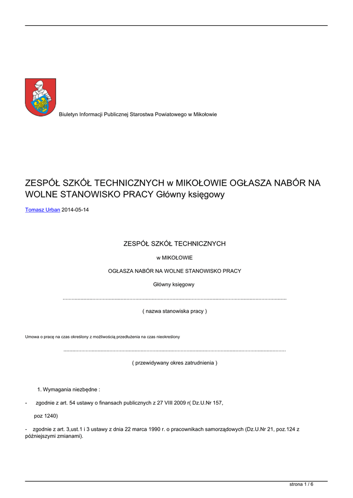Biuletyn Informacji Publicznej Starostwa Powiatowego w Mikołowie ZESPÓŁ SZKÓŁ TECHNICZNYCH w MIKOŁOWIE OGŁASZA NABÓR NA WOLNE STANOWISKO PRACY Główny księgowy Tomasz Urban 2014-05-14 ZESPÓŁ SZKÓŁ TECHNICZNYCH w MIKOŁOWIE OGŁASZA NABÓR NA WOLNE STANOWISKO PRACY Główny księgowy ....................................................................................................................................................... ( nazwa stanowiska pracy ) Umowa o pracę na czas określony z możliwością przedłużenia na czas nieokreślony ...................................................................................................................................................... ( przewidywany okres zatrudnienia ) 1. Wymagania niezbędne : - zgodnie z art. 54 ustawy o finansach publicznych z 27 VIII 2009 r( Dz.U.Nr 157, poz 1240) - zgodnie z art. 3,ust.1 i 3 ustawy z dnia 22 marca 1990 r. o pracownikach samorządowych (Dz.U.Nr 21, poz.124 z późniejszymi zmianami). strona 1 / 6 Wykształcenie 1. studia magisterskie, licencjat lub studia podyplomowe z zakresu rachunkowości i posiada 3-letnią praktykę w księgowości. 2. wykształcenie średnie ekonomiczne lub rachunkowość i posiada co najmniej 6-letnią praktykę w księgowości a) znajomość przepisów dotyczących księgowości budżetowej , znajomość kont i klasyfikacji budżetowej oraz ustaw i rozporządzeń wykonawczych z zakresu rachunkowości i dyscypliny finansów publicznych b) znajomość przepisów o podatku VAT c) znajomość przepisów z zakresu rozliczania dotacji EFS d) obywatelstwo polskie e) kandydat nie może być karany za przestępstwa popełnione umyślnie- przestępstwo przeciw mieniu, działalności instytucji państwowych i samorządowych, obrotowi gospodarczemu. f) pełna zdolność do czynności prawnych oraz korzystanie w pełni z praw publicznych g) oświadczenie o braku przeciwwskazań zdrowotnych do pracy na danym stanowisku h) rzetelność, samodzielność, odporność na stres umiejętności planistyczne i) dyspozycyjność 3. Wymagania dodatkowe : a) biegła znajomość obsługi komputera (MS Word, mS Excel, internet , obsługa elektroniczna programów księgowychVulcan) b) zdolność szybkiego logicznego podejmowania decyzji c) sumienność, zdyscyplinowanie i wysoka kultura osobista 4. Zakres wykonywanych zadań na stanowisku : Prowadzenie rachunkowości w Zespole Szkół Technicznych w Mikołowie zgodnie z obowiązującymi przepisami prawa, a w szczególności poprzez: - opracowywanie dla Zespołu Szkół Technicznych w Mikołowie Zakładowego Planu Kont, zgodnie z rozporządzeniem Ministra Finansów z dnia 15.06.2008 r. w sprawie szczególnych zasad rachunkowości oraz planów kont dla budżetu państwa ,budżetów jednostek samorządu terytorialnego oraz niektórych jednostek sektora finansów publicznych strona 2 / 6 ( Dz. U. Nr 72 , poz.1333), prowadzenie ksiąg rachunkowych na zasadach wynikających z ustawy z dnia 29.09.1994 r.o rachunkowości ( dz.U. Nr 121, poz.591 z późn.zm. ) i ustawy z dnia 27.08.2009 r .o finansach publicznych ( Dz. U. Nr 157, poz.1240), stosowanie rozporządzenia Ministra Finansów z dnia 27.08.2000r. w sprawie szczegółowych zasad gospodarki finansowej jednostek budżetowych, zakładów budżetowych, gospodarstw pomocniczych jednostek budżetowych, oraz szczegółowych zasad i terminów rocznych rozliczeń i wpłat do budżetu przez zakłady budżetowe i gospodarstwa pomocnicze jednostek budżetowych ( Dz.U. Nr 122, poz.1333 z późn. zm.), stosowanie Rozporządzenia Rady Ministrów z dnia 11.07.2008 r (Dz.U.191 poz. 1957) gospodarowania składnikami majątku ruchomego. w sprawie sposobu i trybu sporządzanie sprawozdań budżetowych jednostek samorządu terytorialnego na podst. Rozporządzenia Ministra Finansów z dnia 26.06.2006r Dz.U. Nr 113,poz.770), Zakres odpowiedzialności za naruszenie dyscypliny finansów publicznych reguluje ustawa z odpowiedzialności za naruszenie dyscypliny finansów publicznych dnia 17 .12.2004 r o Wykonywania dyspozycji środkami pieniężnymi wynikających z zatwierdzonych dokumentów. Dokonywania wstępnej kontroli zgodności operacji gospodarczych i finansowych z planem kontrasygnatę zawieranych przez jednostkę umów. finansowym jednostki poprzez Dokonywania kontroli kompletności i rzetelności dokumentów dotyczących operacji gospodarczych i finansowych przez złożenie podpisu na potwierdzenie iż : - nie ma zastrzeżeń do przedstawionej przez właściwych rzeczowo pracowników oceny prawidłowości merytorycznej tej operacji i jej zgodności z prawem, - nie ma zastrzeżeń co do kompletności oraz formalno-rachunkowej rzetelności i prawidłowości dokumentów dotyczących operacji, - zobowiązania wynikające z operacji mieszczą się w planie finansowym jednostki oraz strona 3 / 6 harmonogramie, a jednostka posiada środki finansowe na ich pokrycie. strona 4 / 6 Znajomość przepisów o podatku VAT 5. Wymagane dokumenty : a) życiorys ( CV ) b) list motywacyjny c) dokumenty poświadczające wykształcenie ( kserokopie ) d) kserokopie świadectw pracy g) oświadczenie o braku przeciwwskazań zdrowotnych do wykonywania pracy na stanowisku głównego księgowego h) kwestionariusz osobowy osoby ubiegającej się o zatrudnienie i ) oświadczenie o niekaralności j) wypełniony załącznik nr 1 i 2 do ogłoszenia o naborze na stanowisko urzędnicze. Wymagane dokumenty aplikacyjne należy składać osobiście w siedzibie szkoły lub pocztą na adres szkoły ( Zespół Szkół Technicznych 43-190 Mikołów ul. Rybnicka 44) z dopiskiem dotyczy naboru na stanowisko głównego księgowego w terminie do dnia 28.02.2014 r. ( nie mniej niż 14 dni od dnia opublikowania w BIP ) . Aplikacje , które wpłyną do szkoły po wyżej określonym terminie nie będą rozpatrywane. Informacja o wynikach naboru będzie umieszczona na stronie internetowej Biuletynu Informacji Publicznej ( www.mikolow.bip.info.pl )o