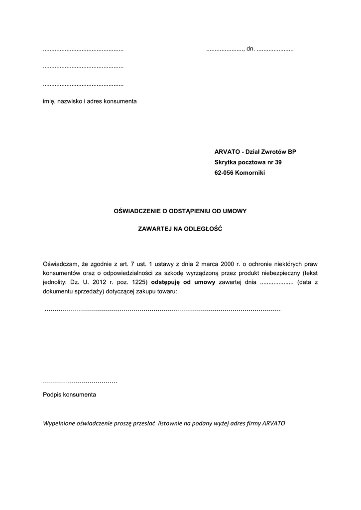 ................................................ ......................, dn. ...................... ................................................ ................................................ imię, nazwisko i adres konsumenta ARVATO - Dział Zwrotów BP Skrytka pocztowa nr 39 62-056 Komorniki OŚWIADCZENIE O ODSTĄPIENIU OD UMOWY ZAWARTEJ NA ODLEGŁOŚĆ Oświadczam, że zgodnie z art. 7 ust. 1 ustawy z dnia 2 marca 2000 r. o ochronie niektórych praw konsumentów oraz o odpowiedzialności za szkodę wyrządzoną przez produkt niebezpieczny (tekst jednolity: Dz. U. 2012 r. poz. 1225) odstępuję od umowy zawartej dnia .................... (data z dokumentu sprzedaży) dotyczącej zakupu towaru: ……………………………………………………………………………………………………… ………………………………. Podpis konsumenta Wypełnione oświadczenie proszę przesłać listownie na podany wyżej adres firmy ARVATO