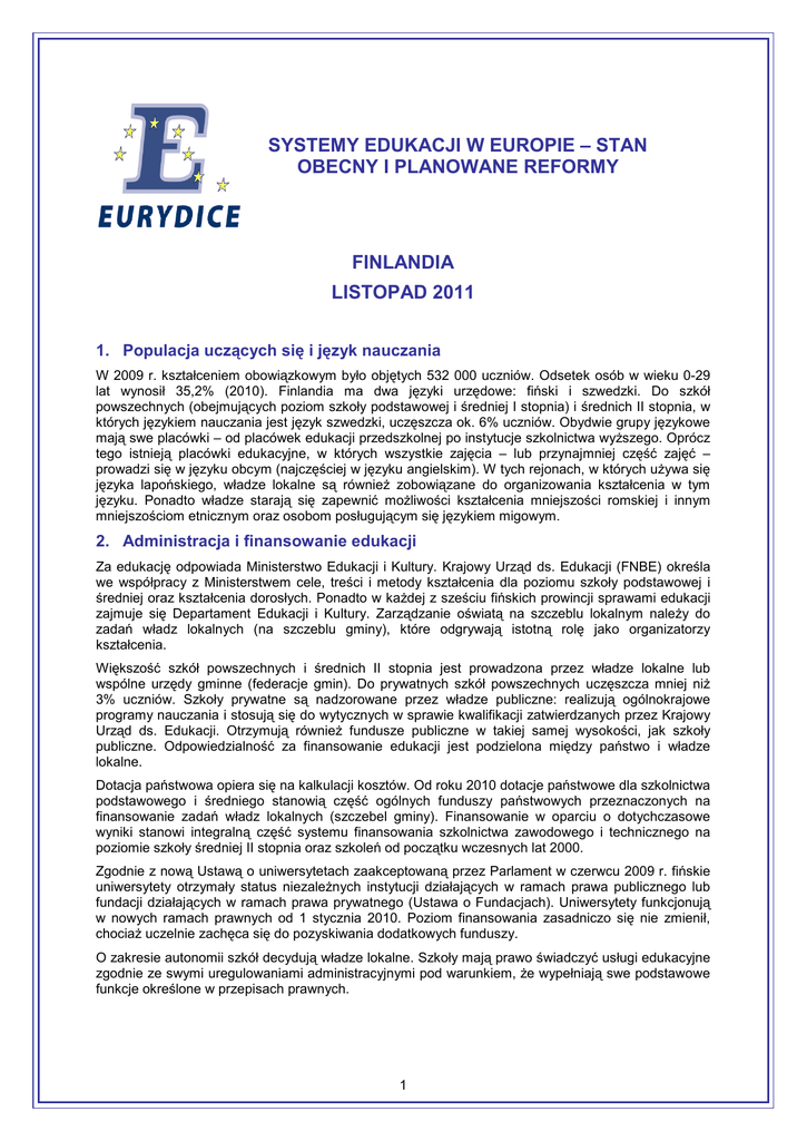 SYSTEMY EDUKACJI W EUROPIE – STAN OBECNY I PLANOWANE REFORMY FINLANDIA LISTOPAD 2011 1. Populacja uczących się i język nauczania W 2009 r. kształceniem obowiązkowym było objętych 532 000 uczniów. Odsetek osób w wieku 0-29 lat wynosił 35,2% (2010). Finlandia ma dwa języki urzędowe: fiński i szwedzki. Do szkół powszechnych (obejmujących poziom szkoły podstawowej i średniej I stopnia) i średnich II stopnia, w których językiem nauczania jest język szwedzki, uczęszcza ok. 6% uczniów. Obydwie grupy językowe mają swe placówki – od placówek edukacji przedszkolnej po instytucje szkolnictwa wyższego. Oprócz tego istnieją placówki edukacyjne, w których wszystkie zajęcia – lub przynajmniej część zajęć – prowadzi się w języku obcym (najczęściej w języku angielskim). W tych rejonach, w których używa się języka lapońskiego, władze lokalne są również zobowiązane do organizowania kształcenia w tym języku. Ponadto władze starają się zapewnić możliwości kształcenia mniejszości romskiej i innym mniejszościom etnicznym oraz osobom posługującym się językiem migowym. 2. Administracja i finansowanie edukacji Za edukację odpowiada Ministerstwo Edukacji i Kultury. Krajowy Urząd ds. Edukacji (FNBE) określa we współpracy z Ministerstwem cele, treści i metody kształcenia dla poziomu szkoły podstawowej i średniej oraz kształcenia dorosłych. Ponadto w każdej z sześciu fińskich prowincji sprawami edukacji zajmuje się Departament Edukacji i Kultury. Zarządzanie oświatą na szczeblu lokalnym należy do zadań władz lokalnych (na szczeblu gminy), które odgrywają istotną rolę jako organizatorzy kształcenia. Większość szkół powszechnych i średnich II stopnia jest prowadzona przez władze lokalne lub wspólne urzędy gminne (federacje gmin). Do prywatnych szkół powszechnych uczęszcza mniej niż 3% uczniów. Szkoły prywatne są nadzorowane przez władze publiczne: realizują ogólnokrajowe programy nauczania i stosują się do wytycznych w sprawie kwalifikacji zatwierdzanych przez Krajowy Urząd ds. Edukacji. Otrzymują również fundusze publiczne w takiej samej wysokości, jak szkoły publiczne. Odpowiedzialność za finansowanie edukacji jest podzielona między państwo i władze lokalne. Dotacja państwowa opiera się na kalkulacji kosztów. Od roku 2010 dotacje państwowe dla szkolnictwa podstawowego i średniego stanowią część ogólnych funduszy państwowych przeznaczonych na finansowanie zadań władz lokalnych (szczebel gminy). Finansowanie w oparciu o dotychczasowe wyniki stanowi integralną część systemu finansowania szkolnictwa zawodowego i technicznego na poziomie szkoły średniej II stopnia oraz szkoleń od początku wczesnych lat 2000. Zgodnie z nową Ustawą o uniwersytetach zaakceptowaną przez Parlament w czerwcu 2009 r. fińskie uniwersytety otrzymały status niezależnych instytucji działających w ramach prawa publicznego lub fundacji działających w ramach prawa prywatnego (Ustawa o Fundacjach). Uniwersytety funkcjonują w nowych ramach prawnych od 1 stycznia 2010. Poziom finansowania zasadniczo się nie zmienił, chociaż uczelnie zachęca się do pozyskiwania dodatkowych funduszy. O zakresie autonomii szkół decydują władze lokalne. Szkoły mają prawo świadczyć usługi edukacyjne zgodnie ze swymi uregulowaniami administracyjnymi pod warunkiem, że wypełniają swe podstawowe funkcje określone w przepisach prawnych. 1 Politechniki, jako instytucje szkolnictwa wyższego zorientowane na kształcenie zawodowe są w większości prowadzone przez władze lokalne lub osoby/instytucje prywatne. Uniwersytety są nadzorowane przez państwo i mają szeroką autonomię. Nie istnieje odrębny inspektorat szkolny, a władze publiczne zrezygnowały z przeprowadzania inspekcji w szkołach. Placówki edukacyjne prowadzą swą działalność zgodnie z celami określonymi w przepisach prawnych i ogólnokrajowymi programami nauczania. Funkcjonowanie systemu jest uzależnione od sprawnej realizacji przez nauczycieli celów określonych w programach nauczania. Duży nacisk kładzie się zarówno na samoocenę szkół, jak i na ocenę zewnętrzną – krajową i międzynarodową. Od 2003 r. w tym obszarze działa wraz z Ministerstwem Edukacji odrębna Rada ds. Ewaluacji Kształcenia. Do zadań Rady należy planowanie, koordynacja, zarządzanie i rozwijanie działań związanych z oceną kształcenia w szkołach powszechnych i średnich II stopnia, a także szkołach dla dorosłych. Ponadto FNBE prowadzi ewaluację efektów uczenia się na poziomie krajowym. Politechniki i uniwersytety same oceniają swą działalność i jej wyniki, jednak otrzymują również wsparcie ze strony Rady ds. Ewaluacji Kształcenia w Szkolnictwie Wyższym. 3. Edukacja przedszkolna Od urodzenia do wieku 6 lat dzieci mogą uczęszczać do ośrodków opieki dziennej - przedszkoli (päiväkoti/daghem) lub uczestniczyć w zajęciach organizowanych w mniejszych grupach dziennej opieki rodzinnej w domach prywatnych (perhepäivähoitopaikka/familjedagvårdsplats), przy czym za wszystkie te formy opieki pobiera się umiarkowanej wysokości opłaty, uzależnione od dochodów rodziców. Wszystkie dzieci w wieku 6 lat mają prawo do bezpłatnej edukacji przedszkolnej (Esiopetus/Förskoleundervisning). Każdy organ władz lokalnych samodzielnie decyduje o tym, czy edukacja przedszkolna ma być prowadzona w szkołach, ośrodkach opieki dziennej lub w innym odpowiednim miejscu. W 2010 r. edukacją przedszkolną były objęte praktycznie wszystkie dzieci w wieku 6 lat. 4. Kształcenie obowiązkowe a) Etapy Perusopetus/Grundläggande utbildning (szkoła powszechna) Age 7-16 Kształcenie obowiązkowe trwa dziewięć lat i prawie wszystkie dzieci wypełniają obowiązek szkolny uczęszczając do szkół powszechnych. Szkoły te mogą oferować dodatkowy rok nauki w X klasie, która nie jest obowiązkowa. b) Kryteria przyjęć Dzieci muszą r