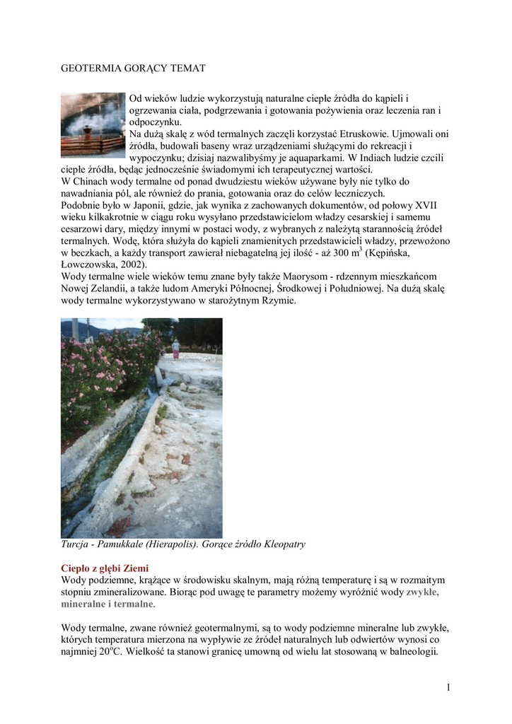 GEOTERMIA GORĄCY TEMAT Od wieków ludzie wykorzystują naturalne ciepłe źródła do kąpieli i ogrzewania ciała, podgrzewania i gotowania pożywienia oraz leczenia ran i odpoczynku. Na dużą skalę z wód termalnych zaczęli korzystać Etruskowie. Ujmowali oni źródła, budowali baseny wraz urządzeniami służącymi do rekreacji i wypoczynku; dzisiaj nazwalibyśmy je aquaparkami. W Indiach ludzie czcili ciepłe źródła, będąc jednocześnie świadomymi ich terapeutycznej wartości. W Chinach wody termalne od ponad dwudziestu wieków używane były nie tylko do nawadniania pól, ale również do prania, gotowania oraz do celów leczniczych. Podobnie było w Japonii, gdzie, jak wynika z zachowanych dokumentów, od połowy XVII wieku kilkakrotnie w ciągu roku wysyłano przedstawicielom władzy cesarskiej i samemu cesarzowi dary, między innymi w postaci wody, z wybranych z należytą starannością źródeł termalnych. Wodę, która służyła do kąpieli znamienitych przedstawicieli władzy, przewożono w beczkach, a każdy transport zawierał niebagatelną jej ilość - aż 300 m3 (Kępińska, Łowczowska, 2002). Wody termalne wiele wieków temu znane były także Maorysom - rdzennym mieszkańcom Nowej Zelandii, a także ludom Ameryki Północnej, Środkowej i Południowej. Na dużą skalę wody termalne wykorzystywano w starożytnym Rzymie. Turcja - Pamukkale (Hierapolis). Gorące źródło Kleopatry Ciepło z głębi Ziemi Wody podziemne, krążące w środowisku skalnym, mają różną temperaturę i są w rozmaitym stopniu zmineralizowane. Biorąc pod uwagę te parametry możemy wyróżnić wody zwykłe, mineralne i termalne. Wody termalne, zwane również geotermalnymi, są to wody podziemne mineralne lub zwykłe, których temperatura mierzona na wypływie ze źródeł naturalnych lub odwiertów wynosi co najmniej 20oC. Wielkość ta stanowi granicę umowną od wielu lat stosowaną w balneologii. 1 Opiera się ona na relacji do temperatury ciała ludzkiego (Dowgiałło i inni, 1969; Pazdro, Kozerski, 1990). Ciepło, które niosą wody termalne, pochodzi z wnętrza Ziemi. Jego głównym źródłem jest płynna magma, zaś dodatkowym – procesy naturalnego rozkładu pierwiastków promieniotwórczych. Rozkład temperatur w skorupie ziemskiej, od którego między innymi zależy temperatura wód termalnych, jest bardzo zróżnicowany. Podstawowym parametrem, który charakteryzuje pole temperaturowe Ziemi, jest gradient geotermiczny. Określa on przyrost temperatury na jednostkę przyrostu głębokości wewnątrz Ziemi, poniżej strefy termicznie neutralnej. Jego odwrotnością jest stopień geotermiczny, mówiący, co ile metrów w głąb Ziemi, temperatura przyrasta o 1o C. Waha się on w szerokich granicach. Skrajne wartości zanotowano w Budapeszcie: 15 m/1o C i w Dregfontein w Republice Południowej Afryki: 144 m/1o ( Stenz, 1954). Wartość stopnia geotermicznego zależy od głębokości zalegania ciał magmowych, przewodnictwa cieplnego skał, tektoniki, ukształtowania powierzchni ziemi, lokalizacji procesów wulkanicznych, promieniotwórczych i geochemicznych, a także od pewnych zjawisk hydrogeologicznych. Jako średnią wartość stopnia geotermicznego w skali globalnej przyjmuje się wielkość 33 m/1oC. Jego wartość zmienia się nie tylko w poziomie, ale również w przekroju pionowym. W Polsce stopień geotermiczny wykazuje duże zróżnicowanie, zależne od budowy geologicznej, a w szczególności od struktur halokinetycznych, odznaczających się wysoką przewodnością cieplną (Górecki – red., 1990). W przedziale głębokości 200 – 2500 m zmienia się on według Majorowicza (1971) od 10 do 110 m/1oC. W północno – wschodniej części kraju wartość stopnia rośnie do około 100 m/1oC, co jest związane ze stosunkowo płytkim występowaniem krystalicznego podłoża. Najniższe wartości, rzędu 20 m/1oC, obserwowane są w Sudetach (Cieplice Śl., Lądek – Zdrój). Gorąca kopalina Jak wynika z poprzedniego rozdziału, wody głębokich poziomów wodonośnych, są zawsze wodami gorącymi. Nie wszędzie jednak warto je eksploatować. Aby wydobycie było opłacalne musi być spełnione kilka warunków: wody termalne muszą mieć możliwie wysoką temperaturę, niską mineralizację (duża powoduje korozję i zanieczyszczanie instalacji) i powinny zalegać na niewielkiej głębokości. Bardzo ważna jest odnawialność zasobów. Zbiorniki wód termalnych nie są bajkowym skarbcem ciepła, z którego można czerpać bez końca, w nieograniczonych ilościach. Ich eksploatacja podlega takim samym ograniczeniom jak eksploatacja zwykłych wód podziemnych: z warstwy wodonośnej można wydobywać tylko tyle, na ile pozwalają zasady racjonalnej gospodarki zasobami. Wody termalne zgodnie z Rozporządzeniem Rady Ministrów z dnia 18 grudnia 2001 r., stanowią kopalinę podstawową w rozumieniu Prawa Geologicznego i Górniczego. W Polsce najkorzystniejsze warunki eksploatacji wód termalnych do celów grzewczych istnieją w obrębie niecki podhalańskiej. Decyduje o tym sytuacja geologiczna, wysoka temperatura na wypływie, (sięgająca 90oC), niska mineralizacja (do 3 g/dm3), wysoka 2 wydajność (nawet do 550 m3/h z pojedynczego ujęcia), dobra odnawialność złoża i łatwa dostępność terenu. Obszarem zasilania dla niecki podhalańskiej są Tatry. Wody opadowe, które tam wsiąkają, spływając na północ, trafiają na warstwę nieprzepuszczalnych skał fliszowych, które stanowią rodzaj klina rozdzielającego je na dwa strumienie – górny i dolny. Górny spływa na teren niecki, do utworów czwartorzędowych i spękanej górnej partii utworów fliszowych (są to wody zwykłe), natomiast dolny przepływa systemem szczelin i pustek krasowych do trzeciorzędowych skał węglanowych i mezozoicznych utworów jednostek tatrzańskich, stając się wodami termalnymi (Chowaniec, 2003). Dobre warunki występowania wód termalnych istnieją w zachodniej czę