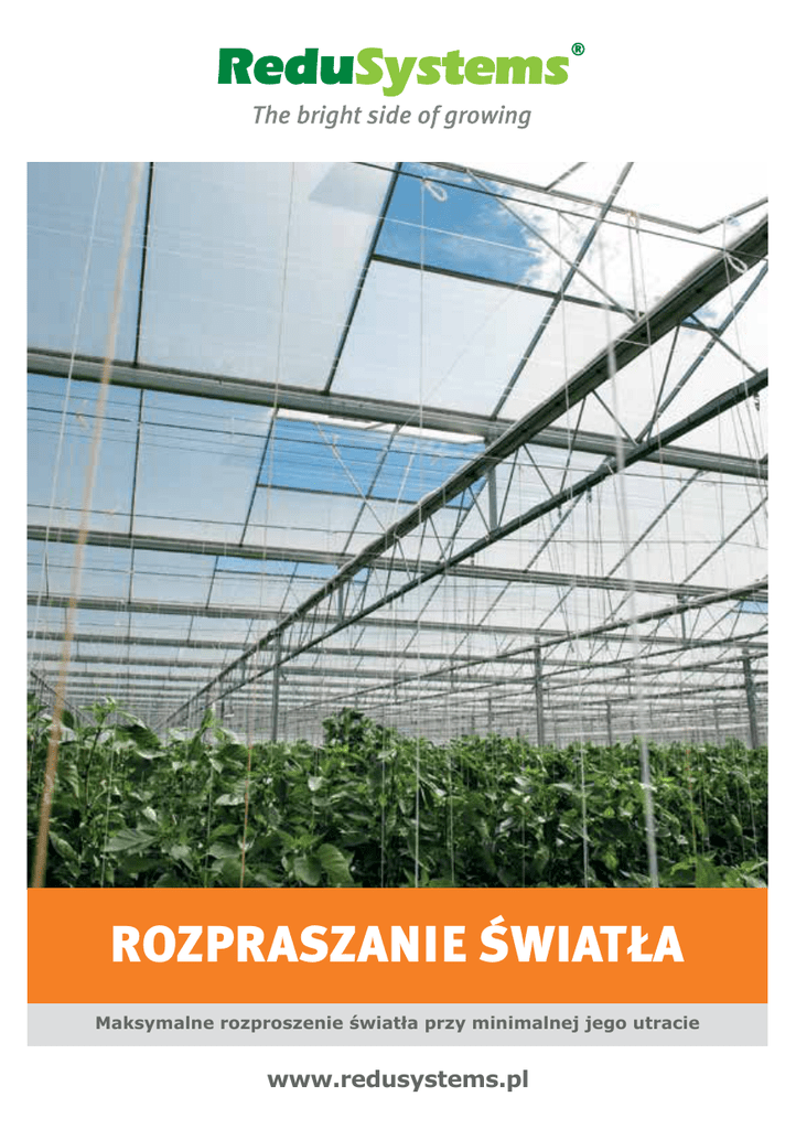 ROZPRASZANIE SWIATLA Maksymalne rozproszenie światła przy minimalnej jego utracie www.redusystems.pl Najbardziej elastyczna metoda rozpraszania światła Czym jest ReduFuse? ReduFuse to powłoka rozpraszająca światło, które wpada przez powierzchnię dachu szklarni. Rozproszone światło wnika głębiej w roślinę, co może wpływać na bardziej obfity zbiór i lepszą jakość. Właściwości • Bardzo wysoka transmisja światła • Zrównoważony klimat dzięki rozproszeniu światła • Mniejszy stres dla roślin • Lepsza fotosynteza, również w dolnej części rośliny • Niższa temperatura liści • Całkowita przezroczystość podczas deszczu • Duża odporność na zmywanie • Przyjemna atmosfera pracy • Nadaje się wyłącznie do stosowania przy szklanych powierzchniach Aplikacja ReduFuse nadaje się do wszystkich roślin wymagających wysokiego naświetlenia. ReduFuse daje minimalne cieniowanie, a przez to nie stanowi osłony przed promieniowaniem cieplnym. ReduFuse z powodzeniem stosowany jest przy warzywach oraz kwiatach i roślinach wymagających dużej ilości światła. Pojemniki na 1 ha 20 14 Odbicie ciepła Jak zastosować Dla uzyskania najlepszego rezultatu rozcieńczony odpowiednią ilością czystej wody ReduFuse należy równomiernie nanieść na niezabrudzoną i suchą powierzchnię dachu szklarni. Ilość wody, jaką należy dodać zależy od metody nakładania produktu. Zaleca się rozprowadzać ReduFuse metodą maszynową. ReduFuse należy nakładać wyłącznie na szklane powierzchnie dachu szklarni, na których istnieje możliwość montażu myjki do szklarni. Tabela poniżej podaje orientacyjną liczbę pojemników oraz zawiera dane dotyczące wpływu na klimat w szklarni. Jak usunąć ReduFuse można z łatwością usunąć przy pomocy ReduClean. W przypadku suchej pogody należy rozcieńczyć na 1 haktar, co najmniej 250 litrów ReduClean z od 5 do 7 częściami wody, a następnie pokryć (najlepiej maszynowo) roztworem powierzchnię przeznaczoną do zmycia. Nakładać wyłącznie, jeśli w ciągu 2 kolejnych dni spodziewany jest obfity opad. W większości przypadków większa ilość wody opadowej pozwoli całkowicie usunąć warstwę. W przypadku niezadowalającego efektu szklarnię należy wyczyścić myjką do szklarni. Aby uzyskać więcej informacji odwiedź www.redusystems.pl Odbicie światła Odporność na zmywanie Optymalne rozpraszanie światła połączone z ochroną przed promieniowaniem cieplnym Czym jest ReduFuse IR? ReduFuse to powłoka, która częściowo utrzymuje promieniowanie cieplne na zewnątrz i jednocześnie rozprasza światło słoneczne, które wpada przez dach szklarni. Właściwości • Wysoka transmisja światła • Obniża temperaturę w szklarni dzięki wysokiemu odbijaniu promieniowania podczerwonego • Zrównoważony klimat dzięki rozproszeniu światła • Mniejszy stres dla roślin • Lepsza fotosynteza, również w dolnej części rośliny • Niższa temperatura liści • Duża odporność na zmywanie • Łatwo się usuwa przy pomocy ReduClean • Przyjemna atmosfera pracy • Nadaje się do stosowania na powierzchniach ze szkła, folii akrylowych, plastikowych i folii na poliwęglan Aplikacja ReduFuse IR nadaje się do wszystkich roślin wymagających wysokiego naświetlenia. ReduFuse IR z powodzeniem stosowany jest przy kwiatach, roślinach i warzywach w ciepłym klimacie lub w okresach wysokich temperatur. Pojemniki na 1 ha 22 18 Odbicie ciepła ReduFuse IR nadaje się dla roślin, które czerpią korzyści z rozproszonego światła, ale nie są odporne na zbyt wysokie temperatury. Jak zastosować Dla uzyskania najlepszego rezultatu ReduFuse IR należy rozcieńczyć odpowiednią ilością czystej wody, a następnie rozprowadzić na czystym i suchym dachu szklarni. Ilość wody, jaką należy dodać zależy od metody nakładania. Najlepszym rozwiązaniem w przypadku ReduFuse IR jest nakładanie metodą maszynową. Tabela poniżej podaje orientacyjną liczbę pojemników oraz zawiera dane dotyczące wpływu na klimat w szklarni. Jak usunąć ReduFuse IR można z łatwością usunąć przy pomocy ReduClean. W przypadku suchej pogody należy rozcieńczyć na 1 hektar, co najmniej 250 litrów ReduClean z od 5 do 7 częściami wody, a następnie pokryć roztworem powierzchnię przeznaczoną do zmycia. Nakładać wyłącznie, jeśli w ciągu kilku kolejnych dni spodziewany jest obfity opad. Większa ilość wody opadowej całkowicie usunie warstwę. Aby uzyskać więcej informacji odwiedź www.redusystems.pl Odbicie światła Odporność na zmywanie ReduSystems to grupa dających się usuwać powłok, pozwalająca właścicielom upraw na jeszcze lepszą regulację klimatu. Powłoki ReduSystems nakłada się na powierzchnię dachu szklarni za pomocą powszechnie stosowanych urządzeń do oprysku. Dzięki temu powierzchnia szklarni pozostaje zabezpieczona przed działaniem czynników atmosferycznych przez cały sezon. Powłoki ReduSystems można w dowolnym momencie usunąć za pomocą ReduClean. W zależności od sytuacji ReduSystems oferuje pakiet odpowiedniego rozwiązania dla każdego właściciela upraw niezależnie od miejsca uprawy. ReduSystems obejmuje 3 linie produktów: CIENIOWANIE Skuteczna ochrona przed nadmiarem ciepła i/lub światła Powłoki obniżające temperaturę rośliny oraz temperaturę w szklarni dzięki odbijaniu światła podczerwonego, które sprzyja nagrzewaniu. Światło niezbędne do wzrostu roślin przepuszczane jest w większym lub w mniejszym stopniu zależnie od wybranego produktu. ROZPRASZANIE SWIATLA Maksymalne rozproszenie światła przy minimalnej jego utracie Powłoki, które maksymalnie rozpraszają promienie słoneczne, utrzymując wysoki poziom transmisji światła. Promieniowanie cieplne (podczerwone) odbijane jest w mniejszym lub w większym stopniu zależnie od wybranego produktu. PRODUKTY SPECJALISTYCZNE Światło dla innowacji W laboratoriach w Mardenkro we