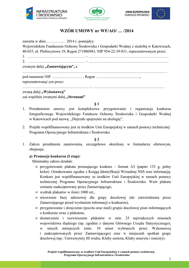 WZÓR UMOWY nr WF/AO/ … /2014 zawarta w dniu …………… 2014 r. pomiędzy: Wojewódzkim Funduszem Ochrony Środowiska i Gospodarki Wodnej z siedzibą w Katowicach, 40-035, ul. Plebiscytowa 19, Regon 271806983, NIP 954-22-39-831, reprezentowanym przez: 1. ……………………………………… - ……………………………………………………… 2. ……………………………………… - ……………………………………………………… zwanym dalej „Zamawiającym”, a …………………………………………………………………………………………………… pod numerem NIP …………………… , Regon ……………….……………., reprezentowaną/-ym przez: …………………………………………….. - ………………………………………………… zwaną dalej „Wykonawcą” zaś wspólnie zwanymi dalej „Stronami” 1. 2. 1. §1 Przedmiotem umowy jest kompleksowe przygotowanie i organizacja konkursu fotograficznego Wojewódzkiego Funduszu Ochrony Środowiska i Gospodarki Wodnej w Katowicach pod nazwą: „Dojrzałe spojrzenie na ekologię”. Projekt współfinansowany jest ze środków Unii Europejskiej w ramach pomocy technicznej Programu Operacyjnego Infrastruktura i Środowisko. §2 Zakres przedmiotu zamówienia, szczegółowo określony w formularzu ofertowym, obejmuje: a) Promocja konkursu (I etap): Minimalny zakres działań: • przygotowanie plakatu promującego konkurs – format A3 (papier 135 g, pełny kolor). Oznakowanie zgodne z Księgą Identyfikacji Wizualnej NSS oraz informacją: Konkurs jest współfinansowany ze środków Unii Europejskiej w ramach pomocy technicznej Programu Operacyjnego Infrastruktura i Środowisko. Wzór plakatu zostanie zaakceptowany przez Zamawiającego, • wydruk plakatów w ilości 1000 szt., • stworzenie bazy adresowej dla grupy docelowej (do zatwierdzenia przez Zamawiającego przed wysłaniem informacji o konkursie), • przygotowanie i doręczenie (poczta oraz mail) grupie docelowej pism informujących o konkursie wraz z plakatem, • dostarczenie i rozwieszenie plakatów w min. 25 największych miastach województwa śląskiego (np. zgodnie z danymi Głównego Urzędu Statystycznego), w innych mniejszych (min. 10 miast wybranych przez Wykonawcę i zaakceptowanych przez Zamawiającego) oraz w miejscach spotkań grupy docelowej (np.: Uniwersytety III wieku, Kluby seniora, Kluby emeryta i rencisty). Projekt współfinansowany ze środków Unii Europejskiej w ramach pomocy technicznej Programu Operacyjnego Infrastruktura i Środowisko 1 • promocja konkursu na stronach internetowych (strona Funduszu, indywidualna strona dotycząca konkursu) oraz informacja o konkursie w lokalnych rozgłośniach radiowych w województwie śląskim (min. 4 rozgłośnie, min. 6 informacji w terminie nadsyłania prac tj. od 02.06 – 30.06.2014 r.), • poinformowanie o konkursie beneficjentów POIiŚ z terenu województwa śląskiego (zgodnie z listą dostarczoną przez zamawiającego), b) Zakup nagród dla laureatów (II etap) • • • • • • I miejsce - ……………………………………………………………………….., II miejsce - ………………………………………………………………………., III miejsce – …………………………………………………………………….., WyróŜnienie I – …………………………………………………………………, WyróŜnienie II – ……………………………………………………………….., WyróŜnienie III – ………………………………………………………………. . c) Organizacja finału konkursu – uroczystość wręczania nagród (etap III): Wykonawca jest zobowiązany do: • • • • • • 2. 3. wynajmu sali w …………………….w Katowicach przy ul……………….., w dniu … września 2014 r. w godzinach od …… do …….., dla grupy………….., wyposaŜonej w: - scenę (o powierzchni min. 40 m²), sprzęt audiowizualny (rzutnik, projektor filmowy, ekran, min. 2 mikrofony bezprzewodowe), - mównice, - widownię umoŜliwiającą ustawienie stolików w układzie wyspowym dla wszystkich uczestników, - nagłośnienie o łącznej mocy min. 3000 W, - szatnię. zapewnienie moŜliwości ekspozycji najlepszych prac konkursowych, przygotowanie prezentacji multimedialnej prac laureatów na uroczystości rozdania nagród, zapewnienie osoby prowadzącej uroczystość - moderatora, zapewnienie obsługi technicznej uroczystości, umoŜliwienie przedstawienia prezentacji WFOŚiGW w Katowicach na temat POIiŚ, informującej uczestników uroczystości, zwłaszcza młodzieŜ i nauczycieli o efektach rzeczowych i ekologicznych inwestycji oraz ich znaczeniu dla mieszkańców województwa. zapewnienie cateringu dla grupy ……. (bufet: kawa, herbata, woda gazowana i niegazowana, soki w butelkach o pojemności max 0,5 litra lub w dzbankach, ciastka, owoce, małe kanapki, koniecznie szklane naczynia Wykonawca jest zobowiązany do udokumentowania wykonanych czynności (w tym wykonanie min. 100 zdjęć potwierdzających rozwieszenie plakatów). Regulamin konkursu stanowi załącznik do niniejszej umowy. Zmiana postanowień regulaminu wymaga pisemnej akceptacji Zamawiającego. Projekt współfinansowany ze środków Unii Europejskiej w ramach pomocy technicznej Programu Operacyjnego Infrastruktura i Środowisko 2 4. 5. 6. 7. 8. 9. 1. Wszelkie dokumenty oraz materiały związane z przygotowaniem i realizacją konkursu powinny zawierać oznakowanie zgodne z zapisami zawartymi w Księdze identyfikacji wizualnej NSS wraz z adnotacją, Ŝe projekt jest dofinansowany ze środków Programu Operacyjnego Infrastruktura i Środowisko, zgodnie z RPD info-promo na 2014 rok Zamawiający zastrzega sobie prawo do ograniczenia w części lub całości realizacji przedmiotu zamówienia opisanego w § 2 us