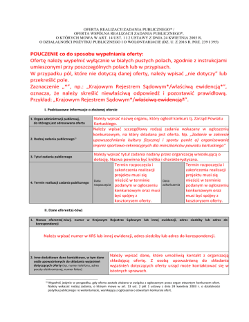 OFERTA REALIZACJI ZADANIA PUBLICZNEGO* / OFERTA WSPÓLNA REALIZACJI ZADANIA PUBLICZNEGO*, O KTÓRYCH MOWA W ART. 14 UST. 1 I 2 USTAWY Z DNIA 24 KWIETNIA 2003 R. O DZIAŁALNOŚCI POŻYTKU PUBLICZNEGO I O WOLONTARIACIE (DZ. U. Z 2016 R. POZ. 239 I 395) POUCZENIE co do sposobu wypełniania oferty: Ofertę należy wypełnić wyłącznie w białych pustych polach, zgodnie z instrukcjami umieszonymi przy poszczególnych polach lub w przypisach. W przypadku pól, które nie dotyczą danej oferty, należy wpisać „nie dotyczy” lub przekreślić pole. Zaznaczenie „*”, np.: „Krajowym Rejestrem Sądowym*/właściwą ewidencją*”, oznacza, że należy skreślić niewłaściwą odpowiedź i pozostawić prawidłową. Przykład: „Krajowym Rejestrem Sądowym*/właściwą ewidencją*”. I. Podstawowe informacje o złożonej ofercie 1. Organ administracji publicznej, do którego jest adresowana oferta 2. Rodzaj zadania publicznego1) 3. Tytuł zadania publicznego 4. Termin realizacji zadania publicznego Należy wpisać nazwę organu, który ogłosił konkurs tj. Zarząd Powiatu Kartuskiego. Należy wpisać szczegółowy rodzaj zadania wskazany w ogłoszeniu konkursowym, na który składana jest oferta. Np. „Zadanie w zakresie upowszechniania kultury fizycznej i sportu punkt a) organizowanie imprez sportowo-rekreacyjnych dla mieszkańców powiatu kartuskiego” Należy wpisać tytuł zadania nadany przez organizację wnioskującą o dotację. Nazwa powinna być krótka i charakterystyczna. Termin rozpoczęcia i Termin rozpoczęcia i zakończenia realizacji zakończenia realizacji projektu musi się projektu musi się mieścić w terminie mieścić w terminie Data Data rozpoczęcia podanym w ogłoszeniu zakończenia podanym w ogłoszeniu konkursowym oraz musi konkursowym oraz być spójny z musi być spójny z kosztorysem oferty. kosztorysem oferty. II. Dane oferenta(-tów) 1. Nazwa oferenta(-tów), numer w Krajowym Rejestrze Sądowym lub innej ewidencji, adres siedziby lub adres do korespondencji Należy wpisać numer w KRS lub innej ewidencji, adres siedziby lub adres do korespondencji. 2. Inne dodatkowe dane kontaktowe, w tym dane osób upoważnionych do składania wyjaśnień dotyczących oferty (np. numer telefonu, adres poczty elektronicznej, numer faksu) Należy wpisać dane, które umożliwią kontakt z organizacją składającą ofertę. Z osobą upoważnioną do składania wyjaśnień dotyczących oferty urząd może kontaktować się w istotnych sprawach. __________________________________________________ 1) Wypełnić jedynie w przypadku, gdy oferta została złożona w związku z ogłoszonym przez organ otwartym konkursem ofert. Należy wskazać rodzaj zadania, o którym mowa w art. 13 ust. 2 pkt 1 ustawy z dnia 24 kwietnia 2003 r. o działalności pożytku publicznego i o wolontariacie, wynikający z ogłoszenia o otwartym konkursie ofert. 3. Nazwa, adres i dane kontaktowe jednostki organizacyjnej bezpośrednio wykonującej zadanie publiczne, o którym mowa w ofercie (należy wypełnić, jeżeli zadanie ma być realizowane przez oddział terenowy, placówkę lub inną jednostkę organizacyjną oferenta) Tę rubrykę należy wypełnić, jeżeli zadanie ma być realizowane przez oddział terenowy, placówkę lub inną jednostkę organizacyjną oferenta. Jeżeli zadanie nie będzie realizowane przez oddział terenowy, placówkę lub inną jednostkę oferenta wówczas należy wpisać „nie dotyczy” lub przekreślić. 4. Przedmiot działalności pożytku publicznego: 1) działalność nieodpłatna pożytku publicznego: Należy wpisać zakres prowadzonej działalności, musi być on spójny ze statutem organizacji. Aby oferent mógł realizować zaproponowane zadanie musi się ono wpisywać w zakres działalności nieodpłatnej pożytku publicznego zapisanej w statucie. Jeżeli oferent nie prowadzi działalności w tym zakresie to oferta nie spełnia wymogów formalnych. 2) działalność odpłatna pożytku publicznego: Należy wpisać zakres prowadzonej odpłatnej działalności pożytku publicznego, musi być on spójny ze statutem organizacji. Aby oferent mógł pobierać świadczenia pieniężne od odbiorców zadania publicznego to musi w zakresie składnego zadania publicznego prowadzić działalność odpłatną. III. Informacja o sposobie reprezentacji oferenta(-tów) wobec organu administracji publicznej, w tym imiona i nazwiska osób upoważnionych do reprezentowania oferenta(-tów) wobec organu administracji publicznej, wraz z przytoczeniem podstawy prawnej2) Należy wpisać imiona i nazwiska osób upoważnionych do reprezentowania oferenta oraz przytoczyć podstawę prawną ze statutu, wypisu z KRS lub innego dokumentu (m.in. pełnomocnictwo) np. Zgodnie z § 20 ust. 1 statutu organizacji cyt. „DO SKŁADANIA OŚWIADCZEŃ WOLI W IMIENIU STOWARZYSZENIA, W TYM W SPRAWACH MAJĄTKOWYCH UPRAWNIONY JEST PREZES STOWARZYSZENIA I CO NAJMNIEJ JEDEN Z POZOSTAŁYCH CZŁONKÓW ZARZĄDU”. Osoby upoważnione do reprezentowania oferenta to: Jan Kowalski – Prezes Zarządu i Jan Nowak – Członek Zarządu IV. Szczegółowy zakres rzeczowy oraz kalkulacja przewidywanych kosztów zadania publicznego 1. Streszczenie zadania publicznego wraz ze wskazaniem miejsca jego realizacji Należy napisać krótkie streszczenie zadania publicznego oraz podać miejsce jego realizacji. 2. Opis potrzeb wskazujących na celowość wykonania zadania publicznego wraz z liczbą oraz opisem odbiorców tego zadania Należy napisać jakie potrzeby, wyniki badań czy diagnoza wskazują na konieczność i celowość wykonania zadania publicznego. Należy opisać i podać liczbę odbiorców tego zadania. Należy opisać sposób rekrutacji odbiorców zadania np. wysłanie informacji do instytucji o możliwości wzięcia udziału w zadaniu, ogłoszenia na stronach internetowych itp. Należy także podać sposób wyboru odbiorców zadania np. decyduje pierwszeństwo zgłoszeń, decyduje zła sytuacja finansowana
