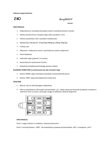 Cyfrowa waga kuchenna SPECYFIKACJA • Wyposażona w niezwykle precyzyjny system czujników pomiaru nacisku • Szklana powierzchnia z bezpiecznego szkła o grubości 4 mm • Zielony wyświetlacz LED o wysokiej rozdzielczości • Maksymalne obciążenie: 10 kg (20g-5000g/1g, 5002g-10kg/2g) • Funkcja tara • Włączanie i wyłączanie ręczne, automatyczny system wyłączania • Panel dotykowy • Jednostka wagi: g (gram) / oz (uncja) • Automatyczne resetowanie licznika • Wskaźnik przeładowania/niskiego poziomu baterii KLAWISZE FUNKCYJNE są umieszczone po obu stronach wagi • Klawisz MODE: jego naciśnięcie powoduje zmianę jednostki (g-oz) • Klawisz TARE: włączanie/wyłączanie funkcji tara ZASILANIE • Baterie: 4x1,5v AAA (dostępne oddzielnie) • Gdy na wyświetlaczu LED pojawi się komunikat „Lo”, należy otworzyć drzwiczki przedziału na baterie i wymienić stare na nowe, zwracając uwagę na właściwe ułożenie biegunów SPECYFIKACJA Krok 1: wagę umieścić na stabilnej i równej powierzchni Krok 2: nacisnąć klawisz „TARE”. Na wyświetlaczu pojawią się komunikaty „ON”, a następnie „zero”. Krok 3: na wadze umieścić produkty spożywcze, a następnie odczekać, aż wyświetli się ich waga. FUNKCJA TARA Krok 1: na wadze położyć pojemnik. Wyświetlacz LED pokaże wagę pojemnika Krok 2: Aby skasować odczyt wagi pojemnika, nacisnąć przycisk „TARE” (resetowanie do wartości 0). Następnie do pojemnika włożyć ważone produkty. Wyświetlacz LED pokaże tylko wagę produktów. Aby zważyć inne składniki, powtórzyć procedurę, wciskając przycisk „TARE”. Krok 3: po wyjęciu ważonych składników z pojemnika, na wyświetlaczu pojawi się wartość ujemna. Wówczas ponownie nacisnąć przycisk „TARE” – po upływie dwóch sekund na wyświetlaczu pojawi się standardowy status ważenia. WYŁĄCZANIE • Aby wyłączyć wagę, nacisnąć i przytrzymać przycisk „TARE” przez ok. dwie sekundy. • Po upływie ok. 60 sekund waga wyłączy się automatycznie. ZMIANA JEDNOSTKI (g/oz) • Aby zmienić jednostkę wagi – do wyboru gramy (g) lub uncje (oz) – podczas ważenia nacisnąć przycisk „MODE” 1. Niski stan baterii sygnalizowany jest na wyświetlaczu za pomocą następującego symbolu: 2. W razie przeładowania, na wyświetlaczu pojawi się komunikat „EEEE”: 3. Komunikat „OUT2” wyświetlany jest gdy: a) Przed włączeniem urządzenia na wadze znajdował się przedmiot o ciężarze przekraczającym 1,9 kg b) Nastąpiło uszkodzenie czujnika c) Nastąpiło przerwanie przewodu czujnika 4. Informacja o nieprawidłowym ułożeniu – poniższy komunikat pojawia się na wyświetlaczu po włączeniu urządzenia, gdy waga znajduje się w niestabilnej pozycji (jest trzymana w rękach lub umieszczona na nierównej powierzchni) Wskazówki dotyczące użytkowania i pielęgnacji • Aby zapewnić optymalną dokładność i powtarzalność pomiaru, wagę należy umieścić na równej i stabilnej powierzchni. • Należy uważać, by nie upuścić urządzenia. Wagi nie wolno ponadto poddawać wstrząsom, ponieważ może to doprowadzić do uszkodzenia mechanizmu. • Urządzenia nie wolno czyścić za pomocą chemicznych substancji ściernych. • Wagę czyścić wilgotną szmatką, uważając, by woda nie dostała się do środka urządzenia. • Aby przedłużyć okres użytkowania, wagi nie wolno poddawać działaniu wilgoci ani wysokiej temperatury. • Jeżeli waga nie będzie użytkowana przez dłuższy okres czasu, należy wyjąć z niej baterie. • W przypadku niewłaściwej pracy urządzenia, należy sprawdzić baterie oraz ich ułożenie, upewniając się, czy są umieszczone zgodnie z oznaczeniami biegunów (+/-). Jeżeli waga była użytkowana przez dłuższy okres czasu, należy wymienić baterię, a następnie sprawdzić, czy urządzenie działa prawidłowo. • Niniejsza waga przeznaczona jest wyłącznie do użytku domowego i nie powinna być wykorzystywana do celów komercyjnych. • Urządzenie należy przechowywać w pozycji poziomej (unikać pozycji pionowej). • Należy uważać, by nie zalać przycisków wodą. • Na wadze nie należy składować przedmiotów. Uwagi dodatkowe: 1. Producent zastrzega sobie prawo do wprowadzania ulepszeń i modyfikacji bez uprzedzenia. 2. Możliwe są drobne rozbieżności w zakresie koloru i wyglądu urządzenia. Dystrybutor: Nois sp. z o.o. Ul. Jutrzenki 12 02-233 Warszawa www.berghoff.pl