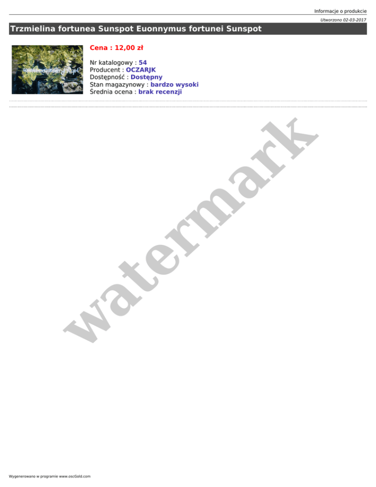 Informacje o produkcie Utworzono 02-03-2017 Trzmielina fortunea Sunspot Euonnymus fortunei Sunspot Cena : 12,00 zł w at er m ar k Nr katalogowy : 54 Producent : OCZARJK Dostępność : Dostępny Stan magazynowy : bardzo wysoki Średnia ocena : brak recenzji Wygenerowano w programie www.oscGold.com
