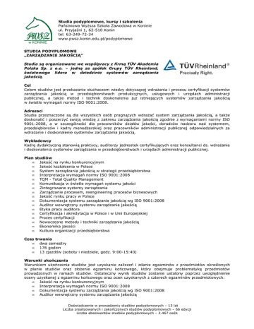 Studia podyplomowe, kursy i szkolenia Państwowa Wyższa Szkoła Zawodowa w Koninie ul. Przyjaźni 1, 62-510 Konin tel. 63-249-72-34 www.pwsz.konin.edu.pl/podyplomowe STUDIA PODYPLOMOWE „ZARZĄDZANIE JAKOŚCIĄ” Studia są organizowane we współpracy z firmą TÜV Akademia Polska Sp. z o.o. – jedną ze spółek Grupy TÜV Rheinland, światowego lidera w dziedzinie systemów zarządzania jakością. Cel Celem studiów jest przekazanie słuchaczom wiedzy dotyczącej wdrażania i procesu certyfikacji systemów zarządzania jakością w przedsiębiorstwach produkcyjnych, usługowych i urzędach administracji publicznej, a także metod i technik doskonalenia już istniejących systemów zarządzania jakością w świetle wymagań normy ISO 9001:2008. Adresaci Studia przeznaczone są dla wszystkich osób pragnących wdrażać system zarządzania jakością, a także doskonalić i poszerzyć swoją wiedzę z zakresu zarządzania jakością zgodnie z wymaganiami normy ISO 9001:2008, a w szczególności dla pracowników działów jakości, doradców nadzoru nad systemem, przedsiębiorców i kadry menedżerskiej oraz pracowników administracji publicznej odpowiedzialnych za wdrażanie i doskonalenie systemów zarządzania jakością. Wykładowcy Kadrę dydaktyczną stanowią praktycy, auditorzy jednostek certyfikujących oraz konsultanci ds. wdrażania i doskonalenia systemów zarządzania w przedsiębiorstwach i urzędach administracji publicznej. Plan studiów • Jakość na rynku konkurencyjnym • Jakość kształcenia w Polsce • System zarządzania jakością w strategii przedsiębiorstwa • Interpretacja wymagań normy ISO 9001:2008 • TQM - Total Quality Management • Komunikacja w świetle wymagań systemu jakości • Zintegrowane systemy zarządzania • Zarządzanie procesem, reengineering procesów biznesowych • Jakość rynku pracy w Polsce • Dokumentacja systemu zarządzania jakością wg ISO 9001:2008 • Auditor wewnętrzny systemu zarządzania jakością • Etyka pracy auditora • Certyfikacja i akredytacja w Polsce i w Unii Europejskiej • Proces certyfikacji • Nowoczesne metody i techniki zarządzania jakością • Ekonomika jakości • Kultura organizacji przedsiębiorstwa Czas trwania • dwa semestry • 176 godzin • 13 zjazdów (soboty i niedziele, godz. 9:00-15:40) Warunki ukończenia Warunkiem ukończenia studiów jest uzyskanie zaliczeń i zdanie egzaminów z przedmiotów określonych w planie studiów oraz złożenie egzaminu końcowego, który obejmuje problematykę przedmiotów prowadzonych w ramach studiów. Ostateczny wynik studiów zostanie ustalony poprzez uwzględnienie oceny uzyskanej z egzaminu końcowego oraz ocen uzyskanych z czterech egzaminów przedmiotowych: • Jakość na rynku konkurencyjnym • Interpretacja wymagań normy ISO 9001:2008 • Dokumentacja systemu zarządzania jakością wg ISO 9001:2008 • Auditor wewnętrzny systemu zarządzania jakością Doświadczenie w prowadzeniu studiów podyplomowych – 13 lat Liczba zrealizowanych i zakończonych studiów podyplomowych – 66 edycji Liczba absolwentów studiów podyplomowych – 2.467 osób Studia podyplomowe, kursy i szkolenia Państwowa Wyższa Szkoła Zawodowa w Koninie ul. Przyjaźni 1, 62-510 Konin tel. 63-249-72-34 www.pwsz.konin.edu.pl/podyplomowe Absolwenci studiów otrzymają: • świadectwo ukończenia studiów podyplomowych z zakresu zarządzania jakością • certyfikat auditora wewnętrznego systemu zarządzania jakością ISO 9001:2008 wystawiany przez TÜV Akademia Polska Sp. z o.o., • zaświadczenie o umiejętności tworzenia dokumentacji systemowej, • zaświadczenie o znajomości wymagań normy EN-ISO 9001:2008, Absolwenci studiów mogą także przystąpić do egzaminu na Certyfikowanego Specjalistę ds. Jakości. Warunkiem otrzymania certyfikatu jest zdanie egzaminu przeprowadzonego przez TÜV Akademia oraz pokrycie jego kosztów (230 zł/certyfikat). Koszt uczestnictwa około 1600 zł/semestr Doświadczenie w prowadzeniu studiów podyplomowych – 13 lat Liczba zrealizowanych i zakończonych studiów podyplomowych – 66 edycji Liczba absolwentów studiów podyplomowych – 2.467 osób