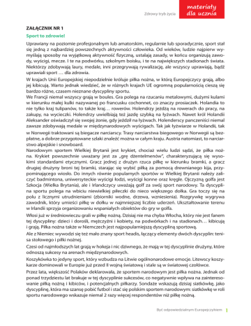 Zdrowy tryb życia materiały dla ucznia ZAŁĄCZNIK NR 1 Sport to zdrowie! Uprawiany na poziomie profesjonalnym lub amatorskim, regularnie lub sporadycznie, sport stał się jedną z najbardziej powszechnych aktywności człowieka. Od wieków, ludzie najpierw wymyślają sposoby na wyjątkową aktywność fizyczną, ustalają zasady, w końcu organizują zawody, wyścigi, mecze. I te na podwórku, szkolnym boisku, i te na największych stadionach świata. Niektórzy zdobywają laury, medale, inni przegrywają rywalizację, ale wszyscy uprawiają, bądź uprawiali sport … dla zdrowia. W krajach Unii Europejskiej niepodzielnie króluje piłka nożna, w którą Europejczycy grają, albo jej kibicują. Warto jednak wiedzieć, że w różnych krajach UE ogromną popularnością cieszą się bardzo różne, czasem nieznane dyscypliny sportu. We Francji niemal wszyscy grają w boules. Gra polega na rzucaniu metalowymi, dużymi kulami w kierunku małej kulki nazywanej po francusku cochonnet, co znaczy prosiaczek. Holandia to nie tylko kraj tulipanów, to także kraj… rowerów. Holendrzy jeżdżą na rowerach do pracy, na zakupy, na wycieczki. Holendrzy uwielbiają też jazdę szybką na łyżwach. Nawet król Holandii Aleksander oświadczył się swojej żonie, gdy jeździł na łyżwach. Holenderscy panczeniści niemal zawsze zdobywają medale w międzynarodowych wyścigach. Tak jak łyżwiarze w Holandii, tak w Norwegii traktowani są biegacze narciarscy. Trasy narciarstwa biegowego w Norwegii są bezpłatne, a dobrze przygotowane szlaki znaleźć można w całym kraju. Austria natomiast, to narciarstwo alpejskie i snowboard. Narodowym sportem Wielkiej Brytanii jest krykiet, chociaż wielu ludzi sądzi, że piłka nożna. Krykiet powszechnie uważany jest za „grę dżentelmenów”, charakteryzującą się wysokimi standardami etycznymi. Gracz jednej z drużyn rzuca piłkę w kierunku bramki, a gracz drugiej drużyny broni tej bramki, starając się wybić piłką za pomocą drewnianego kija, przypominającego wiosło. Do innych równie popularnych sportów w Wielkiej Brytanii należy zaliczyć badmintona, uniwersyteckie wyścigi łodzi, wyścigi konne oraz kręgle. Ojczyzną golfa jest Szkocja (Wielka Brytania), ale i Irlandczycy uważają golf za swój sport narodowy. Ta dyscyplina sportu polega na wbiciu niewielkiej piłeczki do nieco większego dołka. Gra toczy się na polu z licznymi utrudnieniami (zbiorniki wodne, drzewa, wzniesienia). Rozgrywkę wygrywa zawodnik, który umieści piłkę w dołku w najmniejszej liczbie uderzeń. Ukształtowanie terenu w Irlandii sprzyja organizowaniu wspaniałych obiektów do gry w golfa. Włosi już w średniowieczu grali w piłkę nożną. Dzisiaj nie ma chyba Włocha, który nie jest fanem tej dyscypliny: dzieci i dorośli, mężczyźni i kobiety, na podwórkach i na stadionach… kibicują i grają. Piłka nożna także w Niemczech jest najpopularniejszą dyscypliną sportową. Ale z Niemiec wywodzi się też mało znany sport headis, łączący elementy dwóch dyscyplin: tenisa stołowego i piłki nożnej. Czesi od najmłodszych lat grają w hokeja i nic dziwnego, że mają w tej dyscyplinie drużyny, które odnoszą sukcesy na arenach międzynarodowych. Koszykówka to jedyny sport, który wzbudza na Litwie ogólnonarodowe emocje. Litewscy koszykarze dominowali w Europie już przed II wojną światową i stale są w światowej czołówce. Przez lata, większość Polaków deklarowała, że sportem narodowym jest piłka nożna. Jednak od ponad trzydziestu lat brakuje w tej dyscyplinie sukcesów, co negatywnie wpływa na zainteresowanie piłką nożną i kibiców, i potencjalnych piłkarzy. Sondaże wskazują dzisiaj siatkówkę, jako dyscyplinę, która ma szansę pobić futbol i stać się polskim sportem narodowym: siatkówkę w roli sportu narodowego wskazuje niemal 2 razy więcej respondentów niż piłkę nożną. Być odpowiedzialnym Europejczykiem 1 materiały dla ucznia Zdrowy tryb życia ZAŁĄCZNIK NR 2 Przeanalizuj poniższe informacje. Na podstawie wybranych (najbardziej według Ciebie interesujących) informacji ułóż zadanie tekstowe z matematyki. Informacje: 1. Żyjemy średnio coraz dłużej: w okresie od lat pięćdziesiątych XX w. do 2010 r. średnia długość życia w UE wzrosła z 65 do 80 lat. 2. Akademicki Szpital Kliniczny we Wrocławiu pozyskał 85 milionów zł z Unii Europejskiej oraz 15 milionów z Ministerstwa Zdrowia na budowę Kliniki Transplantacji Szpiku, Onkologii i Hematologii Dziecięcej. 3. Medycyna coraz lepiej radzi sobie z zawałami serca: między 2000 a 2009 r. o połowę spadł wskaźnik umieralności osób przyjętych do szpitala w wyniku zawału serca. 4. W krajach UE liczba lekarzy przypadających na liczbę mieszkańców wzrosła średnio z 2,9 na tysiąc osób w 2000 r. do 3,4 w 2010 r. 5. Nakłady na leczenie chorób przewlekłych w UE wynoszą 700 mld euro, czyli 75% nakładów ogólnie na opiekę zdrowotną. 6. UE uzupełnia i wspiera działania państw członkowskich w czterech najważniejszych dziedzinach, którymi są: • propagowanie zdrowego trybu życia oraz profilaktyka zdrowotna, • ochrona obywateli przed zagrożeniami mającymi wymiar międzynarodowy • innowacyjne i zrównoważone systemy opieki zdrowotnej, • bezpieczniejsza opieka zdrowotna wyższej jakości. Fundusz UE na wspieranie tych działań w latach 2014–2020 wynosi 446 mln euro. 7. 37% Europejczyków co najmniej raz w życiu oddało krew. Dawstwo krwi, tkanek, komórek i narządów ma pierwszorzędne znaczenie w leczeniu wielu poważnych i śmiertelnych chorób. W 2011 r. w UE dokonano 30 tys. przeszczepów narządów. 8. Jeśli podczas pobytu w innym kraju UE nagle zachorujemy i powinniśmy pójść do lekarza, nie musimy skracać pobytu, żeby leczyć się w kraju rodzinnym. Wystarczy, że pokażemy zagranicznemu lekarzowi swoją europejską kartę ubezpieczenia zdrowotnego (EKUZ). W 2010 roku 20 mln Europejczy