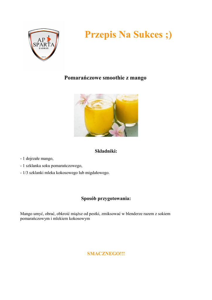 Przepis Na Sukces ;) Pomarańczowe smoothie z mango Składniki: - 1 dojrzałe mango, - 1 szklanka soku pomarańczowego, - 1/3 szklanki mleka kokosowego lub migdałowego. Sposób przygotowania: Mango umyć, obrać, obkroić miąższ od pestki, zmiksować w blenderze razem z sokiem pomarańczowym i mlekiem kokosowym SMACZNEGO!!!