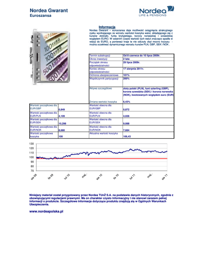 Nordea Gwarant Euroszansa Informacja Nordea Gwarant – euroszansa daje możliwość osiągnięcia atrakcyjnego zysku wynikającego ze wzrostu wartości koszyka walut, składającego się z kursów złotówki, funta brytyjskiego, korony norweskiej i szwedzkiej względem EURO. W ostatnim czasie wartość tych walut znacząco spadła w relacji do EURO, a ponieważ kraje te nie odczuły zbyt mocno kryzysu można oczekiwać dynamicznego wzrostu kursów PLN, GBP, SEK i NOK . Wartość początkowa dla EUR/GBP 0,849 Wartość początkowa dla EUR/PLN 4,109 Wartość początkowa dla EUR/SEK 10,298 Wartość początkowa dla EUR/NOK 8,680 Wartość początkowa koszyka 100 Termin subskrypcji Okres inwestycji Początek okresu odpowiedzialności Koniec okresu odpowiedzialności Ochrona ubezpieczeniowa Współczynnik partycypacji Od 8 czerwca do 10 lipca 2009r. 2 lata 29 lipca 2009r. Aktywa szczegółowo złoty polski (PLN), funt szterling (GBP), korona szwedzka (SEK) i korona norweska (NOK), kwotowanych względem euro (EUR) Zmiana wartości koszyka Wartość obecna dla EUR/GBP 6,43% Wartość obecna dla EUR/PLN Wartość obecna dla EUR/SEK Wartość obecna dla EUR/NOK Aktualna wartość koszyka 17 sierpnia 2011r. 101% 200% 0,872 4,026 9,088 7,684 106,43 130 120 110 100 90 80 70 Niniejszy materiał został przygotowany przez Nordea TUnŻ S.A. na podstawie danych historycznych, zgodnie z obowiązującymi regulacjami prawnymi. Ma on charakter czysto informacyjny i nie stanowi zarazem pełnej informacji o produkcie. Szczegółowe informacje dotyczące produktu znajdują się w Ogólnych Warunkach Ubezpieczenia. www.nordeapolska.pl