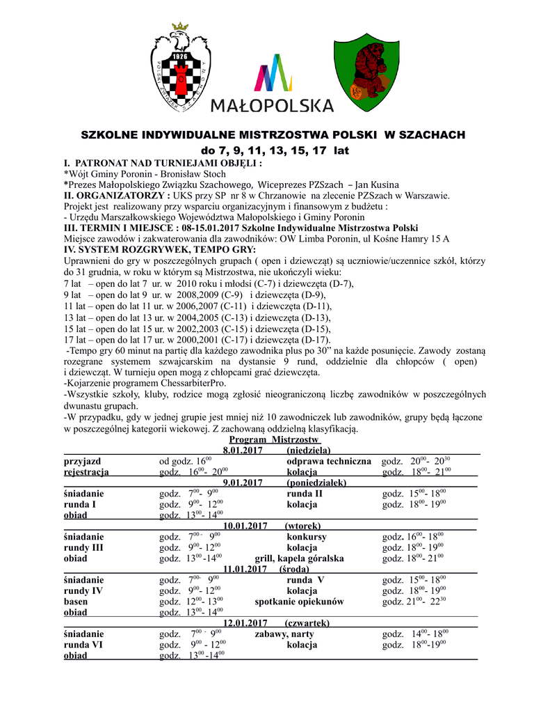 SZKOLNE INDYWIDUALNE MISTRZOSTWA POLSKI W SZACHACH do 7, 9, 11, 13, 15, 17 lat I. PATRONAT NAD TURNIEJAMI OBJĘLI : *Wójt Gminy Poronin - Bronisław Stoch *Prezes Małopolskiego Związku Szachowego, Wiceprezes PZSzach – Jan Kusina II. ORGANIZATORZY : UKS przy SP nr 8 w Chrzanowie na zlecenie PZSzach w Warszawie. Projekt jest realizowany przy wsparciu organizacyjnym i finansowym z budżetu : - Urzędu Marszałkowskiego Województwa Małopolskiego i Gminy Poronin III. TERMIN I MIEJSCE : 08-15.01.2017 Szkolne Indywidualne Mistrzostwa Polski Miejsce zawodów i zakwaterowania dla zawodników: OW Limba Poronin, ul Kośne Hamry 15 A IV. SYSTEM ROZGRYWEK, TEMPO GRY: Uprawnieni do gry w poszczególnych grupach ( open i dziewcząt) są uczniowie/uczennice szkół, którzy do 31 grudnia, w roku w którym są Mistrzostwa, nie ukończyli wieku: 7 lat – open do lat 7 ur. w 2010 roku i młodsi (C-7) i dziewczęta (D-7), 9 lat – open do lat 9 ur. w 2008,2009 (C-9) i dziewczęta (D-9), 11 lat – open do lat 11 ur. w 2006,2007 (C-11) i dziewczęta (D-11), 13 lat – open do lat 13 ur. w 2004,2005 (C-13) i dziewczęta (D-13), 15 lat – open do lat 15 ur. w 2002,2003 (C-15) i dziewczęta (D-15), 17 lat – open do lat 17 ur. w 2000,2001 (C-17) i dziewczęta (D-17). -Tempo gry 60 minut na partię dla każdego zawodnika plus po 30” na każde posunięcie. Zawody zostaną rozegrane systemem szwajcarskim na dystansie 9 rund, oddzielnie dla chłopców ( open) i dziewcząt. W turnieju open mogą z chłopcami grać dziewczęta. -Kojarzenie programem ChessarbiterPro. -Wszystkie szkoły, kluby, rodzice mogą zgłosić nieograniczoną liczbę zawodników w poszczególnych dwunastu grupach. -W przypadku, gdy w jednej grupie jest mniej niż 10 zawodniczek lub zawodników, grupy będą łączone w poszczególnej kategorii wiekowej. Z zachowaną oddzielną klasyfikacją. Program Mistrzostw 8.01.2017 (niedziela) przyjazd od godz. 1600 odprawa techniczna godz. 2000- 2030 00 00 rejestracja godz. 16 - 20 kolacja godz. 1800- 2100 9.01.2017 (poniedziałek) śniadanie godz. 700- 900 runda II godz. 1500- 1800 00 00 runda I godz. 9 - 12 kolacja godz. 1800- 1900 00 00 obiad godz. 13 - 14 10.01.2017 (wtorek) śniadanie godz. 700 - 900 konkursy godz. 1600- 1800 00 00 rundy III godz. 9 - 12 kolacja godz. 1800- 1900 00 00 obiad godz. 13 -14 grill, kapela góralska godz. 1800- 2100 11.01.2017 (środa) śniadanie godz. 700- 900 runda V godz. 1500- 1800 00 00 rundy IV godz. 9 - 12 kolacja godz. 1800- 1900 00 00 basen godz. 12 - 13 spotkanie opiekunów godz. 2100- 2230 00 00 obiad godz. 13 - 14 12.01.2017 (czwartek) śniadanie godz. 700 - 900 zabawy, narty godz. 1400- 1800 00 00 runda VI godz. 9 - 12 kolacja godz. 1800-1900 00 00 obiad godz. 13 -14 13.01.2017 (piątek) godz. 700 - 900 turniej błyskawiczny godz. 1500- 1700 00 00 godz. 9 - 12 kolacja godz. 1800-1900 00 00 godz. 13 -14 14.01.2017 (sobota) śniadanie godz. 700 - 900 zabawy na śniegu godz. 1400- 1800 00 00 runda VIII godz. 9 - 12 kolacja godz. 1800- 1900 00 00 obiad godz. 13 -14 15.01.2017 (niedziela) śniadanie godz. 700 - 900 runda IX godz. 800 - 1100 obiad godz. 1200 - 1300 zakończenie godz. 1330- 1400 V. ZAKWATEROWANIE I WYŻYWIENIE Zgłoszenia dotyczące zakwaterowania i wyżywienia należy kierować drogą elektroniczną e-mail : [email protected] . Dyrektor zawodów : Marian Sadzikowski tel. 606704871. Wszystkie pokoje o wysokim standardzie i estetyce (łazienka, WC, TV, Internet). Wyśmienite, urozmaicone jedzenie: śniadanie i kolacja w formie stołu szwedzkiego, obiad podawany. Kawa, herbata, napoje dla zakwaterowanych w OW Limba gratis 24h. Koszt pobytu (zakwaterowania i wyżywienia) za osobodzień : • w pokojach 2-5 osobowych to 85 zł ( 7 dni 595 zł). • w pokojach 1 – osobowych 115 zł ( 7 dni 805 zł ). • Miejsce turnieju i noclegów można obejrzeć na stronie: www.limba-poronin.pl . Rezerwacja według kolejności zgłoszeń do 20.12.2016 r. lub do wyczerpania wolnych miejsc (wymagana zaliczka 50 zł od osoby). Opłatę za wyżywienie i zakwaterowanie należy wnosić przelewem na konto UKS przy SP 8 Chrzanów, nr 54 1050 1302 1000 0022 9083 9964 w ING O/Chrzanów lub gotówką w dniu przyjazdu (po uzgodnieniu z organizatorem). VI. WARUNKI UCZESTNICTWA i OPŁATY Do dnia 20.12.2016 r. należy przesłać zgłoszenie z danymi (nazwisko i imię, szkoła, klub, data urodzenia, kategoria szachowa, adres i kontakt) do dyrektora zawodów Mariana Sadzikowskiego tel. 606704871 e-mail [email protected] . Wpisowe w kwocie 60 zł (30 zł - opłata organizacyjna i 30 zł - opłata startowa) oraz 20 zł opłaty rankingowej, łącznie 80 zł od zawodnika należy wpłacić do 20.12.2016 r. na konto PZSzach nr : 34 1060 0076 0000 3200 0071 8184 Bank BPH S.A. Lista zgłoszonych zawodników będzie na bieżąco uzupełniana na stronie: http://www.chessarbiter.com. Wpisu na stronie dokonuje wyłącznie sędzia główny. Spełnienie wszystkich wymogów organizacyjnych będzie oznaczone przez OK. VII. NAGRODY I WYRÓŻNIENIA : Miejsca I - VI puchary i nagrody rzeczowe. Oryginalne puchary dla wszystkich uczestników zamieszkałych u organizatora ( sponsor OW Limba). Dla każdego uczestnika dyplomy, nagrody, upominki. Zgodnie z regulaminem PZSzach Mistrzowie Polski Szkół mają dofinansowanie kosztów udziału w Mistrzostwach Świata Szkół a Wicemistrzowie w Mistrzostwach Europy. Trzy specjalne trofea otrzymają szkoły, z których przynajmniej 5 zawodników uczestniczyć będzie w co najmniej dwóch grupach wiekowych. O miejscach decyduje ilość punktów zdobytych przez 5 najlepszych zawodników. W przypadku równej ilości pkt. decydują lokaty najlepszych zawodników. Nagrody specjalne finansowe dla trenerów, nauczycieli. śniadanie runda VII obiad VIII. UWAGI KOŃCOWE: Opiekę nad uczestnikami sprawują pełnoletni opiekunowie. Zachowanie niezgodne z etyką sportowca i regulaminem obiektu będzie karane wydaleniem z ośrodka bez zwrotu kosztów pobytu. Za u