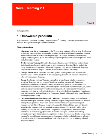 novdocx (pl) 17 September 2009 Novell Teaming 2.1 Novell ® 16 lutego 2010 r. 1 Omówienie produktu W porównaniu z systemem Teaming 2.0 system Novell® Teaming 2.1 oferuje wiele usprawnień zarówno dla użytkowników, jak i administratorów: Dla użytkowników Ulepszenia w edytorze stron docelowych: W nowym, wygodnym edytorze stron docelowych są dostępne kontenery (lista w przypadku układu z pojedynczą kolumną lub tabela w układzie wielokolumnowym), do których można przeciągać i w których można upuszczać foldery, pozycje folderów, grafiki itp. Po utworzeniu początkowej wersji strony docelowej można łatwo modyfikować jej wygląd. Źródło systemu Teaming: Nowe źródło systemu Teaming jest wyświetlane w niewielkim oknie i zawiera ogłoszenia publikowane w witrynie systemu Teaming. Można wyświetlać cztery rodzaje nowych ogłoszeń: informacje dotyczące całej witryny, informacje dotyczące zespołów użytkownika, miejsca śledzone przez użytkownika oraz mikroblogi. Obsługa filmów wideo z serwisu YouTube: System Teaming umożliwia wyświetlanie filmów wideo z serwisu YouTube* w dowolnej pozycji, folderze lub obszarze roboczym w całej witrynie systemu Teaming. Dostęp do witryny systemu Teaming z urządzeń przenośnych: Użytkownicy mogą uzyskiwać dostęp do witryny systemu Teaming z urządzeń przenośnych. Za pomocą urządzenia przenośnego użytkownicy mogą przeprowadzać proste wyszukiwania w celu odnalezienia osób i miejsc. Mogą również korzystać z zapisanych wyszukiwań (nie jest jednak możliwe zapisywanie nowych wyszukiwań na urządzeniach przenośnych). Urządzenia przenośne pozwalają na wyświetlanie blogów, witryn wiki, dyskusji, kalendarzy i zadań oraz stron Moje zespoły, Moje ulubione oraz Co nowego. Istnieje także możliwość modyfikowania stanów przepływów pracy. Cofanie usunięcia obszarów roboczych i folderów: Użytkownicy mogą cofać usunięcie obszarów roboczych, folderów i pozycji folderów. Na głównym pasku bocznym i na paskach menu jest dostępna ikona Kosz, która umożliwia wyświetlenie wszystkich usuniętych elementów w obrębie wybranego obszaru roboczego lub folderu. Dzięki temu użytkownicy mogą określać elementy, których usunięcie zostanie cofnięte. Użytkownicy widzą tylko elementy, do których mają uprawnienia, i mogą cofać usunięcie tylko w odniesieniu do elementów, do których mają uprawnienia do cofania usunięcia. Usunięte elementy są uwzględniane w przydziałach danych, dopóki nie zostaną zlikwidowane. Użytkownicy mogą korzystać z wyszukiwania zaawansowanego do znajdowania i przeglądania usuniętych przez siebie elementów, jeśli muszą zlikwidować treść, aby nie przekroczyć określonego dla nich przydziału danych. Novell Teaming 2.1 1 które dotyczą właściciela tego folderu, niezależnie od obszaru roboczego w witrynie systemu Teaming, w którym zdarzenie zostało opublikowane. Ulepszenia dotyczące zadań: W folderze Zadanie można wyświetlić wszystkie zadania przypisane do właściciela tego folderu, niezależnie od obszaru roboczego w witrynie systemu Teaming, w którym zadanie zostało opublikowane. Dla administratorów Przydziały danych dla użytkowników/pozycji: Administrator systemu Teaming może ustawić dla każdego z użytkowników maksymalny rozmiar nagromadzonych załączników i wersji plików w dowolnej pozycji folderu. W momencie osiągnięcia punktu krytycznego (procentu przydziału danych przypadającego na określoną pozycję folderu) jest wyświetlane ostrzeżenie. Po wyczerpaniu całego przydziału danych dla określonej pozycji folderu użytkownicy nie mogą tworzyć dodatkowych załączników lub wersji plików w tej pozycji folderu, dopóki nie zwolnią miejsca przez usunięcie załączników i wersji plików w tej pozycji. Administratorzy mogą przypisywać przydziały danych do poszczególnych użytkowników albo do grup użytkowników, co pozwala łatwo przypisać ten sam przydział danych do wielu użytkowników. Administracyjne likwidowanie obszarów roboczych i folderów: Ponieważ usunięte elementy są uwzględniane w przydziałach danych przypisanych do użytkowników, administrator systemu Teaming może podjąć decyzję o zlikwidowaniu wszystkich usuniętych elementów w dowolnej części witryny systemu Teaming, aby uzyskać dodatkowe miejsce do przechowywania danych. Eksportowanie/importowanie obszarów roboczych/folderów: Administrator systemu Teaming może wyeksportować obszary robocze, foldery i pozycje folderów, a następnie zaimportować je do innego systemu Teaming. Proces eksportowania obejmuje wszystkie treści związane z eksportowanym obszarem roboczym, folderem lub pozycją folderu, np. użytkowników, grupy, członków zespołu, role, formularze niestandardowe, strony docelowe, przepływy pracy, niestandardowe strony JSP oraz proste adresy URL. Proces importowania ma na celu uzgodnienie importowanych danych z danymi istniejącymi w docelowej witrynie systemu Teaming. Zarządzanie rozszerzeniami oprogramowania: Po zalogowaniu do witryny systemu Teaming administrator może wdrażać rozszerzenia oprogramowania bez konieczności ręcznego edytowania pliku właściwości systemu Teaming (ssf-ext.properties). Istnieje również możliwość wyświetlania i usuwania istniejących rozszerzeń oprogramowania Teaming na stronie Zarządzanie rozszerzeniami w witrynie systemu Teaming. 2 Wymagania systemu Teaming Wymagania systemowe dostępne są w Przewodniku instalacji systemu Teaming 2.1 w witrynie dokumentacji systemu Novell Teaming 2.1 (http://www.novell.com/documentation/teaming21). 3 Instrukcja instalacji w systemie Linux 1 Należy upewnić się, że docelowy serwer linuksowy*, gdzie zainstalowany ma być system Novell Teaming, spełnia wymagania systemowe. 2 Jeśli na serwerze tym uruchomiony jest serwer HTTP, należy go zatrzymać, a najlepiej wyłączyć. 2 Novell Teaming 2.1 novdocx (pl) 17 September 2009 Ud