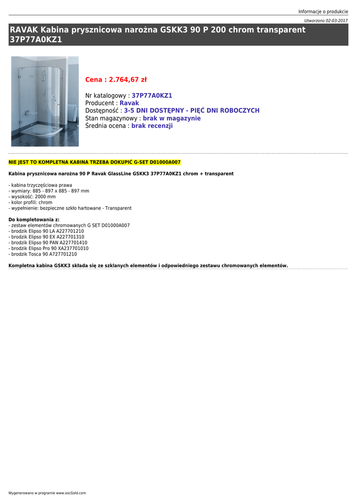 Informacje o produkcie Utworzono 02-03-2017 RAVAK Kabina prysznicowa narożna GSKK3 90 P 200 chrom transparent 37P77A0KZ1 Cena : 2.764,67 zł Nr katalogowy : 37P77A0KZ1 Producent : Ravak Dostępność : 3-5 DNI DOSTĘPNY - PIĘĆ DNI ROBOCZYCH Stan magazynowy : brak w magazynie Średnia ocena : brak recenzji NIE JEST TO KOMPLETNA KABINA TRZEBA DOKUPIĆ G-SET D01000A007 Kabina prysznicowa narożna 90 P Ravak GlassLine GSKK3 37P77A0KZ1 chrom + transparent - kabina trzyczęściowa prawa - wymiary: 885 - 897 x 885 - 897 mm - wysokość: 2000 mm - kolor profili: chrom - wypełnienie: bezpieczne szkło hartowane - Transparent Do kompletowania z: - zestaw elementów chromowanych G SET D01000A007 - brodzik Elipso 90 LA A227701210 - brodzik Elipso 90 EX A227701310 - brodzik Elipso 90 PAN A227701410 - brodzik Elipso Pro 90 XA237701010 - brodzik Tosca 90 A727701210 Kompletna kabina GSKK3 składa się ze szklanych elementów i odpowiedniego zestawu chromowanych elementów. Wygenerowano w programie www.oscGold.com