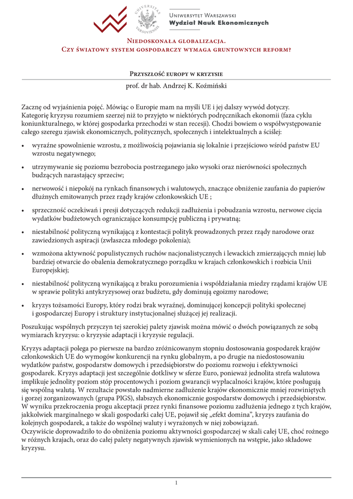 Niedoskonała globalizacja. Czy światowy system gospodarczy wymaga gruntownych reform? Przyszłość europy w kryzysie prof. dr hab. Andrzej K. Koźmiński Zacznę od wyjaśnienia pojęć. Mówiąc o Europie mam na myśli UE i jej dalszy wywód dotyczy. Kategorię kryzysu rozumiem szerzej niż to przyjęto w niektórych podręcznikach ekonomii (faza cyklu koniunkturalnego, w której gospodarka przechodzi w stan recesji). Chodzi bowiem o współwystępowanie całego szeregu zjawisk ekonomicznych, politycznych, społecznych i intelektualnych a ściślej: • wyraźne spowolnienie wzrostu, z możliwością pojawiania się lokalnie i przejściowo wśród państw EU wzrostu negatywnego; • utrzymywanie się poziomu bezrobocia postrzeganego jako wysoki oraz nierówności społecznych budzących narastający sprzeciw; • nerwowość i niepokój na rynkach finansowych i walutowych, znaczące obniżenie zaufania do papierów dłużnych emitowanych przez rządy krajów członkowskich UE ; • sprzeczność oczekiwań i presji dotyczących redukcji zadłużenia i pobudzania wzrostu, nerwowe cięcia wydatków budżetowych ograniczające konsumpcję publiczną i prywatną; • niestabilność polityczną wynikającą z kontestacji polityk prowadzonych przez rządy narodowe oraz zawiedzionych aspiracji (zwłaszcza młodego pokolenia); • wzmożona aktywność populistycznych ruchów nacjonalistycznych i lewackich zmierzających mniej lub bardziej otwarcie do obalenia demokratycznego porządku w krajach członkowskich i rozbicia Unii Europejskiej; • niestabilność polityczną wynikającą z braku porozumienia i współdziałania miedzy rządami krajów UE w sprawie polityki antykryzysowej oraz budżetu, gdy dominują egoizmy narodowe; • kryzys tożsamości Europy, który rodzi brak wyraźnej, dominującej koncepcji polityki społecznej i gospodarczej Europy i struktury instytucjonalnej służącej jej realizacji. Poszukując wspólnych przyczyn tej szerokiej palety zjawisk można mówić o dwóch powiązanych ze sobą wymiarach kryzysu: o kryzysie adaptacji i kryzysie regulacji. Kryzys adaptacji polega po pierwsze na bardzo zróżnicowanym stopniu dostosowania gospodarek krajów członkowskich UE do wymogów konkurencji na rynku globalnym, a po drugie na niedostosowaniu wydatków państw, gospodarstw domowych i przedsiębiorstw do poziomu rozwoju i efektywności gospodarek. Kryzys adaptacji jest szczególnie dotkliwy w sferze Euro, ponieważ jednolita strefa walutowa implikuje jednolity poziom stóp procentowych i poziom gwarancji wypłacalności krajów, które posługują się wspólną walutą. W rezultacie powstało nadmierne zadłużenie krajów ekonomicznie mniej rozwiniętych i gorzej zorganizowanych (grupa PIGS), słabszych ekonomicznie gospodarstw domowych i przedsiębiorstw. W wyniku przekroczenia progu akceptacji przez rynki finansowe poziomu zadłużenia jednego z tych krajów, jakkolwiek marginalnego w skali gospodarki całej UE, pojawił się „efekt domina”, kryzys zaufania do kolejnych gospodarek, a także do wspólnej waluty i wyrażonych w niej zobowiązań. Oczywiście doprowadziło to do obniżenia poziomu aktywności gospodarczej w skali całej UE, choć rożnego w różnych krajach, oraz do całej palety negatywnych zjawisk wymienionych na wstępie, jako składowe kryzysu. 1 Niedoskonała globalizacja. Czy światowy system gospodarczy wymaga gruntownych reform? Przede wszystkim jednak pojawiła się szczególnie niebezpieczna dla gospodarki niepewność co do przyszłości. UE przestała być postrzegana przez rynki i przez własnych obywateli jako „gospodarka przyszłości”, jako „European Dream”: wzór integracji gospodarczej skutecznie przeprowadzonej w ramach jednego z kluczowych regionów świata. Taka niepewność w oczywisty sposób zagraża przyszłemu rozwojowi. Adaptacja musi się dokonać poprzez zwiększenie konkurencyjności i ograniczenie deficytu. Musi to nieuchronnie oznaczać przynajmniej okresowe obniżenie standardu życia niektórych grup społecznych w niektórych krajach. Ze szczególnie silnym oporem (zwłaszcza w mniej zadłużonych i szybciej rozwijających się krajach) spotyka się nieuniknione w gruncie rzeczy w ramach logiki jednolitego obszaru walutowego „uwspólnotowienie” długu czyli odpowiedzialność „oszczędnych i gospodarnych” za długi „lekkomyślnych i rozrzutnych”. Ci ostatni musza jednak w zamian za pomoc zaakceptować oszczędnościowy i proefektywnościowy reżym. Może to spowodować radykalizację i destabilizację polityczną zarówno po jednej jak i po drugiej stronie. Ten kryzys zaufania obnażył podstawową słabość ekonomicznej architektury UE, a strefy Euro w szczególności: słabość, a właściwie brak efektywnego systemu regulacji gospodarki UE jako całości zdolnego przeciwdziałać kryzysowi adaptacji. Chodzi o instytucje, procedury i zasoby (głownie, choć nie wyłącznie finansowe) pomyślane w celu przeciwdziałania nadmiernemu zadłużeniu, stabilizacji, konkurencyjności i płynności rynków (produktów, usług, kapitału i pracy) oraz promowania wzrostu i wyrównywania różnic miedzy krajami członkowskimi. Innymi słowy chodzi tu o swego rodzaju „europejski rząd gospodarczy”, europejski bank centralny zdolny do działania jako „kredytodawca ostatniej szansy” zapewniający płynność na rynkach oraz europejski nadzór finansowy regulujący działanie instytucji finansowych oraz przeciwdziałający tworzeniu się kolejnych „baniek spekulacyjnych”. Oczywiście można sobie wyobrazić obniżenie ogólnego poziomu wydatków poprzez „podatek inflacyjny”. Nadmierna kreacja pieniądza z myślą o pobudzeniu gospodarki może do tego doprowadzić. Jest to jednak najgorszy możliwy scenariusz, ponieważ stwarza realne zagrożenie uruchomienia niekontrolowanych procesów ekonomicznych, politycznych i społecznych. Na szczęście Niemcy, którzy w europejskim systemie fina