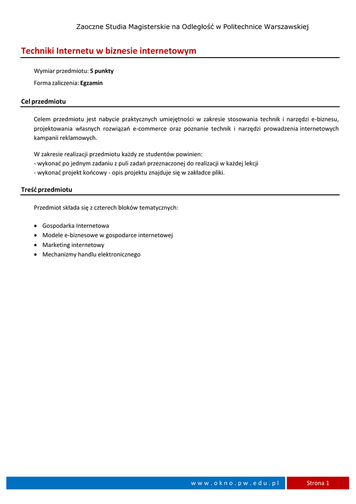 Zaoczne Studia Magisterskie na Odległość w Politechnice Warszawskiej Techniki Internetu w biznesie internetowym Wymiar przedmiotu: 5 punkty Forma zaliczenia: Egzamin Cel przedmiotu Celem przedmiotu jest nabycie praktycznych umiejętności w zakresie stosowania technik i narzędzi e-biznesu, projektowania własnych rozwiązań e-commerce oraz poznanie technik i narzędzi prowadzenia internetowych kampanii reklamowych. W zakresie realizacji przedmiotu każdy ze studentów powinien: - wykonać po jednym zadaniu z puli zadań przeznaczonej do realizacji w każdej lekcji - wykonać projekt końcowy - opis projektu znajduje się w zakładce pliki. Treść przedmiotu Przedmiot składa się z czterech bloków tematycznych: Gospodarka Internetowa Modele e-biznesowe w gospodarce internetowej Marketing internetowy Mechanizmy handlu elektronicznego www.okno.pw.edu.pl Strona 1