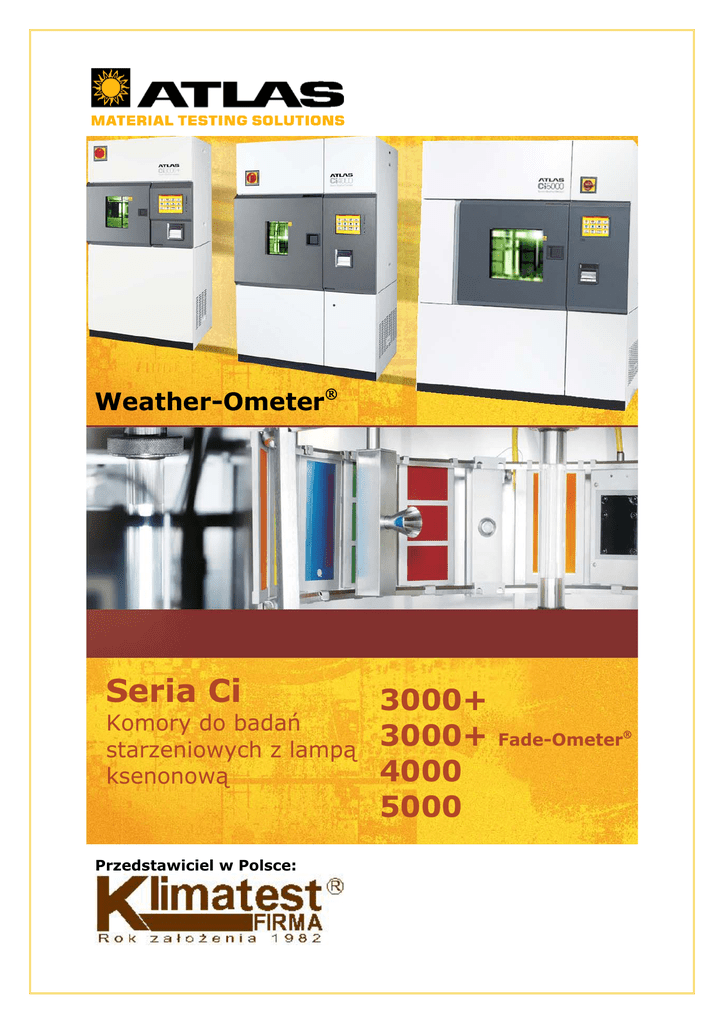 Weather-Ometer® Seria Ci Komory do badań starzeniowych z lampą ksenonową Przedstawiciel w Polsce: 3000+ 3000+ 4000 5000 Fade-Ometer® Komory Weather-Ometer® serii Ci® są nowoczesnymi, kompletnymi urządzeniami do kompleksowych badań starzeniowych z symulacją światła słonecznego i innych warunków klimatycznych. Zastosowanie najnowszych cyfrowych systemów sterowania oraz zaawansowanych zdobyczy techniki z dziedziny optyki gwarantuje uzyskanie rzetelnych wyników badań w prosty sposób. Urządzenia serii Ci® dzięki temu, że spełniają większość światowych norm, znajdują zastosowanie w wielu gałęziach przemysłu m.in.: tekstylnym, motoryzacyjnym, farb i powłok lakierniczych oraz tworzyw sztucznych. Duży, kolorowy dotykowy panel sterowania pełni wiele funkcji m.in.: • Bezpośrednie programowanie i regulacja natężeniem światła • Bezpośrednie programowanie i regulacja temperaturą czarnego wzorca (BPT albo BST) • Bezpośrednie programowanie i regulacja wilgotności • Bezpośrednie programowanie i regulacja temperatury powietrza • Wyświetlanie wiadomości diagnostycznych • 14 fabrycznie zaprogramowanych testów • Możliwość zdefiniowania przez użytkownika 12 programów Źródłem światła jest lampa ksenonowa chłodzona wodą z wbudowanego zbiornika. Moc lampy wynosi od 4500 do 12000 W w zależności od wersji urządzenia. 2 Firma KLIMATEST 2007-05 Obrotowy kosz z możliwością umieszczenia próbek o łącznej powierzchni od 2188 cm2 do 11000 cm2 w zależności od modelu. Komory serii Ci spełniają następujące międzynarodowe normy: ISO AATCC 105-B02 3917 • TM 16-2003 ASTM G151 FLTM B0-116-01 • Ford GME 60292 3414 • GMW JASO M 346 C9 • Marks& Spencer 810 F • MIL STD D47 1431• Renault J1885 • SAE 621-429 • VDA VW PV 1303 • • • • 3 105-B04 • 4892-1 • TM 169 G155 105-B06 4892-2 • TM 16E1998 D6695 11341 • 12040 J2412 • 75202 PV 3930 • J2527 • C9A • J1960 • 621-430 • PV 3929 Tylko Ci5000 oraz Ci4000 Tylko Ci3000+ oraz Ci3000+ Fade-Ometer® Wszystkie poza Ci3000+ Fade-Ometer® Tylko Ci3000+ Fade-Ometer® Firma KLIMATEST 2007-05 Weather-Ometer® serii Ci - Podstawowe własności Typ komory Ci5000 Ci4000 Ci3000+ Ci3000+ Fade-Ometer® Moc palnika ksenonowego[W] Obrotowy kosz do mocowania próbek; łączna maksymalna powierzchnia testowa [cm2] Liczba standardowych uchwytów na próbki (145x70 mm) Automatyczna kontrola natężenia promieniowania przy 340 nm, 420 nm lub w zakresie 300-400 nm Sterownik z ekranem dotykowym LCD Wyświetlanie aktualnych i ustawionych parametrów testu Automatyczna kontrola temperatury czarnego wzorca BST Automatyczna kontrola temperatury powietrza w komorze Automatyczna kontrola prędkości wentylatora Automatyczne zliczanie dawki promieniowania w kJ/m2 Miernik czystości wody Kalibracyjna lampa ksenonowa Automatyczna kontrola wilgotności względnej Bezpośredni odczyt wilgotności w % Wymiary podstawy komory [cm] Dodatkowe chłodzenie powietrza w komorze Rejestrator 6 kanałowy System zbierania danych przez interfejs szeregowy Pomiar temperatury powierzchniowej przy pomocy innego termometru czarnej płytki (DIN lub ASTM) Monitorowanie natężenia promieniowania dodatkowo przy drugiej długości fali 12000 6500 4500 4500 11000 6500 2188 2188 111 65 20 20 • • • • • • • --- • • • • • • • • • • • • • • • • • • • • • • • • • • • • • • • • • • • • 180x302 148x274 115x240 115x240 • • --- --- • • • • • • • • • • • • • • • • Wyposażenie standardowe • Opcja wyposażenia Przedstawicielstwo w Polsce: FIRMA KLIMATEST ul. Pilczycka 198F 54-144 Wrocław Tel. 071 354 06 80 Faks 071 354 06 92 [email protected] www.klimatest.eu 4 ul. Wólczyńska 133 01-919 Warszawa Tel./Faks 022 864 04 35 [email protected] Firma KLIMATEST 2007-05