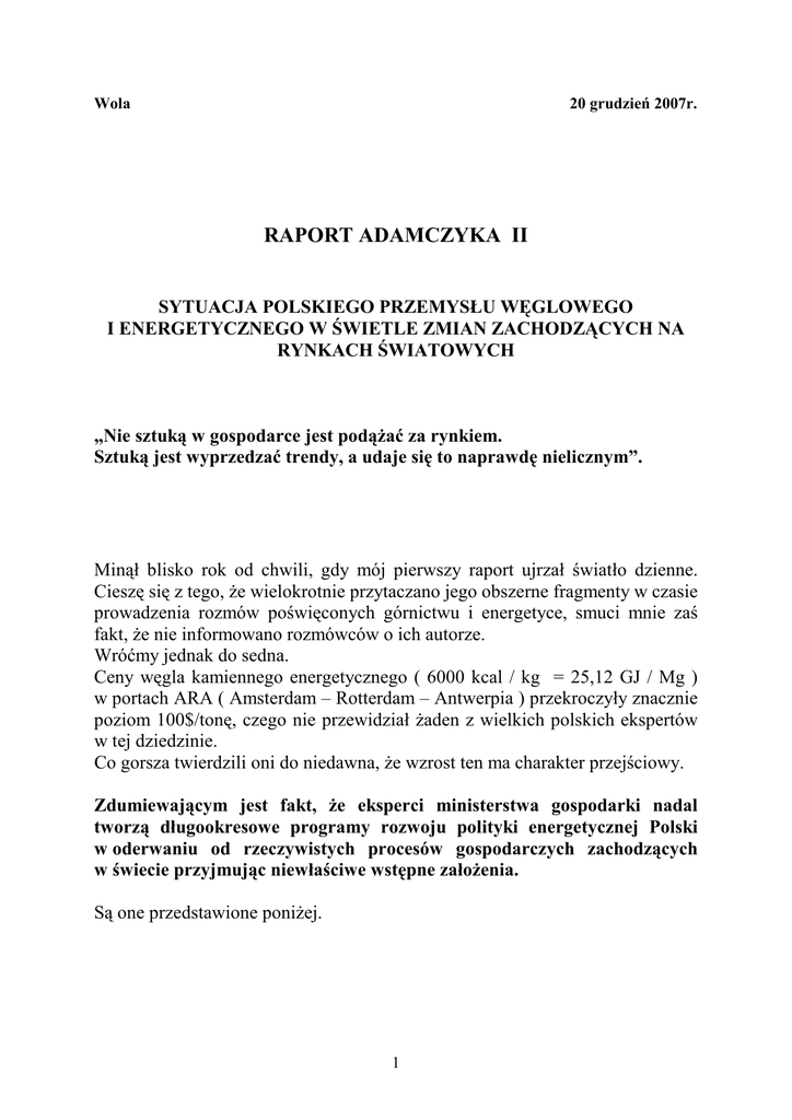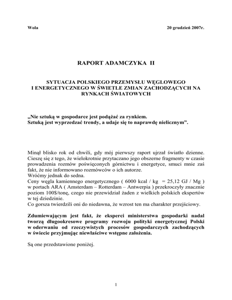 Wola 20 grudzień 2007r. RAPORT ADAMCZYKA II SYTUACJA POLSKIEGO PRZEMYSŁU WĘGLOWEGO I ENERGETYCZNEGO W ŚWIETLE ZMIAN ZACHODZĄCYCH NA RYNKACH ŚWIATOWYCH „Nie sztuką w gospodarce jest podąŜać za rynkiem. Sztuką jest wyprzedzać trendy, a udaje się to naprawdę nielicznym”. Minął blisko rok od chwili, gdy mój pierwszy raport ujrzał światło dzienne. Cieszę się z tego, Ŝe wielokrotnie przytaczano jego obszerne fragmenty w czasie prowadzenia rozmów poświęconych górnictwu i energetyce, smuci mnie zaś fakt, Ŝe nie informowano rozmówców o ich autorze. Wróćmy jednak do sedna. Ceny węgla kamiennego energetycznego ( 6000 kcal / kg = 25,12 GJ / Mg ) w portach ARA ( Amsterdam – Rotterdam – Antwerpia ) przekroczyły znacznie poziom 100$/tonę, czego nie przewidział Ŝaden z wielkich polskich ekspertów w tej dziedzinie. Co gorsza twierdzili oni do niedawna, Ŝe wzrost ten ma charakter przejściowy. Zdumiewającym jest fakt, Ŝe eksperci ministerstwa gospodarki nadal tworzą długookresowe programy rozwoju polityki energetycznej Polski w oderwaniu od rzeczywistych procesów gospodarczych zachodzących w świecie przyjmując niewłaściwe wstępne załoŜenia. Są one przedstawione poniŜej. 1 Ropa naftowa w dol./ boe* Gaz ziemny w dol./ 1000 m3 62,8 Węgiel kamienny w dol./ tonę 65,3 291,3 64,4 61,1 281,5 254,0 54,5 2010 2020 2030 2010 60 2020 *] t = 7,3 boe 2030 2010 2020 2030 źródło: Ministerstwo Gospodarki RYS. 1 : Prognozy cen paliw zawarte w projekcie Polityki Energetycznej Polski do 2030 roku. Przyjęcie niewłaściwych pierwotnych załoŜeń przy ustalaniu prognoz gospodarczych wyrządzi ogromne szkody naszemu krajowi, a koszty realizacji błędnych decyzji spadną na barki podatników. Przypomnę tutaj, Ŝe blisko trzy lata temu rząd Pana Premiera Belki przyjął program pt. „Polityka energetyczna Polski do 2025 roku”, który po 2 latach obowiązywania został odrzucony przez jego następców z powodu nierealności jego wykonania. Program ten przygotowała prawdopodobnie ta sama wymieniona wyŜej grupa ekspertów. Nie moŜe być tak, Ŝe w demokratycznym kraju o kluczowych sprawach mających wpływ na losy polskiej gospodarki decyduje lobby urzędników średniego szczebla chowające się za parawanem anonimowości. Nazwiska ekspertów i autorów programów gospodarczych muszą być znane wszystkim, aby wykluczyć w przyszłości tych, którzy mylili się wielokrotnie co do swoich prognoz. Gospodarka naszego kraju nie będzie funkcjonować prawidłowo, jeśli rząd nie będzie realizował spójnej polityki dla dwóch kluczowych sektorów przemysłu tj. elektroenergetyki i górnictwa. Obecnie dzieje się zupełnie inaczej. Osobne programy napisane dla górnictwa i energetyki zawierają wzajemnie wykluczające się cele do realizacji. Jaka więc jest recepta na sukces w tych dziedzinach gospodarki? 2 Postaram się dać odpowiedź na powyŜsze pytanie w tym właśnie raporcie. Najistotniejszą rzeczą jest zrozumienie wpływu osiągnięcia szczytu wydobycia lekkiej ropy naftowej ( peak oil ) na moŜliwość jej podaŜy na rynki światowe. MoŜna polemizować, czy szczyt ten mamy juŜ za sobą, czy teŜ dopiero on nastąpi w ciągu najbliŜszych kilku lat. Faktem jest, Ŝe jeszcze nie tak dawno wielu fachowców twierdziło, Ŝe jest to sprawa odległej przyszłości. Tymczasem obecnie wiele instytucji eksperckich przyznaje, Ŝe świat zbliŜa się do dziennej granicy wydobycia ropy naftowej w ilości ok. 100 mln baryłek, która w ich przekonaniu nastąpi w 2012 roku. 140 Ocena sytuacji energetycznej na świecie wg programu rozwoju Narodów Zjednoczonych 120 100 Dział Departamentu Energii USA badający światowy rynek energii (Energy Information Administration) 80 Francuskie stowarzyszenie naukowców badających perspektywy światowej produkcji ropy (Association for the Study of Peak Oil and Gas) 60 Amerykańska agencja konsultingowa w zakresie wysokich technologii (Science Applications International Corporation) 40 1980 1990 2000 2010 2020 2030 RYS. 2 : Prognozy produkcji ropy na świecie do 2030 roku w mln baryłek dziennie. The Wall Street Journal. Polska „Dziennik Finansowy” z dnia 20.11.2007r. Źródło: National Petroleum Council. [1] Ja osobiście skłaniam się ku tezie, którą przedstawiła niedawno firma Energy Watch Group w swoim ostatnim październikowym raporcie. [2] Mówi ona o tym, Ŝe szczyt wydobycia lekkiej ropy naftowej świat ma juŜ za sobą, i Ŝe nastąpił on w 2006 roku. Ilustruje to poniŜszy rysunek. 3 Prognoza spadku [Mb/d] -3% na rok Ludwig-Bölkow-Systemtechnik GmbH, 2007 Źródło: IHS 2006; PEMEX, petrobras; NPD, DTI, ENS(Dk), NEB, RRC, US-EIA, styczeń 2007 Prognoza: LBST – dane szacunkowe na dzień 25 stycznia 2007 RYS. 3 : Produkcja ropy naftowej w wybranych krajach i stanach USA w mln. baryłek na dobę z podaniem roku maksymalnego wydobycia oraz prognoza spadku jej podaŜy – Energy Watch Group. [2] W opisie wykresu znajdujemy prognozę corocznego spadku produkcji ropy naftowej w ilości 3%. JeŜeli taki fakt będzie miał miejsce, a jest to wielce prawdopodobne, to czeka nas przeraŜający scenariusz moŜliwych dostaw tego paliwa na rynki światowe, co przedstawia poniŜszy wykres. Faktyczna ilość wydobywanej ropy moŜe sięgnąć w tym przypadku ok. 1 / 3 prognozowanego przez WEO wydobycia. 4 Produkcja ropy naftowej [Mb/d] RYS. 4 : Produkcja ropy naftowej w świecie do 2006 roku oraz prognoza jej wydobycia w latach następnych - Energy Watch Goup. [2] Tylko kraje, które odpowiednio wcześniej przygotują alternatywne programy rozwoju rynku nośników energii unikną w niedalekiej przyszłości powaŜnego kryzysu energetycznego. Programy takie realizuje juŜ rząd szwedzki, a takŜe amerykański w tym jego militarne skrzydło Pentagon, który ogłosił niedawno przetarg na zaprojektowanie, produkcję i wyposaŜenie armii amerykańskiej do 2050 roku w czołgi z napędem wodorowym. Niestety w Polsce twor