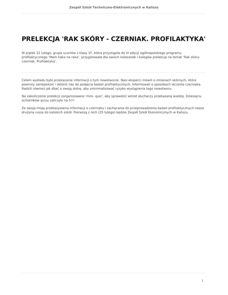 Zespół Szkół Techniczno-Elektronicznych w Kaliszu PRELEKCJA 'RAK SKÓRY - CZERNIAK. PROFILAKTYKA' W piątek 22 lutego, grupa uczniów z klasy 1F, która przystąpiła do VI edycji ogólnopolskiego programu profilaktycznego ‘Mam haka na raka’, przygotowała dla swoich koleżanek i kolegów prelekcję na temat ‘Rak skóryczerniak. Profilaktyka’. Celem wykładu było przekazanie informacji o tym nowotworze. Nasi eksperci mówili o zmianach skórnych, które powinny zaniepokoić i skłonić nas do podjęcia badań profilaktycznych. Informowali o sposobach leczenia czerniaka. Radzili również jak dbać o swoją skórę, aby zminimalizować ryzyko wystąpienia tego nowotworu. Na zakończenie prelekcji zorganizowano ‘mini- quiz’, aby sprawdzić wśród słuchaczy przekazaną wiedzę. Dziesięciu ochotników quizu zaliczyło na 5!!! Ze swoją misją przekazywania informacji o czerniaku i zachęcania do przeprowadzenia badań profilaktycznych nasza drużyna rusza do kaliskich szkół. Pierwszą z nich (25 lutego) będzie Zespół Szkół Ekonomicznych w Kaliszu. 1
