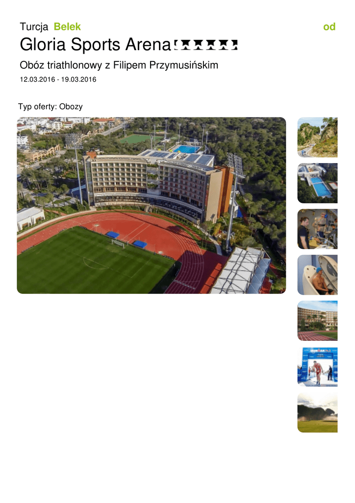Turcja Belek Gloria Sports Arena Obóz triathlonowy z Filipem Przymusińskim 12.03.2016 - 19.03.2016 Typ oferty: Obozy od 955 Gloria Sports Arena - Opis hotelu Grupa Gloria jest jednym z najbardziej wiodących grup hotelowych na Riwierze Tureckie rozszerzyła ofertę dla sportowców chcących trenować w komfortowych warunkach. Gloria Sp daje możliwość trenowania na profesjonalnym poziomie wielu dyscyplin sportowych, w tym Ośrodek ten jest organizatorem pierwszych w Turcji zawodów Ironman 70.3. Obiekt pos baseny olimpijskie (kryte i otwarte), bieżnię, hale, boiska, centrum spinningowe, centrum fi bogate zaplecze rehabilitacyjne i do regeneracji. Można także skorzystać z takich udogo kriokomora, contemplas, indywidualna analiza biomechaniczna czy hydroworx. Pokoje hotelowe są spore, sprzyjające regeneracji. Znaleźć można tutaj m.in. klimatyzację widokiem na stadion. W standardowym pakiecie wyżywienie HB, specjalne, zbilansowane po duże butelki wody dziennie. W opcji all inclusive 3 posiłki dziennie, kosz świeżych owoców, n jednorazowy pobyt w restauracji a’la carte. STRONA WWW OŚRODKA BELEK Ośrodek leży w Belek leżącym nad błękitną ta Śródziemnego pośród pia plaż i urzekających kr Znane jest także z feerii o smaków i starożytnej ar miejsc będących kolebk cywilizacji. Staje się rajem chcących spędzać czas głównie dzięki roz infrastrukturze hotelowej, oraz dogodnym pogodowym do uprawiania s zewnątrz. To również tutaj się zawody IRONMAN 70.3. FILIP PRZYMUSIŃSKI Filip Przymusiński jest współzałożycielem, zawodnikiem i trenerem w UAM Triathlon Długoletni członek Kadry Narodowej i reprezentant kraju, wielokrotny medalista Mistrzos Obecnie startujący na dystansach długich. Ukończył poznańską Akademię Wychowania F zdobywając w 2008 roku tytuł magistra na specjalności trenerskiej. Obecnie wykłada w Wychowania Fizycznego i Sportu na Uniwersytecie im. Adama Mickiewicza w Poznaniu ( wyróżniany nagrodą rektora za pracę dydaktyczną i sportową). WIĘCEJ O FILIPIE PLAN TRENINGOWY DOSTOSOWUJEMY DO TWOJEGO POZIOMU PAKIET BRONZE W skład pakietu wchodzi: HB (śniadania i obiadokolacje) możliwość dopłaty do FB (lunchu) - 175 € / tydzień 2 duże butelki wody dziennie 2x90 min sesji treningowych dostęp do sali fitness i siłowni usługa prania raz w tygodniu sauna i łaźnia parowa Wi-Fi Inne udogodnienia (dodatkowo płatne): analiza kontruzji i urazów (Spartanova) sala spinningowa zabiegi fizjoterapeutyczne gra w golfa Istnieje możliwość upgrade’u do pakietu SILVER (Full Board, zabiegi w GSA – krioterap ICELAB, analiza ruchu Contemplas, hydroterapia w Hydroworx 2000, analiza ciała BOD codzienne pranie, zniżki w restauracjach) Na prośbę możemy przygotować również pełny pakiet GOLD PROPOZYCJE PRZELOTÓW Loty czarterowe bezpośrednio z Poznania do Antalyi. Możliwe również wyloty z Warszawy i K Ceny od 760 zł! Udogodnienia hotelu Bar Bar z przekąskami Całoroczny basen Centrum Fitness Internet Wi-Fi Klimatyzacja Masaż Mini Bar Pokój z tarasem Pokoje dla niepalących Restauracja Restauracja z wyborem dań z karty Suszarka Telewizja Telewizja satelitarna Usługi pralni Usługi Spa & Wellness Gloria Sports Arena 5* DBL SGL 7 nocy / HB/ ceny w € od osoby 955.00 EUR 12.03 - 19.03.2016 1305.00 EU Cena aktualna przy min. 8 osobach Możliwość przedłużenia wyjazdu do 14 dni! Oferta zawiera 7 noclegów w pokoju typu Superior DBL lub SGL pakiet Bronze Transfery lotniskowe plan treningowy i opiekę trenera Filipa Przymusińskiego ubezpieczenie KL NNW podatek i obsługę Oferta nie zawiera przelotu do Antalyi dopłaty do pakietu Silver całej grupy – 355 €/os. opłaty za ewentualny transport sprzętu rowerowego / wypożyczenia roweru zameldowania w pokoju typu Suite Katarzyna Bobińska tel: +48 604 40 98 44 e-mail: kbobinska@travel