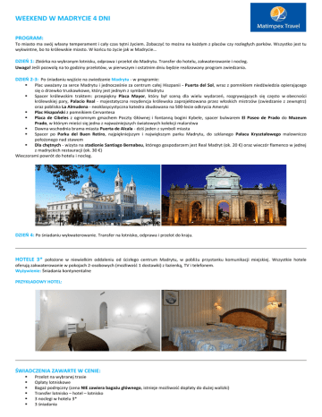 WEEKEND W MADRYCIE 4 DNI PROGRAM: To miasto ma swój własny temperament i cały czas tętni życiem. Zobaczyć to można na każdym z placów czy rozległych parków. Wszystko jest tu wykwintne, bo to królewskie miasto. W końcu to życie jak w Madrycie… DZIEŃ 1: Zbiórka na wybranym lotnisku, odprawa i przelot do Madrytu. Transfer do hotelu, zakwaterowanie i nocleg. Uwaga! Jeśli pozwolą na to godziny przelotów, w pierwszym i ostatnim dniu będzie realizowany program zwiedzania . DZIEŃ 2-3: Po śniadaniu wyjście na zwiedzanie Madrytu - w programie: Plac uważany za serce Madrytu i jednocześnie za centrum całej Hiszpanii - Puerta del Sol, wraz z pomnikiem niedźwiedzia opierającego się o drzewko truskawkowe, który jest jednym z symboli Madrytu Spacer królewskim traktem: przepiękny Placa Mayor, który był sceną dla wielu wydarzeń, rozgrywających się często w obecności królewskiej pary, Palacio Real - majestatyczna rezydencja królewska zaprojektowana przez włoskich mistrzów (zwiedzanie z zewnątrz) oraz pobliska La Almudena - neoklasycystyczna katedra zbudowana na 500-lecie odkrycia Ameryki Plac Hiszpański z pomnikiem Cervantesa Placa de Cibeles z ogromnym gmachem Poczty Głównej i fontanną bogini Kybele, spacer bulwarem El Paseo de Prado do Muzeum Prado, w którym mieści się jedna z najważniejszych światowych kolekcji malarstwa Dawna wschodnia brama miasta Puerta de Alcala - dziś jeden z symboli miasta Spacer po Parku del Buen Retiro, najpiękniejszym i największym parku Madrytu, do szklanego Pałacu Kryształowego malowniczo położonego nad stawem Dla chętnych - wizyta na stadionie Santiago Bernabeu, którego gospodarzem jest Real Madryt (ok. 20 €) oraz wieczór flamenco w jednej z madryckich restauracji (ok. 30 €) Wieczorami powrót do hotelu i nocleg. DZIEŃ 4: Po śniadaniu wykwaterowanie. Transfer na lotnisko, odprawa i przelot do kraju. HOTELE 3* położone w niewielkim oddaleniu od ścisłego centrum Madrytu, w pobliżu przystanku komunikacji miejskiej. Wszystkie hotele oferują zakwaterowanie w pokojach 2-osobowych (możliwość 1 dostawki) z łazienką, TV i telefonem. Wyżywienie: Śniadania kontynentalne PRZYKŁADOWY HOTEL: ŚWIADCZENIA ZAWARTE W CENIE: Przelot na wybranej trasie Opłaty lotniskowe Bagaż podręczny (cena NIE zawiera bagażu głównego, istnieje możliwość dopłaty do dużej walizki) Transfer lotnisko – hotel – lotnisko 3 noclegi w hotelu 3* 3 śniadania Pokoje 2-osobowe z łazienkami Opieka pilota Ubezpieczenie podstawowe Signal Iduna (KL, NNW, CHP i bagaż) KOSZTY DODATKOWE: Orientacyjny koszt realizacji programu zwiedzania to ok. 60-80 € (w zależności od wielkości grupy) - kwota ta obejmuje przejazdy komunikacją miejską podczas programu zwiedzania, bilety wstępu do zwiedzanych obiektów wraz z kosztami ich rezerwacji (Muzeum Prado) oraz lokalnych przewodników. Opcje dla chętnych (stadion, wieczór flamenco) są dodatkowo płatne. INFORMACJE DODATKOWE: Dopłata za pokój 1-osobowy +400 zł (nie ma możliwości dokwaterowania!) Zniżka dla trzeciej osoby w pokoju -100 zł Gwarancja niezmienności ceny +30 zł WYBIERZ SWÓJ BAGAŻ: Cena wycieczki zawiera jedynie bagaż podręczny o wadze 10 kg i wymiarach 55x40x20 cm oraz dodatkowy mały bagaż podręczny o wymiarach 35x20x20 cm. Istnieje możliwość wykupienia bagażu głównego – ceny bagażu zależą od przewoźnika, trasy i terminu wycieczki, a dodatkowy bagaż przypisany jest do konkretnej osoby. Szczegółowy cennik bagażu znajdziecie na stronie www.matimpex.pl w zakładce Katalogi i ceny. Ze względów organizacyjnych prosimy o ostateczny wybór opcji bagażu najpóźniej na 4 dni robocze przed planowanym terminem wycieczki – po tym terminie dodanie bagażu może nie być możliwe. Przypominamy, że w bagażu podręcznym nie mogą znajdować się płyny ani żele czy fluidy w opakowaniach większych niż 100 ml oraz ostre narzędzia (noże, metalowe pilniczki do paznokci, nożyczki, itp.). Szczegóły na www.matimpex.pl w zakładce Linie lotnicze. POZOSTAŁE UWAGI: Kolejność zwiedzania może ulec zmianie, jednak wszystkie punkty programu zostaną zrealizowane. Pilot nie oprowadza grupy po wnętrzach muzeów (zwiedzanie muzeów z przewodnikiem lokalnym). Spotkanie z pilotem nastąpi na lotnisku w kraju lub w Madrycie po przylocie. W pojedynczych przypadkach transfer lotniskowy może być realizowany pod opieką lokalnego kierowcy. Transfery lotniskowe realizowane są busem/autokarem, a przejazdy po mieście komunikacją miejską. W przypadku wylotu we wczesnych godzinach porannych, zamiast śniadania mogą zostać przygotowane pakiety śniadaniowe. UBEZPIECZENIE: Podczas naszej wycieczki Uczestnicy są objęci podstawowym ubezpieczeniem Signal Iduna. Pakiet podstawowy zawiera ubezpieczenie od kosztów leczenia (KL do 10.000 €), następstw nieszczęśliwych wypadków (NNW do 15.000 zł), bagażu (do 1.000 zł), a także ubezpieczenie w przypadku chorób przewlekłych (CHP). Istnieje również możliwość skorzystania z opcji dodatkowego ubezpieczenia (pakietów rozszerzonych oraz ubezpieczenia od kosztów rezygnacji). Szczegółowe warunki wszystkich wariantów ubezpieczenia znajdziecie na www.matimpex.pl. TERMINY I CENY: Cennik wraz z terminami znajdziesz na www.matimpex.pl