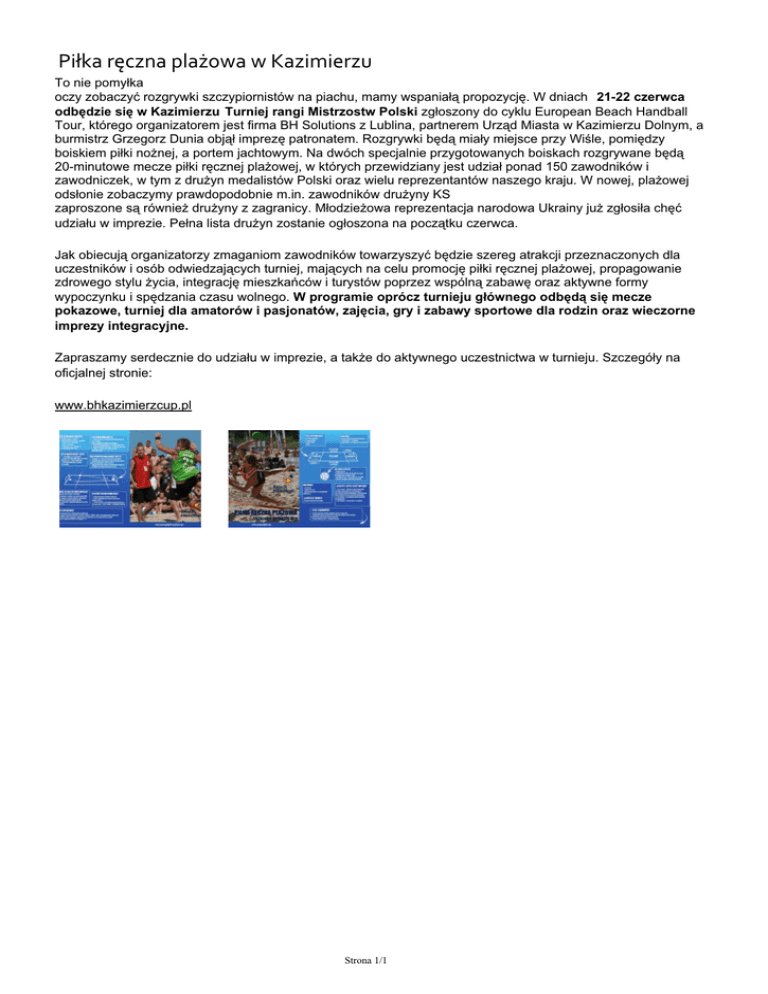 Piłka ręczna plażowa w Kazimierzu To nie pomyłka oczy zobaczyć rozgrywki szczypiornistów na piachu, mamy wspaniałą propozycję. W dniach 21-22 czerwca odbędzie się w Kazimierzu Turniej rangi Mistrzostw Polski zgłoszony do cyklu European Beach Handball Tour, którego organizatorem jest firma BH Solutions z Lublina, partnerem Urząd Miasta w Kazimierzu Dolnym, a burmistrz Grzegorz Dunia objął imprezę patronatem. Rozgrywki będą miały miejsce przy Wiśle, pomiędzy boiskiem piłki nożnej, a portem jachtowym. Na dwóch specjalnie przygotowanych boiskach rozgrywane będą 20-minutowe mecze piłki ręcznej plażowej, w których przewidziany jest udział ponad 150 zawodników i zawodniczek, w tym z drużyn medalistów Polski oraz wielu reprezentantów naszego kraju. W nowej, plażowej odsłonie zobaczymy prawdopodobnie m.in. zawodników drużyny KS zaproszone są również drużyny z zagranicy. Młodzieżowa reprezentacja narodowa Ukrainy już zgłosiła chęć udziału w imprezie. Pełna lista drużyn zostanie ogłoszona na początku czerwca. Jak obiecują organizatorzy zmaganiom zawodników towarzyszyć będzie szereg atrakcji przeznaczonych dla uczestników i osób odwiedzających turniej, mających na celu promocję piłki ręcznej plażowej, propagowanie zdrowego stylu życia, integrację mieszkańców i turystów poprzez wspólną zabawę oraz aktywne formy wypoczynku i spędzania czasu wolnego. W programie oprócz turnieju głównego odbędą się mecze pokazowe, turniej dla amatorów i pasjonatów, zajęcia, gry i zabawy sportowe dla rodzin oraz wieczorne imprezy integracyjne. Zapraszamy serdecznie do udziału w imprezie, a także do aktywnego uczestnictwa w turnieju. Szczegóły na oficjalnej stronie: www.bhkazimierzcup.pl Strona 1/1 Powered by TCPDF (www.tcpdf.org)
