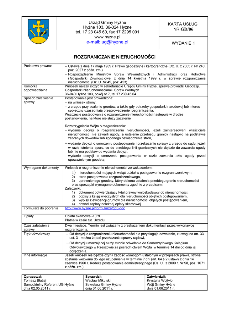 Urząd Gminy Hyżne Hyżne 103, 36-024 Hyżne tel. 17 23 045 60, fax 17 2295 001 www.hyzne.pl KARTA USŁUG NR GD/06 e-mail: [email protected] WYDANIE 1 ROZGRANICZANIE NIERUCHOMOŚCI Podstawa prawna: Komórka odpowiedzialna Sposób załatwienia sprawy − Ustawa z dnia 17 maja 1989 r. Prawo geodezyjne i kartograficzne (Dz. U. z 2005 r. Nr 240, poz. 2027 z późn. zm.) − Rozporządzenie Ministrów Spraw Wewnętrznych i Administracji oraz Rolnictwa i Gospodarki Żywnościowej z dnia 14 kwietnia 1999 r. w sprawie rozgraniczania nieruchomości (Dz. U. Nr 45, poz. 453) Wniosek należy złożyć w sekretariacie Urzędu Gminy Hyżne, sprawę prowadzi Geodezji, Gospodarki Nieruchomościami i Spraw Wodnych 36-040 Hyżne 103, pokój nr 7, tel 17 230 45 64 Postępowanie jest prowadzone: − na wniosek strony, − z urzędu przy scalaniu gruntów, a także gdy potrzeby gospodarki narodowej lub interes społeczny uzasadniają przeprowadzenie rozgraniczenia. Wszczęcie postępowania o rozgraniczenie nieruchomości następuje w drodze postanowienia, na które nie służy zażalenie Rozstrzygnięcia Wójta o rozgraniczaniu: − wydanie decyzji o rozgraniczeniu nieruchomości, jeżeli zainteresowani właściciele nieruchomości nie zawarli ugody, a ustalenie przebiegu granicy nastąpiło na podstawie zebranych dowodów lub zgodnego oświadczenia stron, − wydanie decyzji o umorzeniu postępowania i przekazaniu sprawy z urzędu do sądu, jeżeli w razie istnienia sporu, co do przebiegu linii granicznych nie dojdzie do zawarcia ugody lub nie ma podstaw do wydania decyzji, − wydanie decyzji o umorzeniu postępowania w razie zawarcia aktu ugody przed upoważnionym geodetą. Wymagane dokumenty Formularz do pobrania Wniosek o rozgraniczenie nieruchomości ze wskazaniem: 1) nieruchomości mających wziąć udział w postępowaniu rozgraniczeniowym, 2) stron postępowania rozgraniczeniowego, 3) uprawnionego geodety, który dokona ustalenia przebiegu granic nieruchomości oraz sporządzi wymagane dokumenty zgodnie z przepisami. Załączniki: 1) dokument potwierdzający tytuł prawny wnioskodawcy do nieruchomości, 2) odpisy z ksiąg wieczystych dla nieruchomości objętych postępowaniem, 3) wypisy z ewidencji gruntów dla nieruchomości objętych postępowaniem, 4) dowód zapłaty należnej opłaty skarbowej. http://www.hyzne.pl/formularze/gd6.doc Opłaty Opłata skarbowa -10 zł Płatna w kasie tut. Urzędu Czas załatwienia sprawy Tryb odwoławczy Dwa miesiące. Termin jest związany z przekazaniem dokumentacji przez wykonawcę rozgraniczenia. − Od decyzji o rozgraniczeniu nieruchomości nie przysługuje odwołanie, z uwagi na art. 33 ust. 3 – można żądać przekazania sprawy sądowi, − Od decyzji umarzającej służy stronie odwołanie do Samorządowego Kolegium Inne informacje Odwoławczego w Rzeszowie za pośrednictwem Wójta w terminie 14 dni od dnia jej doręczenia. Jeżeli wniosek nie będzie czynił zadość wymogom ustalonym w przepisach prawa, strona zostanie wezwana do jego uzupełnienia w terminie 7 dni (art. 64 § 2 ustawy z dnia 14 czerwca 1960 r. Kodeks postępowania administracyjnego (Dz. U. z 2000 r. Nr 98, poz. 1071 z późn. zm.). Opracował: Tomasz Błażej Samodzielny Referent UG Hyżne dnia 02.05.2011 r. Sprawdził: Wacław Mikulski Sekretarz Gminy Hyżne dnia 01.06.2011 r. Zatwierdził: Krystyna Wojtyło Wójt Gminy Hyżne dnia 01.06.2011 r.