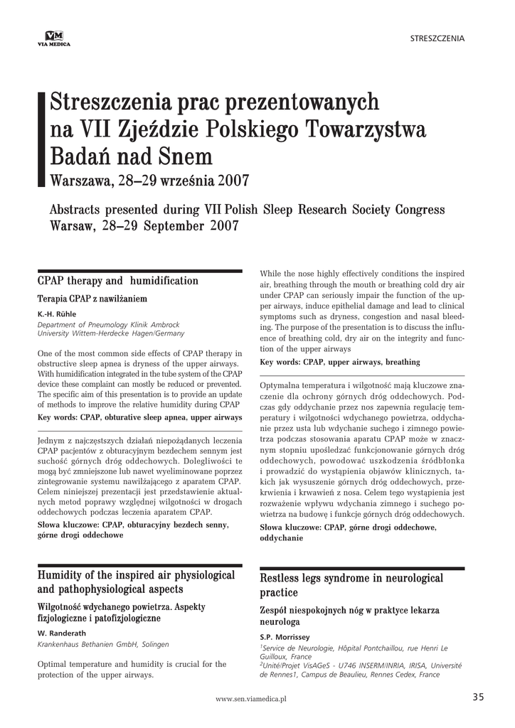 STRESZCZENIA Streszczenia prac prezentowanych na VII Zjeździe Polskiego Towarzystwa Badań nad Snem Warszawa, 28–29 września 2007 Abstracts presented during VII Polish Sleep Research Society Con gress Congress Warsaw, 28–29 September 2007 CPAP therapy and humidification Terapia CPAP z nawilżaniem K.-H. Rühle Department of Pneumology Klinik Ambrock University Wittem-Herdecke Hagen/Germany One of the most common side effects of CPAP therapy in obstructive sleep apnea is dryness of the upper airways. With humidification integrated in the tube system of the CPAP device these complaint can mostly be reduced or prevented. The specific aim of this presentation is to provide an update of methods to improve the relative humidity during CPAP While the nose highly effectively conditions the inspired air, breathing through the mouth or breathing cold dry air under CPAP can seriously impair the function of the upper airways, induce epithelial damage and lead to clinical symptoms such as dryness, congestion and nasal bleeding. The purpose of the presentation is to discuss the influence of breathing cold, dry air on the integrity and function of the upper airways Key words: CPAP, upper airways, breathing Jednym z najczęstszych działań niepożądanych leczenia CPAP pacjentów z obturacyjnym bezdechem sennym jest suchość górnych dróg oddechowych. Dolegliwości te mogą być zmniejszone lub nawet wyeliminowane poprzez zintegrowanie systemu nawilżającego z aparatem CPAP. Celem niniejszej prezentacji jest przedstawienie aktualnych metod poprawy względnej wilgotności w drogach oddechowych podczas leczenia aparatem CPAP. Optymalna temperatura i wilgotność mają kluczowe znaczenie dla ochrony górnych dróg oddechowych. Podczas gdy oddychanie przez nos zapewnia regulację temperatury i wilgotności wdychanego powietrza, oddychanie przez usta lub wdychanie suchego i zimnego powietrza podczas stosowania aparatu CPAP może w znacznym stopniu upośledzać funkcjonowanie górnych dróg oddechowych, powodować uszkodzenia śródbłonka i prowadzić do wystąpienia objawów klinicznych, takich jak wysuszenie górnych dróg oddechowych, przekrwienia i krwawień z nosa. Celem tego wystąpienia jest rozważenie wpływu wdychania zimnego i suchego powietrza na budowę i funkcje górnych dróg oddechowych. Słowa kluczowe: CPAP, obturacyjny bezdech senny, górne drogi oddechowe Słowa kluczowe: CPAP, górne drogi oddechowe, oddychanie Humidity of the inspired air physiological and pathophysiological aspects Restless legs syndrome in neurological practice Wilgotność wdychanego powietrza. Aspekty fizjologiczne i patofizjologiczne Zespół niespokojnych nóg w praktyce lekarza neurologa Key words: CPAP, obturative sleep apnea, upper airways W. Randerath S.P. Morrissey Krankenhaus Bethanien GmbH, Solingen 1Service Optimal temperature and humidity is crucial for the protection of the upper airways. de Neurologie, Hôpital Pontchaillou, rue Henri Le Guilloux, France 2Unité/Projet VisAGeS - U746 INSERM/INRIA, IRISA, Université de Rennes1, Campus de Beaulieu, Rennes Cedex, France www.sen.viamedica.pl 35 SEN 2007, Tom 7, Nr 1 Since its first description in 1685 (Thomas Willis) Restless Legs Syndrome (RLS) subsequently was considered as a psychiatric disorder in the 19th century (anxietas tibiarum), and re-emerged from medical oblivion as a neurological disorder, sensorimotor disturbance, in the second half of the 20th century: Pivotal studies described the clinical, epidemiological and genetic background of idiopathic RLS forms, leading more recently to define four minimal diagnostic criteria (Allen et al. 2003), and three supportive criteria (positive family history, positive dopaminergic response, and periodic leg movements). Besides its idiopathic forms secondary RLS may occur in a number of medical conditions (e.g. disturbance of iron metabolism, uraemia, or pregnancy), and may be associated with especially neurodegenerative diseases (e.g. Parkinson’s disease or Multiple Sclerosis). The challenges for a physician confronted with such patients in a clinical routine setting are manifold, and diagnostic or therapeutic guidelines for idiopathic RLS are not always directly applicable for secondary RLS or RLS in other neurological comorbidities. This talk will address the following issues: 1. Diagnostic criteria for idiopathic versus secondary RLS versus RLS associated with other (chronic) neurological diseases 2. Useful and – mandatory – laboratory investigations in suspected RLS 3. Initiation of symptomatic RLS treatment (When to start? Which patients should be treated? First-line versus second – line treatments) 4. RLS treatment guidelines are focussed on its idiopathic forms; symptomatic treatment of secondary RLS or RLS associated with other chronic neurological diseases may be more challenging as it should also treat indirect consequences of RLS (e.g. fatigue or memory impairment or even motor performance especially in neurodegenerative diseases) 5. Potential (severe) adverse events of (dopaminergic) RLS treatment, and issues like augmentation and rebound phenomenon 6. RLS caused or worsened by other co-medication Key words: restless legs syndrome, neurological disorders, sleep disorders W XIX wieku od czasu, kiedy Thomas Willis w 1865 roku po raz pierwszy opisał zespół niespokojnych nóg (RLS, restless legs syndrome) uważano, że jest to zaburzenie psychiczne (anxietas tibiarum), dopiero w drugiej połowie XX wieku wyszło ono z „medycznego zapomnienia” jako zaburzenie neurologiczne, sensomotoryczne. W badaniach podstawowych opisano kliniczne, epidemiologiczne i genetyczne cechy idiopatycznych form RLS, dzięki czemu udało się zdefiniować 4 podstawowe kryteria diagnostyczne (Allen i wsp. 2003) oraz 3 pomocnicze kryteria diagnostyczne (dodatni wywiad rodzinny, pozytywna odpowiedź na dopaminę oraz okresowe ruchy kończyn). 36 Poza swoimi postaciami idiopatycznymi, RLS może być zab