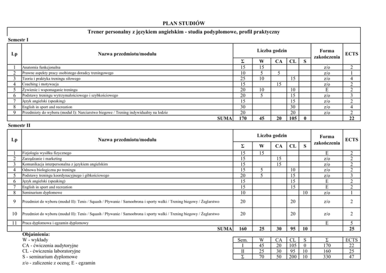 PLAN STUDIÓW Trener personalny z językiem angielskim - studia podyplomowe, profil praktyczny Semestr I 1 2 3 4 5 6 7 8 9 Liczba godzin Nazwa przedmiotu/modułu Lp Anatomia funkcjonalna Prawne aspekty pracy osobistego doradcy treningowego Teoria i praktyka treningu siłowego Coaching i motywacja Żywienie i wspomaganie treningu Podstawy treningu wytrzymałościowego i szybkościowego Język angielski (speaking) English in sport and recreation Przedmioty do wyboru (moduł I): Narciarstwo biegowe / Trening indywidualny na lodzie SUMA Σ 15 10 25 15 20 20 15 30 20 170 W 15 5 10 CA CL S z/o z/o z/o z/o E z/o z/o z/o z/o 5 15 15 10 5 45 20 10 15 15 30 20 105 Forma zakończenia 0 ECTS 2 1 4 2 2 3 2 4 2 22 Semestr II Liczba godzin Nazwa przedmiotu/modułu Lp Forma zakończenia ECTS E z/o z/o z/o z/o E E z/o 2 2 2 2 3 2 2 1 1 2 3 4 5 6 7 8 Fizjologia wysiłku fizycznego Zarządzanie i marketing Komunikacja interpersonalna z językiem angielskim Odnowa biologiczna po treningu Podstawy treningu koordynacyjnego i gibkościowego Język angielski (speaking) English in sport and recreation Seminarium dyplomowe Σ 15 15 15 15 20 15 15 10 9 Przedmiot do wyboru (moduł II): Tenis / Squash / Pływanie / Samoobrona i sporty walki / Trening biegowy / Żeglarstwo 20 20 z/o 2 10 Przedmiot do wyboru (moduł II): Tenis / Squash / Pływanie / Samoobrona i sporty walki / Trening biegowy / Żeglarstwo 20 20 z/o 2 11 Praca dyplomowa i egzamin dyplomowy E 5 25 Σ 170 160 330 ECTS 22 25 47 SUMA Objaśnienia: W - wykłady CA - ćwiczenia audytoryjne CL - ćwiczenia laboratoryjne S - seminarium dyplomowe z/o - zaliczenie z oceną; E - egzamin W 15 CA CL S 15 15 5 5 10 15 15 15 10 160 25 30 95 10 Sem. I II Σ W 45 25 70 CA 20 30 50 CL 105 95 200 S 0 10 10