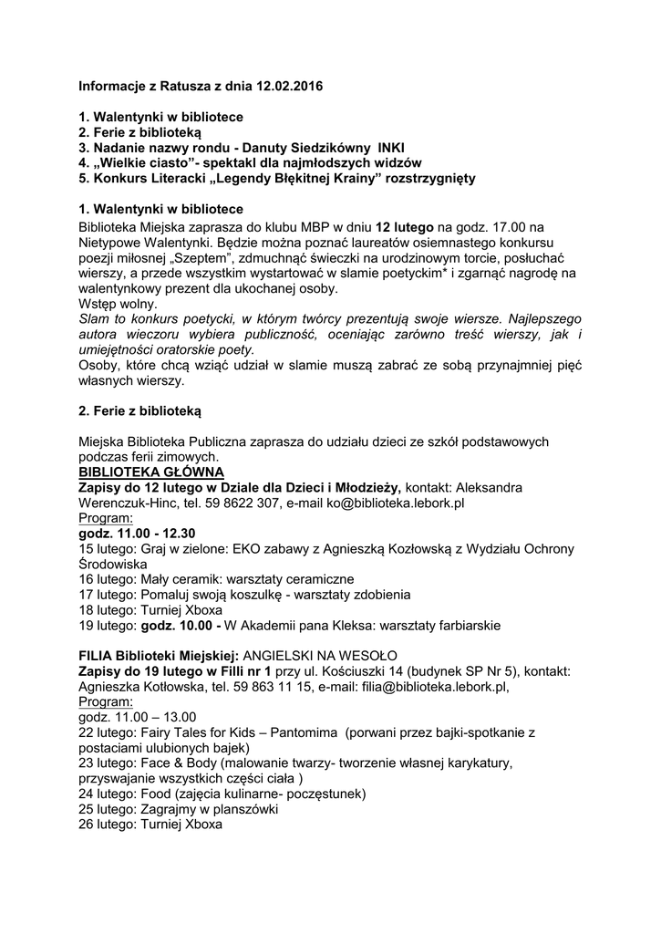 Informacje z Ratusza z dnia 12.02.2016 1. Walentynki w bibliotece 2. Ferie z biblioteką 3. Nadanie nazwy rondu - Danuty Siedzikówny INKI 4. „Wielkie ciasto”- spektakl dla najmłodszych widzów 5. Konkurs Literacki „Legendy Błękitnej Krainy” rozstrzygnięty 1. Walentynki w bibliotece Biblioteka Miejska zaprasza do klubu MBP w dniu 12 lutego na godz. 17.00 na Nietypowe Walentynki. Będzie można poznać laureatów osiemnastego konkursu poezji miłosnej „Szeptem”, zdmuchnąć świeczki na urodzinowym torcie, posłuchać wierszy, a przede wszystkim wystartować w slamie poetyckim* i zgarnąć nagrodę na walentynkowy prezent dla ukochanej osoby. Wstęp wolny. Slam to konkurs poetycki, w którym twórcy prezentują swoje wiersze. Najlepszego autora wieczoru wybiera publiczność, oceniając zarówno treść wierszy, jak i umiejętności oratorskie poety. Osoby, które chcą wziąć udział w slamie muszą zabrać ze sobą przynajmniej pięć własnych wierszy. 2. Ferie z biblioteką Miejska Biblioteka Publiczna zaprasza do udziału dzieci ze szkół podstawowych podczas ferii zimowych. BIBLIOTEKA GŁÓWNA Zapisy do 12 lutego w Dziale dla Dzieci i Młodzieży, kontakt: Aleksandra Werenczuk-Hinc, tel. 59 8622 307, e-mail [email protected] Program: godz. 11.00 - 12.30 15 lutego: Graj w zielone: EKO zabawy z Agnieszką Kozłowską z Wydziału Ochrony Środowiska 16 lutego: Mały ceramik: warsztaty ceramiczne 17 lutego: Pomaluj swoją koszulkę - warsztaty zdobienia 18 lutego: Turniej Xboxa 19 lutego: godz. 10.00 - W Akademii pana Kleksa: warsztaty farbiarskie FILIA Biblioteki Miejskiej: ANGIELSKI NA WESOŁO Zapisy do 19 lutego w Filli nr 1 przy ul. Kościuszki 14 (budynek SP Nr 5), kontakt: Agnieszka Kotłowska, tel. 59 863 11 15, e-mail: [email protected], Program: godz. 11.00 – 13.00 22 lutego: Fairy Tales for Kids – Pantomima (porwani przez bajki-spotkanie z postaciami ulubionych bajek) 23 lutego: Face & Body (malowanie twarzy- tworzenie własnej karykatury, przyswajanie wszystkich części ciała ) 24 lutego: Food (zajęcia kulinarne- poczęstunek) 25 lutego: Zagrajmy w planszówki 26 lutego: Turniej Xboxa 3. Nadanie nazwy rondu - Danuty Siedzikówny INKI W dniu 1 marca przypada Narodowy Dzień Pamięci „Żołnierzy Wyklętych”. Tego dnia o godz. 11.00 - w auli I LO w Lęborku odbędzie się spotkanie młodzieży z p. Luizą Łuniewską autorką książki „Szukając Inki” i Agnieszką Marszk, autorką wystawy „Żołnierzom Wyklętym…”, a następnie - o 12.30 na rondzie przy ulicach Krzywoustego - Kaszubskiej nastąpi odsłonięcie tablicy z nazwą Rondo Danuty Siedzikówny INKI. O godz. 17.00 odprawiona zostanie msza św. w kościele pw. Miłosierdzia Bożego (ul. Kasztanowa) oraz złożone będą kwiaty pod tablicą pamiątkową 5. Wileńskiej Brygady AK i innym bohaterom podziemia niepodległościowego. O godz. 18.45 zaplanowane jest otwarcie wystawy „Żołnierzom wyklętym…” Agnieszki Marszk w Sanktuarium św. Jakuba, a o 19.00 spotkanie z p. L. Łuniewską autorką książki o Ince – w auli Jana Pawła II przy Sanktuarium. 4. „Wielkie ciasto”- spektakl dla najmłodszych widzów Lęborskie Centrum Kultury „Fregata” zaprasza na nowy cykl imprez kulturalnych pod hasłem „Niedzielne spotkania z teatrem”. Od lutego, co miesiąc, na Stacji Kultura będą odbywały się przedstawienia teatralne dla najmłodszych połączone z warsztatami i spotkaniami z twórcami. LCK Fregata pragnie rozszerzyć ofertę o regularne przedstawienia teatralne dla dzieci. Po każdym przedstawieniu odbędą się krótkie warsztaty i spotkanie z aktorami, którzy opowiedzą o kulisach sztuki teatralnej. Póki co, spotkania będą odbywały się raz w miesiącu. Terminy „Niedzielnych spotkań z teatrem” w pierwszej połowie 2016 roku to: 28 lutego, 20 marca, 17 kwietnia, 15 maja i 12 czerwca. Wszystkie spektakle będą rozpoczynały się o 15:00. Pierwsze spotkanie to przedstawienie Teatru Gdynia Główna pod tytułem „Wielkie ciasto”. Początek o godzinie 15:00 w dniu 28 lutego 2016 r. Miejsce: Stacja Kultura (Dworzec PKP w Lęborku). Bilety w cenie 5 złotych (dzieci) i 8 złotych (dorośli) dostępne są w kasie Kina przy ul. Gdańskiej oraz w CIT przy alei Niepodległości 6. Liczba biletów ograniczona. Przedstawienie inspirowane opowiadaniem J.R.R Tolkiena Kowal z Podlesia Większego, scenariusz i reżyseria: Piotr Srebrowski, obsada: Konrad Till, Radosław Smużny, projekt lalek: Piotr Srebrowski, konsultacje dramaturgiczne: Maciej Wiktor, muzyka: Sówka Sowińska, przepis na ciasto: ciocia Wiesia. Czas trwania: 45 min. Spektakl dla widzów od lat 3. 5. Konkurs Literacki „Legendy Błękitnej Krainy” rozstrzygnięty Rozstrzygnięty został X Otwarty Konkurs Literacki Legendy Błękitnej Krainy, organizowany co roku przez Lokalną Organizację Turystyczną Ziemia Lęborska Łeba przy współpracy z Urzędem Miejskim oraz Starostwem Powiatowym. Wpłynęło 45 legend, w tym 23 ze szkół podstawowych powiatu lęborskiego, 17 z gimnazjów oraz 5 prac w kategorii szkół ponadgimnazjalnych i osób dorosłych, Powołana przez LOT komisję konkursowa w składzie: Halina Krzewniak – prezes Stowarzyszenia Twórców i Animatorów Kultury TAK w Lęborku (przewodnicząca komisji), Edyta Litwiniuk – polonistka, redaktor prowadzący Dziennika Bałtyckiego (Oddział w Lęborku), Marcin Krzciuk – polonista, pracownik LOT Ziemia Lęborska - Łeba. oceniła prace i wyłoniła najlepsze Grand Prix otrzymał Artur Kamieniecki - uczeń Społecznego Gimnazjum Językowego w Lęborku, autor legendy O tym jak dąb dostał imię Arkadiusz kategoria szkół podstawowych: I miejsce: Jolanda Postma (Zespół Szkół w Garczegorzu) II miejsce: Dawid Cyganowski (Szkoła Podstawowa z Oddziałami Integracyjnymi w Przerytem) III miejsce: Weronika Romanowska (Zespół Szkół w Cewicach) kategoria szkół gimnazjalnych: I miejsce: Jakub Nastaj (SGJ w Lęborku) II miejsce: Zofi