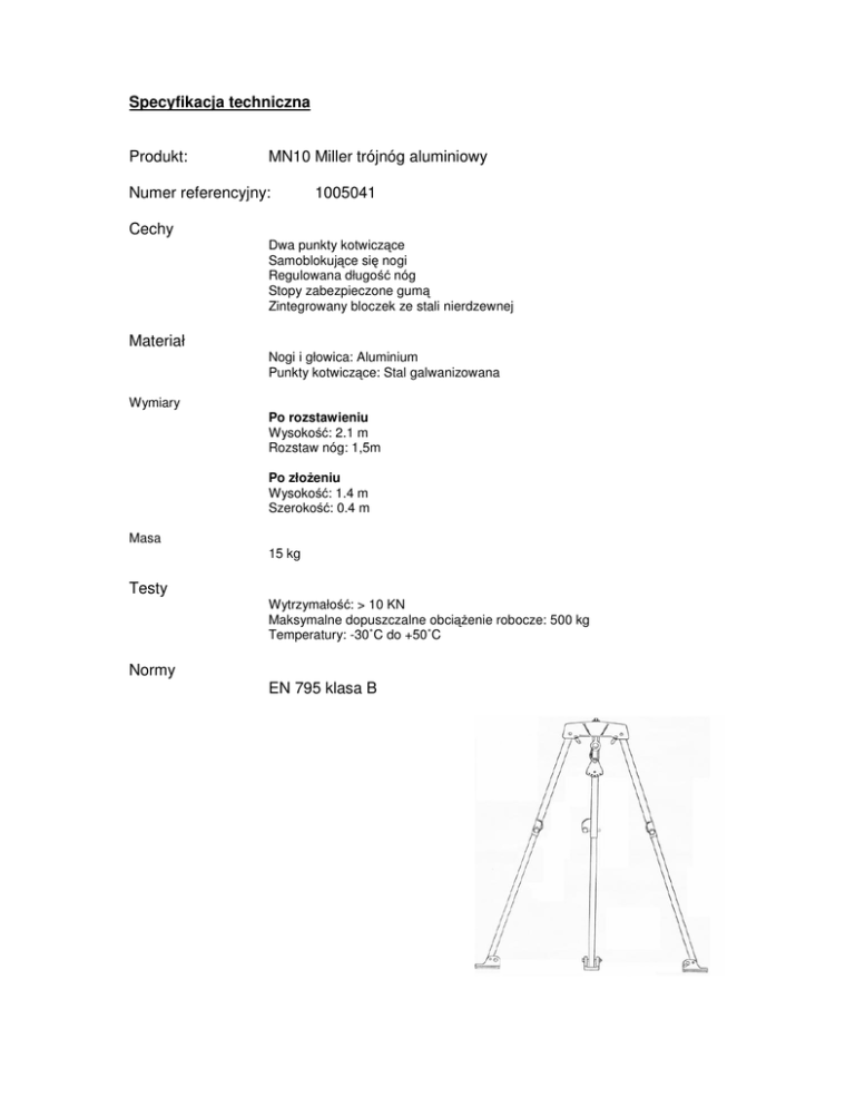 Specyfikacja techniczna Produkt: MN10 Miller trójnóg aluminiowy Numer referencyjny: 1005041 Cechy Dwa punkty kotwiczące Samoblokujące się nogi Regulowana długość nóg Stopy zabezpieczone gumą Zintegrowany bloczek ze stali nierdzewnej Materiał Nogi i głowica: Aluminium Punkty kotwiczące: Stal galwanizowana Wymiary Po rozstawieniu Wysokość: 2.1 m Rozstaw nóg: 1,5m Po złożeniu Wysokość: 1.4 m Szerokość: 0.4 m Masa 15 kg Testy Wytrzymałość: > 10 KN Maksymalne dopuszczalne obciążenie robocze: 500 kg Temperatury: -30˚C do +50˚C Normy EN 795 klasa B