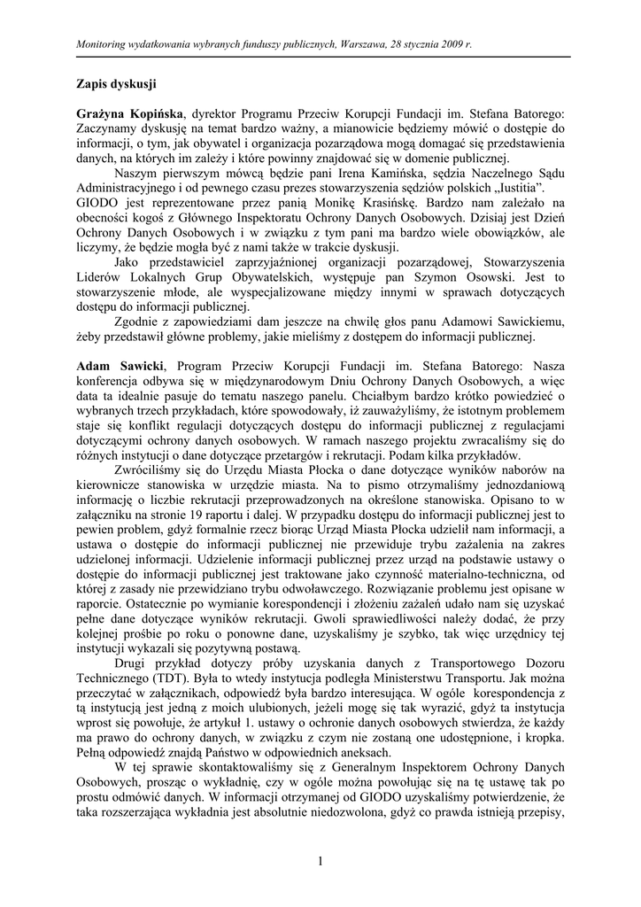 Monitoring wydatkowania wybranych funduszy publicznych, Warszawa, 28 stycznia 2009 r. Zapis dyskusji Grażyna Kopińska, dyrektor Programu Przeciw Korupcji Fundacji im. Stefana Batorego: Zaczynamy dyskusję na temat bardzo ważny, a mianowicie będziemy mówić o dostępie do informacji, o tym, jak obywatel i organizacja pozarządowa mogą domagać się przedstawienia danych, na których im zależy i które powinny znajdować się w domenie publicznej. Naszym pierwszym mówcą będzie pani Irena Kamińska, sędzia Naczelnego Sądu Administracyjnego i od pewnego czasu prezes stowarzyszenia sędziów polskich „Iustitia”. GIODO jest reprezentowane przez panią Monikę Krasińskę. Bardzo nam zależało na obecności kogoś z Głównego Inspektoratu Ochrony Danych Osobowych. Dzisiaj jest Dzień Ochrony Danych Osobowych i w związku z tym pani ma bardzo wiele obowiązków, ale liczymy, że będzie mogła być z nami także w trakcie dyskusji. Jako przedstawiciel zaprzyjaźnionej organizacji pozarządowej, Stowarzyszenia Liderów Lokalnych Grup Obywatelskich, występuje pan Szymon Osowski. Jest to stowarzyszenie młode, ale wyspecjalizowane między innymi w sprawach dotyczących dostępu do informacji publicznej. Zgodnie z zapowiedziami dam jeszcze na chwilę głos panu Adamowi Sawickiemu, żeby przedstawił główne problemy, jakie mieliśmy z dostępem do informacji publicznej. Adam Sawicki, Program Przeciw Korupcji Fundacji im. Stefana Batorego: Nasza konferencja odbywa się w międzynarodowym Dniu Ochrony Danych Osobowych, a więc data ta idealnie pasuje do tematu naszego panelu. Chciałbym bardzo krótko powiedzieć o wybranych trzech przykładach, które spowodowały, iż zauważyliśmy, że istotnym problemem staje się konflikt regulacji dotyczących dostępu do informacji publicznej z regulacjami dotyczącymi ochrony danych osobowych. W ramach naszego projektu zwracaliśmy się do różnych instytucji o dane dotyczące przetargów i rekrutacji. Podam kilka przykładów. Zwróciliśmy się do Urzędu Miasta Płocka o dane dotyczące wyników naborów na kierownicze stanowiska w urzędzie miasta. Na to pismo otrzymaliśmy jednozdaniową informację o liczbie rekrutacji przeprowadzonych na określone stanowiska. Opisano to w załączniku na stronie 19 raportu i dalej. W przypadku dostępu do informacji publicznej jest to pewien problem, gdyż formalnie rzecz biorąc Urząd Miasta Płocka udzielił nam informacji, a ustawa o dostępie do informacji publicznej nie przewiduje trybu zażalenia na zakres udzielonej informacji. Udzielenie informacji publicznej przez urząd na podstawie ustawy o dostępie do informacji publicznej jest traktowane jako czynność materialno-techniczna, od której z zasady nie przewidziano trybu odwoławczego. Rozwiązanie problemu jest opisane w raporcie. Ostatecznie po wymianie korespondencji i złożeniu zażaleń udało nam się uzyskać pełne dane dotyczące wyników rekrutacji. Gwoli sprawiedliwości należy dodać, że przy kolejnej prośbie po roku o ponowne dane, uzyskaliśmy je szybko, tak więc urzędnicy tej instytucji wykazali się pozytywną postawą. Drugi przykład dotyczy próby uzyskania danych z Transportowego Dozoru Technicznego (TDT). Była to wtedy instytucja podległa Ministerstwu Transportu. Jak można przeczytać w załącznikach, odpowiedź była bardzo interesująca. W ogóle korespondencja z tą instytucją jest jedną z moich ulubionych, jeżeli mogę się tak wyrazić, gdyż ta instytucja wprost się powołuje, że artykuł 1. ustawy o ochronie danych osobowych stwierdza, że każdy ma prawo do ochrony danych, w związku z czym nie zostaną one udostępnione, i kropka. Pełną odpowiedź znajdą Państwo w odpowiednich aneksach. W tej sprawie skontaktowaliśmy się z Generalnym Inspektorem Ochrony Danych Osobowych, prosząc o wykładnię, czy w ogóle można powołując się na tę ustawę tak po prostu odmówić danych. W informacji otrzymanej od GIODO uzyskaliśmy potwierdzenie, że taka rozszerzająca wykładnia jest absolutnie niedozwolona, gdyż co prawda istnieją przepisy, 1 Monitoring wydatkowania wybranych funduszy publicznych, Warszawa, 28 stycznia 2009 r. które mogą wskazać pewną podstawę, ale nie są one kluczowe przy rozstrzyganiu w kwestii dostępu do informacji publicznej. Skierowaliśmy też pytanie do Ministerstwa, wtedy już Infrastruktury, dotyczące podstaw zatrudniania w TDT, bo skoro nie możemy uzyskać tych danych, to przynajmniej chcielibyśmy się dowiedzieć, na jakiej podstawie są zatrudniani pracownicy tego urzędu. Dowiedzieliśmy się, że taki urząd jak TDT jest państwową osobą prawną i nie wchodzi w skład administracji państwowej, w związku z tym opiera swoją rekrutację na wewnętrznym regulaminie. To troszeczkę nietypowe, że instytucja, która działa w imieniu państwa - w tym przypadku instytucja pełniąca ważną rolę, jeżeli chodzi o bezpieczeństwo transportu - nie ujawnia danych dotyczących rekrutacji. Ostatnia, gigantyczna instytucja, to Poczta Polska. Do niej także zwróciliśmy się o informacje dotyczące rekrutacji i w odpowiedzi dostaliśmy dane dotyczące wyników postępowań w formie tabelarycznej – obejmujące stanowisko, liczbę chętnych i liczbę rozstrzygniętych konkursów, ale bez kluczowej informacji w postaci imienia i nazwiska zatrudnionego. W ostatnim zdaniu pisma Poczta Polska wprost stwierdza, że pozostałe dane dotyczące rekrutacji, między innymi imię i nazwisko zwycięzcy, nie mogą być ujawnione ze względu na ochronę danych osobowych. Koniec, kropka. Nie powołano się na konkretny artykuł ani na jakąkolwiek szczegółową podstawę prawną. Taka postawa była bardzo częsta w kontaktach z innymi instytucjami. I to właśnie spowodowało, że uznaliśmy, iż ten problem będzie narastał. Im częściej obywatele będą zgłaszać się do różnych instytucji o dane osobowe na podstawie prawa dostępu do informacji publicznej, tym cz