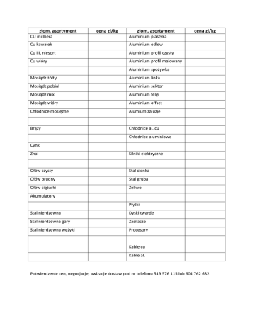 złom, asortyment cena zł/kg złom, asortyment CU millbera Aluminium plastyka Cu kawałek Aluminium odlew Cu III, niesort Aluminium profil czysty Cu wióry Aluminium profil malowany cena zł/kg Aluminium spożywka Mosiądz żółty Aluminium linka Mosiądz pobiał Aluminium sektor Mosiądz mix Aluminium felgi Mosiądz wióry Aluminium offset Chłodnice mosiężne Alumium żaluzje Brązy Chłodnice al. cu Chłodnice aluminiowe Cynk Znal Silniki elektryczne Ołów czysty Stal cienka Ołów brudny Stal gruba Ołów ciężarki Żeliwo Akumulatory Płytki Stal nierdzewna Dyski twarde Stal nierdzewna gary Zasilacze Stal nierdzewna wężyki Procesory Kable cu Kable al. Potwierdzenie cen, negocjacje, awizacje dostaw pod nr telefonu 519 576 115 lub 601 762 632.
