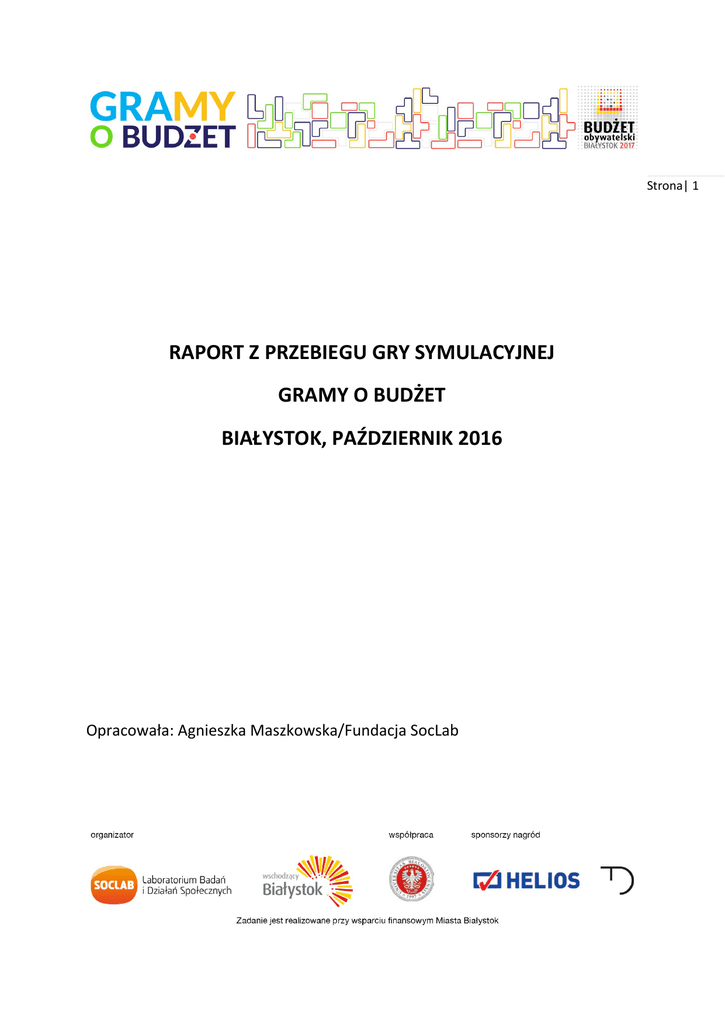 Strona| 1 RAPORT Z PRZEBIEGU GRY SYMULACYJNEJ GRAMY O BUDŻET BIAŁYSTOK, PAŹDZIERNIK 2016 Opracowała: Agnieszka Maszkowska/Fundacja SocLab Strona| 2 GRAMY O BUDŻET to dostosowana do realiów białostockiego Budżetu Obywatelskiego wersja Gry o Budżet – innowacyjnego narzędzia edukacji, konsultacji i aktywizacji obywatelskiej. Gra symulacyjna powstała zainspirowana amerykańską Budget Games stworzoną przez Innovation Games®. Amerykański pierwowzór od 2011 r. pomaga mieszkańcom i władzom San Jose w dyskusji na temat budżetu miasta. Jej polska wersja została zaadaptowana do krajowych realiów, a jej celem jest zwiększenie poczucia współodpowiedzialności mieszkańców za miejskie finanse. GRAMY O BUDŻET – białostocka rozgrywka gry symulacyjnej odbyła się 10 października br. na Kampusie Uniwersytetu w Białymstoku. Zgromadziła kilkadziesiąt osób, które przy czterech stolikach dyskutowały nad wyborem projektów ogólnomiejskich zgłoszonych w tegorocznym Budżecie Obywatelskim w Białymstoku. Organizatorem była Fundacja SocLab. Po blisko dwugodzinnym spotkaniu, wskazano wybrane projekty. Największym poparciem cieszyły się projekty ogólnomiejskie o numerach: 6 - Sprytne ławki w Białymstoku, 11 - Budowa punktów ratowniczych na terenie miasta Białystok 22 - Siłownia pod chmurką w Parku Planty 25 - Parametryczny Białystok - ich realizację poparło 100% dyskutujących grup (4 stoliki) Kolejne wskazania (z 75% poparciem – 3 stoliki) uzyskały projekty nr: 2 - Centrum szkoleń pierwszej pomocy i bezpieczeństwa 12 - Instalacja upamiętniająca Wiktora Wołkowa 15 - Białostocki Park Sztuki - Przestrzeń wystawienniczo-rekreacyjna. 50% grup (2 stoliki) wybrało również projekty nr: 7 - Remont nawierzchni na alejce odchodzącej od bulwarów Blicharskiego, 16 - II Festiwal Piłki Ręcznej Miasta Białystok, 18 - Uzupełnienie przejazdów rowerowych na 4 skrzyżowaniach, 20 - Młodzieżowy plac zabaw przy ul. Pogodnej 23 - Park przy Szkolnej - zielone miejsce wypoczynku. 25% poparcia (jeden stolik) uzyskały projekty nr: 1 - Białystok buduje strzelnicę 8 - Koszykówka dla wszystkich dzieci Białegostoku 14 - Bulwary Świętego Jana Teologa - etap II 17 - Figura św. Floriana – Rynek Kościuszki 21 - Skatepark na Wygodzie 24 - Czyste powietrze w Białymstoku Szczegóły dotyczące zrealizowanych projektów 6 - Sprytne ławki w Białymstoku – projekt zrealizowany przez wszystkie stoliki Opis Projekt zakłada instalację sześciu „sprytnych ławek” solarnych z dostępem do Internetu. Ławki mają mieć możliwość ładowania telefonów komórkowych, a także dodatkowy akumulator i możliwość ładowania za pomocą energii słonecznej. Strona| 3 Argumenty za: • • • • • • • • • nowoczesny wizerunek miasta dostępność do internetu dla wszystkich możliwość doładowania baterii w telefonie młodzi ludzie (rozwój) doścignięcie cywilizacyjne, ciekawy projekt ekologiczny w użytkowaniu sam się finansuje, promocja nowych źródeł energii innowacyjny 11 - Budowa punktów ratowniczych na terenie miasta Białystok – projekt zrealizowany przez wszystkie stoliki Opis Projekt zakłada stworzenie punktów ratowniczych (15 sztuk) poprzez montaż skrzynek z defibrylatorami typu AED. Punkt będzie posiadał system automatycznego powiadamiania służb ratowniczych o otwarciu skrzynki z defibrylatorem. Argumenty za: • • • • • • • • • wdrożenie systemu bezpieczeństwa, oswojenie/uwrażliwienie na możliwość pomocy/reagowania, szeroka dostępność sprzętu ratującego życie ważna infrastruktura ratownicza dobra cena przyda się wszystkim mieszkańcom, ale oby nikomu koło ratunkowe wzrost bezpieczeństwa mieszkańców konieczność połączenia z projektem edukacyjnym Strona| 4 22 - Siłownia pod chmurką w Parku Planty – projekt zrealizowany przez wszystkie stoliki Opis Projekt zakłada stworzenie w centrum miasta ogólnodostępnej, wyposażonej w zróżnicowane sprzęty do ćwiczeń siłowni pod chmurką. Argumenty za: • • • • kształtowanie sportowych sylwetek odciągamy od komputera aktywne, atrakcyjne spędzanie wolnego czasu poprawa stanu zdrowia i tężyzny fizycznej mieszkańców Białegostoku • • • • • dobre miejsce, dostępne dla wszystkich znajomość lokalizacji w zdrowym ciele zdrowy duch aktywność trzech pokoleń- mamuśki, studenci, emeryci zagospodarowanie pustego (po byłym placu zabaw) terenu 25 - Parametryczny Białystok – projekt zrealizowany przez wszystkie stoliki Opis Projekt obejmuje wykonanie ławki zaprojektowanej w technice parametrycznej wykonanej ze sklejki wodoodpornej według projektu zgodnego z ergonomią ludzkiego ciała o obłym kształcie. Argumenty za: • • • • • • • dizajnerski projekt, sztuka użytkowa centrum miasta pasuje do lokalizacji zaskakujący element przestrzeni w centrum miasta "zapchajdziura" integracja międzypokoleniowa zagospodarowanie artystyczne pustej przestrzeni Strona| 5 • możliwość skorzystania z bezpłatnego relaksu i rekreacji dla wszystkich mieszkańców 2 - Centrum szkoleń pierwszej pomocy i bezpieczeństwa – projekt zrealizowany przez trzy stoliki Opis Projekt zakłada remont budynku przy ul. Mazowieckiej 31/1 oraz przeprowadzenie kursów pierwszej pomocy na trzech poziomach zaawansowania, w których zostanie przeszkolonych 2450 osób. Po zakończeniu części szkoleniowej Centrum będzie czynne w dni robocze przez 8 godzin dziennie. Na zewnątrz budynku zostanie dodatkowo zainstalowany ogólnodostępny automatyczny defibrylator AED. Argumenty za: • • • • • • • szeroka grupa odbiorców odnowienie zabytkowego budynku, rewitalizacja budynku, szerzenie edukacji wzrost bezpieczeństwa, promocja wiedzy o ratowaniu życia, aktywizacja młodzieży, stały dostęp do szkoleń 12 - Instalacja upamiętniająca Wiktora Wołkowa – projekt zrealizowany przez trzy stoliki Opis Projekt zakłada stworzenie w 