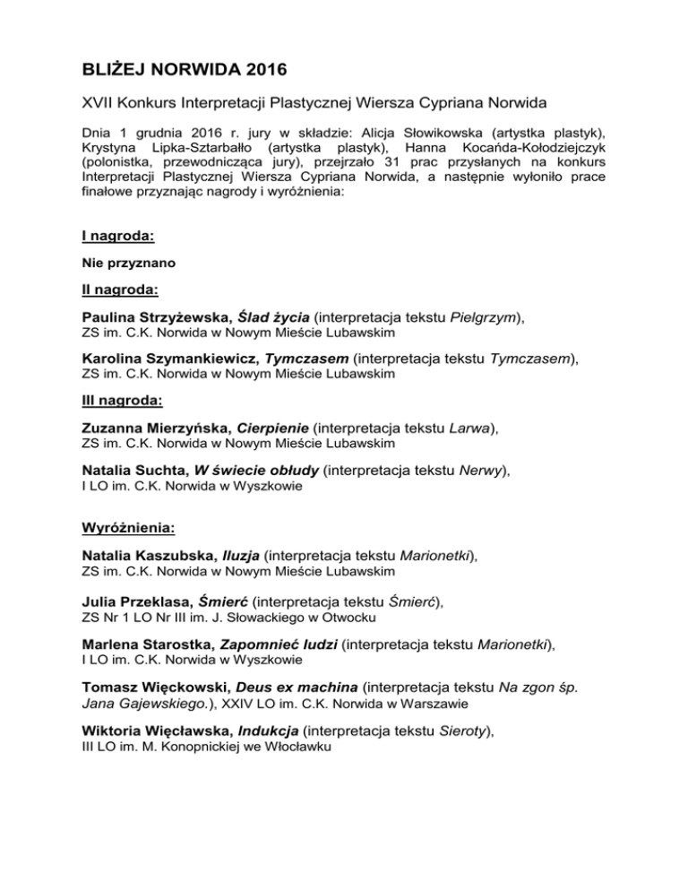BLIŻEJ NORWIDA 2016 XVII Konkurs Interpretacji Plastycznej Wiersza Cypriana Norwida Dnia 1 grudnia 2016 r. jury w składzie: Alicja Słowikowska (artystka plastyk), Krystyna Lipka-Sztarbałło (artystka plastyk), Hanna Kocańda-Kołodziejczyk (polonistka, przewodnicząca jury), przejrzało 31 prac przysłanych na konkurs Interpretacji Plastycznej Wiersza Cypriana Norwida, a następnie wyłoniło prace finałowe przyznając nagrody i wyróżnienia: I nagroda: Nie przyznano II nagroda: Paulina Strzyżewska, Ślad życia (interpretacja tekstu Pielgrzym), ZS im. C.K. Norwida w Nowym Mieście Lubawskim Karolina Szymankiewicz, Tymczasem (interpretacja tekstu Tymczasem), ZS im. C.K. Norwida w Nowym Mieście Lubawskim III nagroda: Zuzanna Mierzyńska, Cierpienie (interpretacja tekstu Larwa), ZS im. C.K. Norwida w Nowym Mieście Lubawskim Natalia Suchta, W świecie obłudy (interpretacja tekstu Nerwy), I LO im. C.K. Norwida w Wyszkowie Wyróżnienia: Natalia Kaszubska, Iluzja (interpretacja tekstu Marionetki), ZS im. C.K. Norwida w Nowym Mieście Lubawskim Julia Przeklasa, Śmierć (interpretacja tekstu Śmierć), ZS Nr 1 LO Nr III im. J. Słowackiego w Otwocku Marlena Starostka, Zapomnieć ludzi (interpretacja tekstu Marionetki), I LO im. C.K. Norwida w Wyszkowie Tomasz Więckowski, Deus ex machina (interpretacja tekstu Na zgon śp. Jana Gajewskiego.), XXIV LO im. C.K. Norwida w Warszawie Wiktoria Więcławska, Indukcja (interpretacja tekstu Sieroty), III LO im. M. Konopnickiej we Włocławku