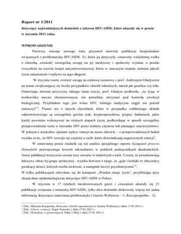 Raport nr 1/2011 dotyczący najważniejszych doniesień z zakresu HIV/AIDS, które ukazały się w prasie w styczniu 2011 roku. WPROWADZENIE Pierwszy miesiąc nowego roku przyniósł niewiele publikacji bezpośrednio związanych z problematyką HIV/AIDS. Te, które jej dotyczyły, omawiały wieloletnią walkę z chorobą, zwracały szczególną uwagę na jej medyczny i społeczny wymiar, a przede wszystkim na rozwój terapii antyretrowirusowej, która w znacznym stopniu zmienia jakość życia zakażonych i wpływa na jego długość. W styczniu warto zwrócić uwagę na ciekawą rozmowę z prof. Andrzejem Gładyszem na temat zwiększającej się liczby przypadków chorób zakaźnych, takich jak gruźlica czy kiła. Omawiając złożone przyczyny takiego stanu rzeczy, prof. Gładysz podkreśla, „że żyjąc w środowisku mocno chemizowanym, nie potrafimy utrzymać pod kontrolą ewolucji biologicznej. Przykładem tego jest wirus HIV, którego medycyna ciągle nie potrafi zniszczyć”1. Pisano też o innych chorobach, które w przypadku osłabionego układu odpornościowego są szczególnie groźne (rak, kryptosporydioza, grypa); badaniach, jakie każdy powinien wykonywać na różnych etapach życia, podkreślając w sposób szczególny przeprowadzenie testu w kierunku HIV przez kobiety ciężarne lub planujące macierzyństwo. W jednym z artykułów opisano wpływ emocji na nasze zdrowie - z przeprowadzonych badań wynika m.in., że HIV rozwija się częściej u osób, które doświadczają negatywnych emocji2. W omawianej prasie znalazła się też analiza specjalnego raportu Kampanii przeciw Homofobii poświęconego kwestii seksualności w polskich podręcznikach akademickich. Autor publikacji krytycznie ocenia tezy zawarte w niektórych z nich. Uważa, że przedstawiają fałszywy obraz tej grupy społecznej - wynika bowiem z niego, że „geje i lesbijki to zboczeńcy gwałcący dzieci, których trzeba izolować, a następnie leczyć psychiatrycznie” 3. W kilku publikacjach odwołano się do kampanii „Wiedza ratuje życie”, przybliżając przy okazji dane epidemiologiczne dotyczące HIV/AIDS w Polsce. W styczniu w 17 tytułach monitorowanych gazet i czasopism ukazały się 23 publikacje związane z tematyką HIV/AIDS, tylko dwa dzienniki drukowały więcej niż jedną informację dotycząca omawianej problematyki ( Gazeta Wyborcza – 5, Rzeczpospolita – 2). 1 Zob.: Marzena Kacperska. Renesans chorób zapomnianych. Gazeta Wyborcza z dnia 17.01.2011 r. Zob.: Chorzy z emocji. Super Nowości z dnia 27.01.2011 r. 3 Zob.: Homofony w gronostajach. Fakty i Mity z dnia 27.01.2011 r. 2 EPIDEMIOLOGIA Zmagania z HIV Od prawie 30 lat świat walczy z epidemią AIDS, która -mimo ostatnich danych UNAIDS o jej zahamowaniu - wciąż jest groźna i wymaga nieustannego podejmowania działań profilaktycznych. Mimo braku odpowiedniej szczepionki, medycyna odniosła znaczny sukces w walce z AIDS. Dzisiaj osoba zakażona HIV ma szanse dożyć tego samego wieku, co osoba HIV- ujemna, pod warunkiem, że zostanie otoczona odpowiednią opieką i będzie przestrzegała zaleceń lekarskich. Wspólną cechą epidemii na całym świecie jest fakt, że HIV dotyka przede wszystkim osoby młode. Prawie 40 proc. zakażonych ma od 15 do 24 lat. W Polsce obserwuje się podobną tendencję: 47 proc. wszystkich zakażeń wykryto u osób pomiędzy 20 – 29. rokiem życia, a 7 proc. żyjących z HIV ma mniej niż 20 lat. Dla osób zakażonych najważniejsza jest dostępność leków antyretrowirusowych, które hamują namnażanie się wirusa, a dzięki temu wydłużają czas życia i poprawiają jego jakość. Na świecie do tego typu leczenia ma dostęp tylko 25 proc. zakażonych. Jeszcze gorzej sytuacja wygląda w Europie Wschodniej i Azji Środkowej, gdzie terapią przeciwwirusową objętych jest zaledwie 19 proc. chorych. W Polsce nie ma żadnych ograniczeń ani kolejek. Terapią objęty jest każdy, kto się do tego kwalifikuje. Od 2001 roku realizowany jest specjalny program Ministerstwa Zdrowia. Leczenie antyretrowirusowe i badania sprawdzające skuteczność terapii finansowane są przez państwo. W 2010 roku terapią było objętych 4820 pacjentów, w tym 135 dzieci, wydano na nią 196 mln złotych. To dwukrotnie więcej niż trzy lata wcześniej i o 53 mln zł więcej niż w 2009 r. Na leczenie jednego chorego budżet przeznacza ok. 35 tys. zł. rocznie. Gdy 30 lat temu pojawiły się pierwsze doniesienia na temat AIDS, diagnoza „zakażenie HIV” brzmiała jak wyrok. Na rynku dostępny był tylko jeden lek przeciwwirusowy, zydowudyna, który w ograniczonym zakresie hamował namnażanie się wirusa i nie zawsze był skuteczny. Od tego czasu w tej dziedzinie medycyna zrobiła milowy krok do przodu. W 1996 roku podczas konferencji w Vancouver zaproponowano i zapoczątkowano erę HAART – intensywnej wielolekowej terapii. Teraz mamy do dyspozycji sześć nowych grup leków stosowanych w terapii antyretrowirusowej, które są dostępne w Polsce. Ogromny postęp nastąpił również w genetyce – testy genetyczne nie tylko wykrywają wirusa, ale precyzyjnie opisują jego rozwój, sugerują moment rozpoczęcia leczenia i właściwy dobór leków, a także monitorują ich skuteczność. Eksperci zwracają uwagę, że w zakażeniu HIV najważniejszy jest pierwszy schemat leczenia, ponieważ decyduje on o dalszym przebiegu choroby. Trzeba go bardzo precyzyjnie skonstruować, aby osiągnąć cel – obniżyć obecność wirusa HIV do poziomu niewykrywalnego dla stosowanych obecnie metod diagnostycznych. Lekarze zajmujący się zakażonymi HIV mają do dyspozycji prawie 30 leków antyretrowirusowych. Wciąż prowadzone są badania nad innymi lekami, o nowych mechanizmach działania lub bardziej przyjaznym dla pacjenta sposobie przyjmowania, a ich efekty omawiane są m.in. na odbywającym się co dwa lata międzynarodowym kongresie lekarzy zajmujących się leczeniem HIV/AIDS. Podczas jubileuszowego 10. spot