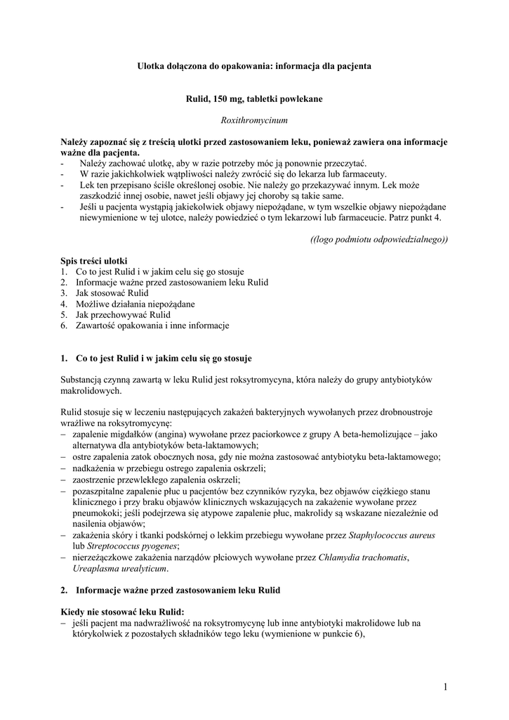 Ulotka dołączona do opakowania: informacja dla pacjenta Rulid, 150 mg, tabletki powlekane Roxithromycinum Należy zapoznać się z treścią ulotki przed zastosowaniem leku, ponieważ zawiera ona informacje ważne dla pacjenta. Należy zachować ulotkę, aby w razie potrzeby móc ją ponownie przeczytać. W razie jakichkolwiek wątpliwości należy zwrócić się do lekarza lub farmaceuty. Lek ten przepisano ściśle określonej osobie. Nie należy go przekazywać innym. Lek może zaszkodzić innej osobie, nawet jeśli objawy jej choroby są takie same. Jeśli u pacjenta wystąpią jakiekolwiek objawy niepożądane, w tym wszelkie objawy niepożądane niewymienione w tej ulotce, należy powiedzieć o tym lekarzowi lub farmaceucie. Patrz punkt 4. ((logo podmiotu odpowiedzialnego)) Spis treści ulotki 1. Co to jest Rulid i w jakim celu się go stosuje 2. Informacje ważne przed zastosowaniem leku Rulid 3. Jak stosować Rulid 4. Możliwe działania niepożądane 5. Jak przechowywać Rulid 6. Zawartość opakowania i inne informacje 1. Co to jest Rulid i w jakim celu się go stosuje Substancją czynną zawartą w leku Rulid jest roksytromycyna, która należy do grupy antybiotyków makrolidowych. Rulid stosuje się w leczeniu następujących zakażeń bakteryjnych wywołanych przez drobnoustroje wrażliwe na roksytromycynę: zapalenie migdałków (angina) wywołane przez paciorkowce z grupy A beta-hemolizujące – jako alternatywa dla antybiotyków beta-laktamowych; ostre zapalenia zatok obocznych nosa, gdy nie można zastosować antybiotyku beta-laktamowego; nadkażenia w przebiegu ostrego zapalenia oskrzeli; zaostrzenie przewlekłego zapalenia oskrzeli; pozaszpitalne zapalenie płuc u pacjentów bez czynników ryzyka, bez objawów ciężkiego stanu klinicznego i przy braku objawów klinicznych wskazujących na zakażenie wywołane przez pneumokoki; jeśli podejrzewa się atypowe zapalenie płuc, makrolidy są wskazane niezależnie od nasilenia objawów; zakażenia skóry i tkanki podskórnej o lekkim przebiegu wywołane przez Staphylococcus aureus lub Streptococcus pyogenes; nierzeżączkowe zakażenia narządów płciowych wywołane przez Chlamydia trachomatis, Ureaplasma urealyticum. 2. Informacje ważne przed zastosowaniem leku Rulid Kiedy nie stosować leku Rulid: jeśli pacjent ma nadwrażliwość na roksytromycynę lub inne antybiotyki makrolidowe lub na którykolwiek z pozostałych składników tego leku (wymienione w punkcie 6), jeśli pacjent jednocześnie stosuje alkaloidy sporyszu – leki zwężające naczynia krwionośne, np. stosowane podczas migreny (takie jak: ergotamina, dihydroergotamina, bromokryptyna) jeśli pacjent jednocześnie stosuje takie leki, jak np. cyzapryd, astemizol, pimozyd lub terfenadyna (patrz podrozdziały Ostrzeżenia i środki ostrożności oraz Rulid a inne leki). W razie jakichkolwiek wątpliwości należy zwrócić się do lekarza. Ostrzeżenia i środki ostrożności Przed rozpoczęciem stosowania leku Rulid należy to omówić z lekarzem. Podczas jednoczesnego podawania antybiotyków makrolidowych i alkaloidów sporyszu o kurczącym działaniu na naczynia krwionośne występowały przypadki silnego zwężenia naczyń (zatrucie sporyszem), z możliwą martwicą kończyn. Jeżeli pacjent przyjmuje alkaloidy sporyszu, powinien o tym powiedzieć lekarzowi przed rozpoczęciem stosowania roksytromycyny. Po zastosowaniu roksytromycyny występowały przypadki ciężkich pęcherzowych reakcji skórnych, takich jak zespół Stevensa-Johnsona (SJS) lub toksyczne martwicze oddzielanie się naskórka (TEN) (patrz punkt 4.). Jeśli u pacjenta stwierdzi się objawy przedmiotowe lub podmiotowe SJS lub TEN (np postępująca wysypka często z pęcherzami lub zmiany na błonach śluzowych), leczenie lekiem Rulid należy przerwać. Nie jest konieczna modyfikacja dawki u pacjentów w podeszłym wieku. U pacjentów z ciężką niewydolnością wątroby stosowanie roksytromycyny nie jest wskazane. Należy zachować szczególną ostrożność podczas stosowania roksytromycyny u pacjentów z lekką do umiarkowanej niewydolnością wątroby. Nerkowe wydalanie roksytromycyny i jej metabolitów stanowi około 10% dawki doustnej. W niewydolności nerek dawkowanie pozostaje bez zmian. Zaleca się kontrolowanie czynności wątroby i nerek oraz morfologii krwi, zwłaszcza podczas długotrwałego leczenia (tzn. dłużej niż 2 tygodnie; patrz punkt Możliwe działania niepożądane). Roksytromycyna, tak jak inne makrolidy, może powodować nasilenie miastenii. Choroba związana z Clostridium difficile Jeśli podczas lub po zakończeniu stosowania roksytromycyny występuje u pacjenta biegunka, zwłaszcza ciężka, uporczywa i (lub) krwawa, powinien to zgłosić lekarzowi, gdyż może być ona objawem rzekomobłoniastego zapalenia jelita grubego, wywołanego przez toksyny nadmiernie namnożonej w jelitach bakterii Clostridium difficile. Jeśli podejrzewa się rzekomobłoniaste zapalenie jelita grubego, należy natychmiast przerwać leczenie roksytromycyną. Zapalenie może mieć przebieg lekki lub ciężki. Lekkie zwykle ustępuje po odstawieniu leku. W cięższych przypadkach lekarz może zalecić przyjmowanie metronidazolu lub wankomycyny. Nie należy przyjmować leków hamujących perystaltykę ani innych działających zapierająco. Produkty lecznicze mogące wydłużać odstęp QT Należy zachować ostrożność podczas stosowania roksytromycyny u pacjentów przyjmujących inne leki, które mogą wydłużać odstęp QT (patrz punkt Inne leki i Rulid). Należą do nich leki przeciwarytmiczne klasy IA (np. chinidyna, prokainamid, dyzopiramid) i klasy III (np. dofetylid, amiodaron), cytalopram, trójcykliczne leki przeciwdepresyjne, metadon, niektóre leki przeciwpsychotyczne (np. fenotiazyny), fluorochinolony (np. moksyfloksacyna), niektóre leki przeciwgrzybicze (np. flukonazol, pentamidyna) oraz niektóre leki przeciwwirusowe (np. telaprewir). Roksytromycynę należy stosow