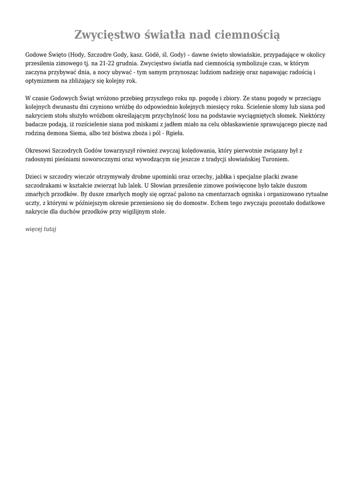 Zwycięstwo światła nad ciemnością Godowe Święto (Hody, Szczodre Gody, kasz. Gòdë, śl. Gody) – dawne święto słowiańskie, przypadające w okolicy przesilenia zimowego tj. na 21-22 grudnia. Zwycięstwo światła nad ciemnością symbolizuje czas, w którym zaczyna przybywać dnia, a nocy ubywać - tym samym przynosząc ludziom nadzieję oraz napawając radością i optymizmem na zbliżający się kolejny rok. W czasie Godowych Świąt wróżono przebieg przyszłego roku np. pogodę i zbiory. Ze stanu pogody w przeciągu kolejnych dwunastu dni czyniono wróżbę do odpowiednio kolejnych miesięcy roku. Ścielenie słomy lub siana pod nakryciem stołu służyło wróżbom określającym przychylność losu na podstawie wyciągniętych słomek. Niektórzy badacze podają, iż rozścielenie siana pod miskami z jadłem miało na celu obłaskawienie sprawującego pieczę nad rodziną demona Siema, albo też bóstwa zboża i pól - Rgieła. Okresowi Szczodrych Godów towarzyszył również zwyczaj kolędowania, który pierwotnie związany był z radosnymi pieśniami noworocznymi oraz wywodzącym się jeszcze z tradycji słowiańskiej Turoniem. Dzieci w szczodry wieczór otrzymywały drobne upominki oraz orzechy, jabłka i specjalne placki zwane szczodrakami w kształcie zwierząt lub lalek. U Słowian przesilenie zimowe poświęcone było także duszom zmarłych przodków. By dusze zmarłych mogły się ogrzać palono na cmentarzach ogniska i organizowano rytualne uczty, z którymi w późniejszym okresie przeniesiono się do domostw. Echem tego zwyczaju pozostało dodatkowe nakrycie dla duchów przodków przy wigilijnym stole. więcej tutaj