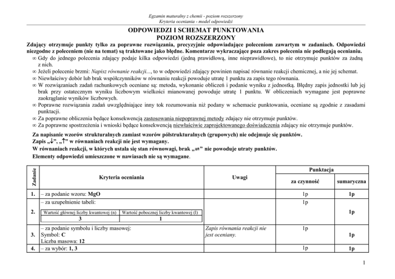 Egzamin maturalny z chemii - poziom rozszerzony Kryteria oceniania - model odpowiedzi ODPOWIEDZI I SCHEMAT PUNKTOWANIA POZIOM ROZSZERZONY Zdający otrzymuje punkty tylko za poprawne rozwiązania, precyzyjnie odpowiadające poleceniom zawartym w zadaniach. Odpowiedzi niezgodne z poleceniem (nie na temat) są traktowane jako błędne. Komentarze wykraczające poza zakres polecenia nie podlegają ocenianiu. • Gdy do jednego polecenia zdający podaje kilka odpowiedzi (jedną prawidłową, inne nieprawidłowe), to nie otrzymuje punktów za żadną z nich. • Jeżeli polecenie brzmi: Napisz równanie reakcji..., to w odpowiedzi zdający powinien napisać równanie reakcji chemicznej, a nie jej schemat. • Niewłaściwy dobór lub brak współczynników w równaniu reakcji powoduje utratę 1 punktu za zapis tego równania. • W rozwiązaniach zadań rachunkowych oceniane są: metoda, wykonanie obliczeń i podanie wyniku z jednostką. Błędny zapis jednostki lub jej brak przy ostatecznym wyniku liczbowym wielkości mianowanej powoduje utratę 1 punktu. W obliczeniach wymagane jest poprawne zaokrąglanie wyników liczbowych. • Poprawne rozwiązania zadań uwzględniające inny tok rozumowania niż podany w schemacie punktowania, oceniane są zgodnie z zasadami punktacji. • Za poprawne obliczenia będące konsekwencją zastosowania niepoprawnej metody zdający nie otrzymuje punktów. • Za poprawne spostrzeżenia i wnioski będące konsekwencją niewłaściwie zaprojektowanego doświadczenia zdający nie otrzymuje punktów. Za napisanie wzorów strukturalnych zamiast wzorów półstrukturalnych (grupowych) nie odejmuje się punktów. Zapis „↓”, „↑” w równaniach reakcji nie jest wymagany. W równaniach reakcji, w których ustala się stan równowagi, brak „⇄” nie powoduje utraty punktów. Elementy odpowiedzi umieszczone w nawiasach nie są wymagane. Zadanie Punktacja 1. 2. 3. 4. Kryteria oceniania Uwagi – za podanie wzoru: MgO – za uzupełnienie tabeli: Wartość głównej liczby kwantowej (n) Wartość pobocznej liczby kwantowej (l) 3 1 – za podanie symbolu i liczby masowej: Symbol: C Liczba masowa: 12 – za wybór: 1, 3 za czynność sumaryczna 1p 1p 1p 1p Zapis równania reakcji nie jest oceniany. 1p 1p 1p 1p 1 Egzamin maturalny z chemii - poziom rozszerzony Kryteria oceniania - model odpowiedzi 5a – za napisanie wzoru soli: M2CO3 5b – za ustalenie masy molowej: 39 g/mol przykład rozwiązania: 138 − (12 + 48) Mx = = 39 g/mol 2 6. – za napisanie wzoru jonu: HS − 7a – za podanie wartości stałej dysocjacji: 1,75 ·10-5 lub około 10-5 – za określenie odczynów wodnych roztworów dwóch soli: 7b odczyn NaX: zasadowy lub alkaliczny odczyn NH4Y: kwasowy lub kwaśny 8. – za napisanie: metyloamina – za metodę uwzględniającą zależność stężenia jonów H+ od stopnia dysocjacji: – za obliczenia i wynik: [H+] = 0,0001 mol/dm3 oraz pH = 4 przykład rozwiązania: 9. α ⋅ c 1 ⋅ 0,01 H+ H+ = = = 0,0001 mol / dm 3 α = ⋅ 100% 100 % 100 c [ ] 1p 1p Nie wymaga się zapisania obliczeń. – za określenie zakresów pH: woda amoniakalna: (pH) >7 11a woda chlorowa: (pH) < 7 woda wapienna: (pH) >7 – za napisanie równania: NH3 + H2O ⇄ NH4+ + OH − 2p 1p 1p 1p 1p 2p 1p 1p 1p 1p 2p [ ] pH=( – log10 – 4 ) = 4 - za napisanie wzorów: a) HCl 10. b) HBr c) HBr 11b Należy uznać wzór soli K2CO3. Za napisanie 3 prawidłowych wzorów – 2pkt; za napisanie 2 prawidłowych wzorów – 1pkt; za 1 prawidłowy wzór0 pkt. 2p 1p 2p 1p 2 Egzamin maturalny z chemii - poziom rozszerzony Kryteria oceniania - model odpowiedzi 12. 13. 14. 15. 16. 17. 18. 19. – za napisanie równania reakcji z H2SO4: (T) Sn + 4H2SO4 → Sn(SO4)2 + 2SO2 (↑) + 4H2O – za napisanie równania reakcji z HCl: (T) Sn + 2HCl → SnCl2 + H2 (↑) – za wybór: I, III, IV – za napisanie wzoru soli i podanie temperatury: NaNO3, 30 °C – za metodę: – za obliczenia i wynik z jednostką: 25 g przykład rozwiązania: W 100 g wody o temperaturze 20 °C rozpuszcza się 36 g NaCl 45 g – 36 g = 9 g. 9 g NaCl rozpuszcza się w 25 g wody lub 100 g H2O ––– 36 g NaCl x g H2O ––– 45 g NaCl x = 125 g H2O 125 g – 100 g = 25 g wody lub 45 36 26,47% = ⋅ 100% Cp = ⋅ 100% = 26,47% 45 + 100 + x 136 x = 25 g – za napisanie dwóch odpowiedzi: Szybkość procesu: zmniejszy się lub zmaleje oraz Wydajność procesu: zwiększy się lub wzrośnie – za zakwalifikowanie przemian: I endoenergetyczna lub endoII egzoenergetyczna lub egzoIII egzoenergetyczna lub egzo– za odpowiedź: Y – za uzupełnienie schematów: X2+ + 2e– → X i Y2+ + 2e– ← Y 1p 1p 2p 1p 1p 1p 1p 1p 2p Przy zastosowaniu tej metody obliczeń uznaje się wynik około 24,8 g. 2 x 1p 2p 1p 1p 1p 1p 1p 1p 3 Egzamin maturalny z chemii - poziom rozszerzony Kryteria oceniania - model odpowiedzi – za określenie odczynu roztworu: kwasowy lub kwaśny 20. – za napisanie równania reakcji: 2H2O + 2e − → H2(↑) + 2OH − lub 4H2O + 4e − → 2H2(↑) + 4OH − – za metodę: – za obliczenia i wynik z jednostką: 11,2 dm3 przykład rozwiązania: 21. 48250 C jest to ładunek 0,5 mola elektronów 2 mole elektronów – 2 mole gazów 2 mole elektronów – 44,8 dm3 gazów 0,5 mola elektronów – x x = 11,2 dm3 22a – za wybór odczynników: Al4C3 i HCl – za napisanie równanie reakcji: 22b Al4C3 + 12HCl → 3CH4 (↑) + 4AlCl3 – za podanie odpowiednich właściwości: Właściwość, która pozwala na zbieranie metanu nad wodą: Mała rozpuszczalność w wodzie lub nierozpuszczalny w wodzie, (oraz gęstość metanu jest mniejsza niż gęstość wody). 23. Właściwość, która pozwala na zbieranie metanu do naczynia odwróconego dnem do góry: Gęstość CH4 jest mniejsza od gęstości powietrza. lub metan jest lżejszy od powietrza. 1p 1p 2p 1p 1p Obliczenia mogą być wykonane oddzielnie dla każdej elektrody. Należy uznać za poprawne nazwy odczynników. 2p 1p 1p 2p 1p 1p 4 Egzamin matural