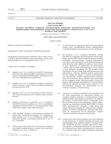 13/t. 30 PL Dziennik Urzędowy Unii Europejskiej 41 32002D0731 L 245/37 DZIENNIK URZĘDOWY WSPÓLNOT EUROPEJSKICH 12.9.2002 DECYZJA KOMISJI z dnia 30 maja 2002 r. dotycząca specyfikacji technicznej interoperacyjności podsystemu kontrolno-decyzyjnego oraz sygnalizacyjnego transeuropejskiego systemu kolei dużych prędkości, o którym mowa w art. 6 ust. 1 dyrektywy Rady 96/48/WE (notyfikowana jako dokument nr C(2002) 1947) (Tekst mający znaczenie dla EOG) (2002/731/WE) KOMISJA WSPÓLNOT EUROPEJSKICH, (7) W świetle raportu wstępnego, projekt TSI został poddany analizie przez przedstawicieli Państw Członkowskich w ramach Komitetu ustanowionego na mocy dyrektywy. (8) Jak określono w art. 1 dyrektywy 96/48/WE, warunki potrzebne do osiągnięcia interoperacyjności transeuropejskiego systemu kolei dużych prędkości dotyczą projektu, konstrukcji, unowocześnienia i działania infrastruktury oraz taboru, przyczyniających się do funkcjonowania systemu, który ma zostać oddany do użytku po dacie wejścia w życie dyrektywy. W odniesieniu do infrastruktury i taboru, jakie już będą funkcjonowały w czasie wejścia w życie niniejszej specyfikacji TSI, TSI powinna zostać zastosowana od czasu, kiedy będą wykonywane prace nad infrastrukturą i taborem. Jednakże stopień zastosowania TSI jest zależny od zakresu i rozmiaru przewidzianych prac oraz kosztów i zysków wygenerowanych zamierzonymi zastosowaniami. Aby te częściowe prace przyczyniły się do osiągnięcia pełnej interoperacyjności, muszą być poparte spójną strategią wdrożeniową. W tym kontekście powinno się oddzielić od siebie kwestie związane z unowocześnieniem urządzeń, ich odnowieniem czy też wymianą związaną z ich konserwacją. (9) Uznaje się, że dyrektywa 96/48/WE oraz specyfikacje TSI nie mają zastosowania do odnowienia maszyn czy wymiany urządzeń związanej z ich konserwacją. Istnieje jednak potrzeba zastosowania tej dyrektywy do odnawiania maszyn, co będzie miało miejsce w przypadku specyfikacji TSI dotyczącej konwencjonalnego systemu kolejowego na mocy dyrektywy Komisji 2001/16/WE (2). Wobec braku obowiązujących wymogów, a także biorąc pod uwagę zakres prac związanych z odnowieniem urządzeń, zachęca się Państwa Członkowskie, jeśli mają taką możliwość, do zastosowania TSI do odnawiania urządzeń i wymiany urządzeń związanej z konserwacją. (10) Istniejące linie kolei dużych prędkości oraz tabor kolejowy są już wyposażone w systemy kontrolno-decyzyjne oraz sygnalizacyjne, które spełniają zasadnicze wymogi dyrektywy 96/48/WE. Systemy te zostały opracowane i wdrożone zgodnie z przepisami krajowymi. W celu umożliwienia funkcjonowania służb interoperacyjnych konieczne jest rozwijanie interfejsów między istniejącymi systemami uwzględniając Traktat ustanawiający Wspólnotę Europejską, uwzględniając dyrektywę Rady 96/48/WE z dnia 23 lipca 1996 r. w sprawie interoperacyjności transeuropejskiego systemu kolei dużych prędkości (1), w szczególności jej art. 6 ust. 1, a także mając na uwadze, co następuje: (1) Zgodnie z art. 2 lit. c) dyrektywy 96/48/WE transeuropejski system kolei dużych prędkości podzielony jest na podsystemy strukturalne lub funkcjonalne. Podsystemy te opisane są w załączniku II do tej dyrektywy. (2) Zgodnie z art. 5 ust. 1 tej dyrektywy, każdy z tych podsystemów powinien zostać objęty specyfikacją techniczną interoperacyjności (TSI). (3) Zgodnie z art. 6 ust. 10 tej dyrektywy, projekt TSI powinien zostać sporządzony przez wspólny organ reprezentatywny. (4) Komitet utworzony na podstawie art. 21 dyrektywy 96/48/WE wyznaczył, zgodnie z art. 2 lit. h) tej dyrektywy, Europejskie Stowarzyszenie ds. Interoperacyjności Kolei (AEIF) jako wspólny organ reprezentatywny. (5) AEIF udzielono mandatu na sporządzenie projektu TSI podsystemu kontrolno-decyzyjnego oraz sygnalizacyjnego, zgodnie z art. 6 ust. 1 dyrektywy. Mandat został przyznany zgodnie z procedurą ustanowioną w art. 21 ust. 2 dyrektywy. (6) AEIF przygotowało projekt TSI wraz raportem wstępnym zawierającym analizę kosztów i zysków, jak zostało przewidziane w art. 6 ust. 3 dyrektywy. (1) Dz.U. L 235, z 17.9.1996, str. 6. (2) Dz.U. L 110, z 20.4.2001, str. 1. 42 PL Dziennik Urzędowy Unii Europejskiej oraz nowymi urządzeniami, kompatybilnymi z TSI. Podstawowe informacje dotyczące istniejących systemów podane są w załączniku B do dołączonej specyfikacji TSI. Biorąc pod uwagę, że weryfikacja interoperacyjności musi zostać ustalona w odniesieniu do TSI, zgodnie z art. 16 ust. 2 dyrektywy 96/48/WE, konieczne jest, podczas okresu przejściowego między opublikowaniem niniejszej decyzji a pełnym wdrożeniem dołączonej TSI, ustanowienie warunków, jakie muszą zostać spełnione w dodatku do załączonej TSI. Stąd też konieczne jest, aby każde z Państw Członkowskich poinformowało inne Państwa Członkowskie oraz Komisję, w odniesieniu do każdego z systemów wymienionych w załączniku B, o normach technicznych stosowanych w celu osiągnięcia interoperacyjności oraz spełnienia zasadniczych wymogów dyrektywy 96/48/WE. Dodatkowo, jako iż normy te są państwowe, konieczne jest, aby każde Państwo Członkowskie poinformowało inne Państwa Członkowskie oraz Komisję o organach jakie wyznacza w celu wypełnienia procedury oceny zgodności lub przydatności do wykorzystania, jak również procedury kontrolnej wykorzystywanej do weryfikacji interoperacyjności podsystemów w rozumieniu art. 16 ust. 2 dyrektywy 96/48/WE. Państwa Członkowskie powinny stosować w miarę możliwości zasady oraz kryteria przewidziane w dyrektywie 96/48/WE w celu wprowadzenia w życie art. 16 ust. 2 w przypadku wspomnianych przepisów krajowych. W przypadku organów odpowiedzialnych za te procedury, Państwa Członkowskie wykorzystają, w miarę możliwości, organy notyfikowane na mocy art. 20 dyrektywy 96/48/WE. Komisja przeprowadzi analiz