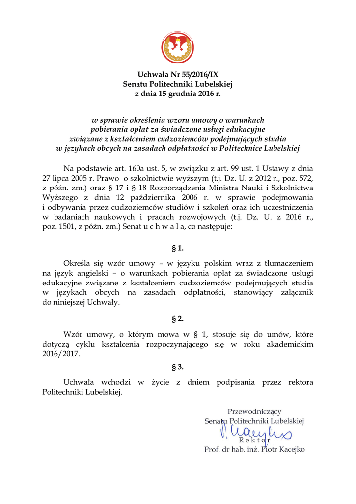 Uchwała Nr 55/2016/IX Senatu Politechniki Lubelskiej z dnia 15