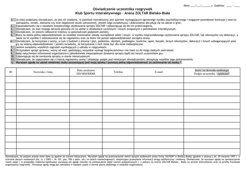 Data: ___/___/_______r Godzina: ____ : ____ Oświadczenie uczestnika rozgrywek Klub Sportu interaktywnego - Arena ZOLTAR Bielsko-Biała 1. Ja niżej podpisany oświadczam, że jest mi wiadome, iż paintball interaktywny jest sportem wymagającym ogromnego wysiłku psychofizycznego i mogącym powodować kontuzje [ otarcia, zadrapania, siniaki, złamania czy inne negatywne skutki zdrowotne]. Jestem tego świadomy(a) i dobrowolnie decyduję się na udział w grze. 2. Zapoznałem(am) się z zasadami bezpiecznego użytkowania sprzętu ZOLTAR i zobowiązuję się do ich przestrzegania. 3. Oświadczam, że stan mojego zdrowia pozwala mi na udział w działaniach ruchowych i innych związanych z paintballem interaktywnym. 4. Oświadczam, że jestem całkowicie trzeźwy co poświadczam podpisem poniżej. 5. Biorę na siebie pełną odpowiedzialność za wszelkie ewentualne szkody wyrządzone sobie i innym w wyniku nieprawidłowego użytkowania sprzętu ZOLTAR, lub rekwizytów czy dekoracji, a także za te wynikłe z niestosowania się do regulaminu oraz za które nie ponosi odpowiedzialności zarządca areny. 6. Oświadczam, że korzystam z areny, w tym z budowli z drewna i płyt, podestów, obniżeń, podbiegów, bunkrów, opon, beczek, skrzyń rekwizytów, dekoracji i innych wzbogacających pole gry na własną odpowiedzialność i jestem świadomy, że korzystanie z nich może być dla mnie niebezpieczne. 7. Jestem świadomy wszelkich zagrożeń wynikających z udziału w rozgrywkach. 8. Otrzymałem sprzęt sprawny, wolny od wad, spełniający wszystkie wymogi bezpieczeństwa i nie mam co do niego żadnych zastrzeżeń. 9. Będę natychmiast informował organizatora o jakimkolwiek niepożądanym działaniu sprzętu bądź też innych uczestników gry. 10. Zobowiązuję się do zwrócenia sprzętu w stanie nienaruszonym. 11. Oświadczam, że zapoznałem się z treścią regulaminu areny i składając podpis pod niniejszym oświadczeniem, akceptuję wszelkie jego postanowienia. 12. Wyrażam zgodę na udział nieletniej osoby pozostającej pod moją opieką i ponoszę pełną odpowiedzialność za zachowanie tej osoby.* ID Nazwisko i Imię Data urodzenia DD/MM/RRRR Telefon E-mail Seria i nr dowodu osobistego Podpis uczestnika / opiekuna* Oświadczam, że podane przeze mnie dane są zgodne ze stanem faktycznym. Wyrażam zgodę na przetwarzanie moich danych osobowych przez firmę "KATION" w Bielsku-Białej zgodnie z ustawą z dn. 29 sierpnia 1997 r. o ochronie danych osobowych (Dz. U. z 2002 r. Nr 101, poz. 926 z późn. zm.) w celach marketingowych, obejmujące przesyłanie informacji drogą telefoniczną i mailową. Oświadczam, że wyrażam zgodę na zamieszczenie moich zdjęć ( w przypadku rodziców/opiekunów wyrażają oni zgodę również na umieszczenie zdjęć swoich podopiecznych ) z pobytu na Arenie ZOLTAR Bielsko – Biała na stronie internetowej oraz na profilu Facebook organizatora rozgrywek. Powyższe zgody mogą być odwołane w każdym czasie w formie pisma złożonego w siedzibie organizatora.