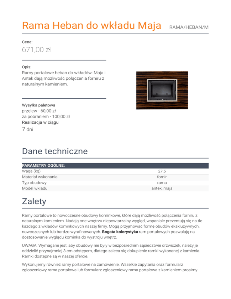 Rama Heban do wkładu Maja RAMA/HEBAN/M Cena: 671,00 zł Opis: Ramy portalowe heban do wkładów: Maja i Antek dają możliwość połączenia forniru z naturalnym kamieniem. Wysyłka paletowa przelew - 60,00 zł za pobraniem - 100,00 zł Realizacja w ciągu 7 dni Dane techniczne PARAMETRY OGÓLNE: Waga (kg) Materiał wykonania Typ obudowy Model wkładu 27,5 fornir rama antek, maja Zalety Ramy portalowe to nowoczesne obudowy kominkowe, które dają możliwość połączenia forniru z naturalnym kamieniem. Nadają one wnętrzu niepowtarzalny wygląd, wspaniale prezentują się na tle każdego z wkładów kominkowych naszej rmy. Mogą przyjmować formę obudów ekskluzywnych, nowoczesnych lub bardzo wyra nowanych. Bogata kolorystyka ram portalowych pozwalają na dostosowanie wyglądu kominka do wystroju wnętrz. UWAGA: Wymagane jest, aby obudowy nie były w bezpośrednim sąsiedztwie drzwiczek, należy je oddzielić przynajmniej 3 cm odstępem, dlatego zaleca się dokupienie ramki wykonanej z kamienia. Ramki dostępne są w naszej ofercie. Wykonujemy również ramy portalowe na zamówienie. Wszelkie zapytania oraz formularz zgłoszeniowy rama portalowa lub formularz zgłoszeniowy rama portalowa z kamieniem prosimy kierować na adres: [email protected]. Termin oczekiwania na realizacje zamówienia od 2 do 3 tygodni. Rama do wkładów: Maja i Antek Rysunek techniczny Opcje dodatkowe Ramka Botticino do wkładu Maja 250,00 zł Ramka o wkładów: Maja i Antek, wykonana jest z kamienia emperador brown oddziela ramę portalową od wkładu kominkowego. Ramka Breccia Sarda do wkładu Maja Ramka o wkładów: Maja i Antek, wykonana jest z kamienia emperador brown oddziela ramę portalową od wkładu kominkowego. 250,00 zł Ramka Crema Mar l do wkładu Maja 250,00 zł Ramka o wkładów: Maja i Antek, wykonana jest z kamienia emperador brown oddziela ramę portalową od wkładu kominkowego. Ramka Emperador do wkładu Maja 300,00 zł Ramka o wkładów: Maja i Antek, wykonana jest z kamienia emperador brown oddziela ramę portalową od wkładu kominkowego. Ramka Travertyn do wkładu Maja 300,00 zł Ramka o wkładów: Maja i Antek, wykonana jest z kamienia emperador brown oddziela ramę portalową od wkładu kominkowego. Zwrot Klient będący Konsumentem, który zawarł Umowę sprzedaży, może w terminie 14 dni odstąpić od niej bez podawania przyczyny. Bieg terminu na odstąpienie od Umowy sprzedaży rozpoczyna się od chwili objęcia Towaru w posiadanie przez Klienta lub wskazaną przez niego osobę trzecią inną niż przewoźnik. Oświadczenie można złożyć na formularzu, którego wzór został zamieszczony przez Sprzedawcę na Stronie Internetowej Sklepu pod adresem: formularz odstąpienia. Kratki.pl Marek Bal ul. W. Gombrowicza 4 26-660 Wsola/Jedlińsk www.kratki.com tel. 48 340 10 00 Data publikacji: 25.11.2016