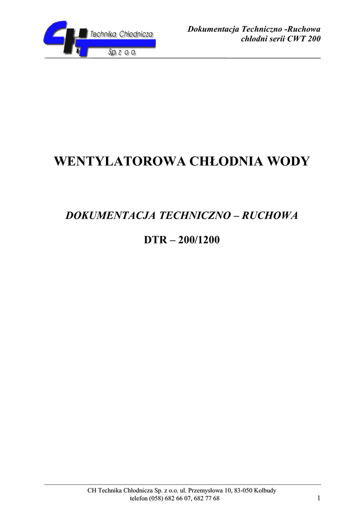 Dokumentacja Techniczno -Ruchowa chłodni serii CWT 200 WENTYLATOROWA CHŁODNIA WODY DOKUMENTACJA TECHNICZNO – RUCHOWA DTR – 200/1200 CH Technika Chłodnicza Sp. z o.o. ul. Przemysłowa 10, 83-050 Kolbudy telefon (058) 682 66 07, 682 77 68 1 Dokumentacja Techniczno -Ruchowa chłodni serii CWT 200 SPIS TREŚCI 1. WSTĘP 1.1 Przedmiot Dokumentacji Techniczno-Ruchowej .............................................. 3 1.2 Budowa chłodni..................................................................................................3 1.3 Zasada działania .................................................................................................3 2. PRZYGOTOWANIE CHŁODNI DO PRACY. 2.1 Zakres dostawy ...................................................................................................4 2.2 Ustawienie chłodni .............................................................................................4 2.3 Włączenie chłodni do instalacji ..........................................................................4 3. URUCHAMIANIE 3.1 Rozruch próbny ..................................................................................................4 3.2 Prace regulacyjne ............................................................................................... 5 3.3 Eksploatacja i obsługa ....................................................................................... 5 3.4 Zatrzymanie chłodni .......................................................................................... 6 4. WARUNKI PRAWIDŁOWEJ EKSPLOATACJI 4.1 Zakres prac .........................................................................................................7 4.2 Prace konserwacyjne ..........................................................................................7 4.3 Prace konserwacyjne i remontowe silnika elektrycznego .................................7 CH Technika Chłodnicza Sp. z o.o. ul. Przemysłowa 10, 83-050 Kolbudy telefon (058) 682 66 07, 682 77 68 2 Dokumentacja Techniczno -Ruchowa chłodni serii CWT 200 1. WSTĘP 1.1 Przedmiot Dokumentacji Techniczno-Ruchowej Przedmiotem niniejszej dokumentacji techniczno-ruchowej są wymagania stawiane wentylatorowym chłodniom wody typ CWT 200/1200 w zakresie montażu i projektowania instalacji, uruchomienia, eksploatacji, obsługi, konserwacji i remontów. W związku z ciągłym postępem technicznym producent zastrzega sobie prawo zmian konstrukcyjnych i dokumentacyjnych. 1.2 Budowa chłodni Chłodnia typu CWT 200/1200 zbudowana jest w postaci prostopadłościanu o podstawie kwadratowej i składa się z następujących zespołów: zespołu baterii, zespołu zbiornika zespołu wentylatorowego. 1.3 Zasada działania Wentylatorowe chłodnie wody typ CWT 200/1200 są prostymi wymiennikami ciepła, przy czym czynnikiem chłodzonym jest woda z obiegu cieplnego, czynnikiem chłodzącym powietrze czerpane z przestrzeni zewnętrznej. Woda ciepła z obiegu doprowadzana jest króćcem z zasilania oznaczonym symbolem Dn250 i rozpylona w baterii układu zraszania, woda przepływa grawitacyjnie przez kanały bloków wkładu kontaktowego do zespołu zbiornika. Przez okna wlotowe przepływa powietrze. Czynnik chłodzący przepływa przez baterię kanałami wkładów kontaktowych, a następnie kanałami odkraplacza. Ruch powietrza jest wymuszony mechanicznie wentylatorem. Dostęp do regulatora pływakowego oraz filtra możliwy jest po zdjęciu odpowiedniego okna wlotu powietrza, mocowanego do zbiornika za pomocą wkrętów. W przestrzeni baterii, a zwłaszcza w kanałach bloków kontaktowych następuje wymiana ciepła wody do powietrza w przeciwprądzie. Schłodzona powietrzem woda spływa do zespołu zbiornika, skąd króćcem odbioru Dn300 jest odbierana do obiegu cieplnego. Odbiór wody następuje pompą wirową o wielkości dobranej do projektowanego obiektu. Chwilowy nadmiar wody podany do chłodni usuwany jest króćcem przelewu. Strata wody w obiegu /odparowanie oraz unoszenie jej ze strumieniem powietrza/ uzupełniana jest króćcem uzupełnienia, który musi być podłączony do elektrozaworu (sterowanie sygnałem z regulatora czujnika CPW Z2 i sond konduktometrycznych EN1) opcjonalnie chłodnie są wyposażone w ten sam czujnik do zabezpieczenia pracą pomp przed suchobiegiem (którego nie obejmuje dostawa chłodni wody) lub do regulatora typu Quick Stop – zawór mechaniczny. Uzupełnienie wody realizowane jest z instalacji wodociągowej wody zimnej lub instalacji uzupełnienia wody. Chłodnia jest wyposażona w króciec spustu umieszczony w dolnej części ściany zbiornika, zaopatrzony w czasie normalnej eksploatacji w korek zaślepiający. Króciec spustu zapewnia odprowadzenie wody z zespołu zbiornika chłodni na okres jej wyłączenia z ruchu. Chłodnia może być wyposażona w termostat regulujący pracę wentylatora oraz inne przyrządy kontrolno-pomiarowe, w zależności od potrzeb wynikających z wymagań instalacyjnych obiegu. Urządzenia te nie wchodzą w zakres dostawy. (Chłodnie przystosowane do odbioru grawitacyjnego wody wyposażone są tylko: - w króciec odbioru Dn 300 umieszczony z boku lub w dnie zbiornika - ramę montażową w wersji bez zbiornika). CH Technika Chłodnicza Sp. z o.o. ul. Przemysłowa 10, 83-050 Kolbudy telefon (058) 682 66 07, 682 77 68 3 Dokumentacja Techniczno -Ruchowa chłodni serii CWT 200 2. PRZYGOTOWANIE CHŁODNI DO PRACY. 2.1 Zakres dostawy W zakres dostawy wyrobu wchodzi : - chłodnia wody CWT 200/1200 - dokumentacja techniczno - ruchowa DTR 200/1200, Scalenie chłodni pozostaje po stronie producenta. Zamawiający jest zobowiązany zapewnić pracę dźwigu 12t. na czas rozładunku i scalenia chłodni. W przypadku potrzeby przestawienia chłodni wody CWT 200/1200 nie wolno transportować jej za uchwyty montażowe, które służą tylko do scalenia chłodni wody. Transport może odbywać się jedynie przez opasanie chłodni wody do nogi montażowej. 2.2 Ustawienie chłodni C