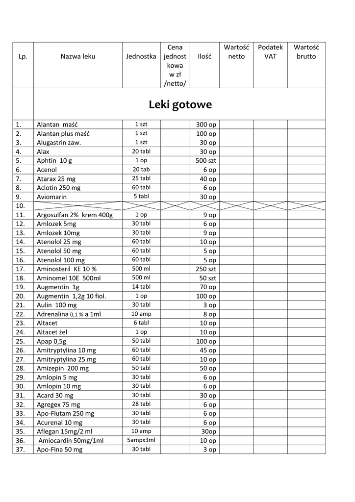 Lp. Nazwa leku Cena Jednostka jednost kowa w zł /netto/ Ilość Leki gotowe 1. 2. 3. 4. 5. 6. 7. 8. 9. 10. 11. 12. 13. 14. 15. 16. 17. 18. 19. 20. 21. 22. 23. 24. 25. 26. 27. 28. 29. 30. 31. 32. 33. 34. 35. 36. 37. Alantan maść Alantan plus maść Alugastrin zaw. Alax Aphtin 10 g Acenol Atarax 25 mg Aclotin 250 mg Aviomarin Argosulfan 2% krem 400g Amlozek 5mg Amlozek 10mg Atenolol 25 mg Atenolol 50 mg Atenolol 100 mg Aminosteril KE 10 % Aminomel 10E 500ml Augmentin 1g Augmentin 1,2g 10 fiol. Aulin 100 mg Adrenalina 0,1 % a 1ml Altacet Altacet żel Apap 0,5g Amitryptylina 10 mg Amitryptylina 25 mg Amizepin 200 mg Amlopin 5 mg Amlopin 10 mg Acard 30 mg Agregex 75 mg Apo-Flutam 250 mg Acurenal 10 mg Aflegan 15mg/2 ml Amiocardin 50mg/1ml Apo-Fina 50 mg 1 szt 1 szt 1 szt 20 tabl 1 op 20 tab 25 tabl 60 tabl 5 tabl 300 op 100 op 30 op 30 op 500 szt 6 op 40 op 6 op 30 op 1 op 30 tabl 30 tabl 60 tabl 60 tabl 60 tabl 500 ml 500 ml 14 tabl 1 op 30 tabl 10 amp 6 tabl 1 op 50 tabl 60 tabl 60 tabl 50 tabl 30 tabl 30 tabl 30 tabl 28 tabl 30 tabl 30 tabl 10 amp 5ampx3ml 30 tabl 9 op 6 op 9 op 10 op 5 op 5 op 250 szt 50 szt 70 op 100 op 3 op 8 op 10 op 10 op 100 op 45 op 10 op 50 op 6 op 6 op 30 op 6 op 6 op 6 op 30op 10 op 3 op Wartość netto Podatek VAT Wartość brutto 38. 39. 40. 41. 42. 43. 44. Accupro 10 mg Aldacton 200mg/10ml Acard 75mg ACC 200 mg ACC 600 mg ACC 300 a 3 ml Abactal 80 mg/ 1ml 45. 46. 47. 48. Abactal 400 mg Amaryl 1 mg Ascofer Amikin 500 mg 30 caps 10 amp 30 tabl 20 tabl 20 tabl 10 amp 10 amp x 5ml 10 tabl. 30 tabl 50 tabl 1 amp 49. 40. Ampicylina 1g Ampicylina 2 g 1 fiolka 1 fiolka 51. 52. 53. 54. 55. 56. 57. 58. 59. 60. 61. 62. 63. 64. 65. 66. 67. 68. 69. 70. 71. 72. 73. 74. 75. 76. 77. 78. 79. 80. Aescin maść 30g Aescin tabl Atropinum sulf. 0.5 mg/1ml Atropinum sulf. 1mg/ 1ml Atropinum suf kr. ocz.1% Atecortin zawiesina Ambroxol syrop 30mg/5ml Aspargin Aspirin C tabl. mus Aspimag Aurex 20 mg Amoxiclav 625 mg Amoxiclav 1g Amoksiklav 1,2g Anesteloc 40mg tabl Anesteloc 20mg tabl Agapurin SR 400 Agapurin Sr 600 Adavin 10 mg Albumina ludzka 20% Albumina ludzka 20% Ac. Folicum 5mg Ac. Folicum 15mg Allertec Aqu pro inj, amp 5 ml Aqu pro inj 250 ml Baclofen 10 mg Baclofen 25 Buscolizina 20mg/1ml Avilin balsam 50 ml 1 op 90 tabl 10 amp 10 amp 1 op 1 op 1 op 50 tabl 20 tabl 50 tabl 20 tabl 21 tabl 14 tabl 5 amp 28 tabl 28 tabl 20 tabl 20 tabl 50 tabl 50 ml 100 ml 30 tabl 30 tabl 30 tabl 100 amp 1 but 50 tabl 50 tabl 10 amp 1 op 3 op 10 op 10 op 10 op 30 op 70 op 50 op 6 op 6 op 5 op 300 amp 500 szt 1000 szt 10 op 10 op 5 op 3 op 5 op 10 op 9op 8 op 20 op 10 op 6 op 10 op 10 op 30 op 3 op 3 op 6 op 6 op 5 op 20 szt 20 szt 5 op 10 op 10 op 10 op 100 szt 25 op 10 op 20 op 10 op 81. 82. 83. 84. 85. 86. 87. 88. 89. 90. 91. Buscopan 10 mg 10 tabl 6 op Butapirazol 250 mg czopki Butapirazol 5% maść Bisacodyl 5mg Bisacodyl czopki 1 op 1 op 30 tabl 5 sztuk 10 op 30 op 6 op 150 op Biotropil 1200 mg Bupivacainum 0,5% a 10 ml Bupivacainum 0,5% a 20ml Biofuroxym 1,5 g 60 tabl 5 amp 10 amp 1 fiolka 92. Biotrakson 1g amp 1 fiolka 93. Biotrakson 2g amp 1 fiolka 94. 95. 96. 97. 98. 99. Biosotal 40 mg Biosotal 80 mg Biosotal 160 mg Biodacyna 0,3 kr. oczne Benzyna oczyszczona 1l Biodacyna 500mg/2ml 60 tabl 30 tabl 30 tabl 1 op 1 op 1 amp 100 Biodacyna 1g/ 4ml 1 amp 101. 102. 103. 104. 105. 106. 107. 108. 109. 110. 111. 112. 113. 114. 115. 116. 117. 118. 119. 120. 121. Berodual N aerosol Berodual płyn 20 g Bisocard 5mg Buvasodil 300 mg Buvasodil 150 mg Bellergot Boldaloin Bilobil forte 80 mg Biseptol 480 Biseptol 960 Biseptol 480/5ml amp Bemecor 100 mg Betaloc ZOK 25 mg Betaloc ZOK 50 mg Betaloc ZOK 100 mg BETO 25 ZK BETO 50 ZK Cortineff 0,1 mg Cortineff 0,1% maść oczna 3g Clemastin 1 mg Clemastin 2mg amp 1 op 1 op 30 tabl 20 tabl 20 tabl 30 tabl 30 tabl 90 caps 20 tabl 10 tabl 10 amp 30 tabl 28 tabl 28 tabl 28 tabl 28 tabl 28 tabl 20 tabl 1 op 30 tabl 5 amp 6 op 10 op 5 op 5000 szt 1000 szt 2000 szt 5 op 3 op 3 op 10 op 10 but 150 amp 100 amp 4 op 30 op 10 op 6 op 6 op 6 op 10 op 3 op 10 op 30 op 40op 15 op 5 op 5op 3 op 5 op 6 op 3 op 10 op 6 op 20 op 122. 123. 124. 125. 126. 127. 128. 129. 130. 131. 132. 133. Clemastin syrop 100 ml Cyclonamina Cyclonamina 12,5% amp Cavinton 10mg/2ml Clotrimazol 1% krem 20g Clotrimazol globulki Calcium pantothenicum 0,1 Calcium Resonium prosz. Cornegel żel oczny Calcium Sandoz tabl Calc. Polfa 500 mg sasz. Calcium Chloratum WZF 10% 134. 135. 136. 137. 138. 139. 140. 141. 142. 143. 144. 145. Ceftriaxon MIP 2g 10 fiol Ceftriaxon MIP 1g 10 fiol Cavinton 5mg Calcium dobesilate 250mg Cerutin 125 tabl Cefuroxim MIP 1500mg Clindamycin 300mg Concor 5 mg Cipronex 500 mg Cipronex 0.2g/100ml flakony Cordarone 200 mg Cordarone 50mg/1ml 146. 147. 148. 149. 150. 151. 152. 153. 154. 155. 156. 157. 158. 159. 160. 161. 162. 163. 164. 165. Concor Cor 2,5mg Concor Cor 1,25mg Co-prestarium 5mg + 5mg Captopril 12,5 mg Captopril 25 mg Chlorchinaldin Chibroxin 03% kr.oczne 5 ml Carbo medicinalis Corhydron 100mg amp 5 Citropepsin syr Citronil 20 mg Cocarboxylaza Cinnarizina Convafort Coaxil Contix 20 mg Carvetrend 3,125 Cholestil 0,2g Cardiol C krople 40 g Crotamiton płyn 1 op 30 tabl 50 amp 10 amp 1 op 1 op 50 tabl 300 g 1szt 12 tabl 30 szt 10 amp/10ml 1 op 1 op 50 tabl 30 tabl 125 tabl 10 fiolek 5 amp 28 tabl 10 tabl 1 szt 30 tabl 6 amp x 3ml 28 tabl 28 tabl 30 tabl 30 tabl 30 tabl 20 tabl 1 op 20 tabl 1 op 1 op 20 tabl 5 amp 50 tabl 30 tabl 30 tabl 28 tabl 30 tabl 50 tabl 1 op 100 ml 10 szt 6 op 60 op 6 op 20 op 5 op 3 op 2op 5 op 30 op 20 op 3 op 10 op 10 op 6 op 3 op 10 op 50 op 150 op 6 op 100 op 100 szt 3 op 10 op 5 op 5 op 15 op 6 op 6 op 10 op 3 op 10 op 150 op 10 op 5 op 20 op 6 op 3 op 3 op 10 op 3 op 10 op 10 szt 6 szt 166. 167. 168. 169. 170. 171. 172. 173. 174. 175. 176. 177. 178. 179. 180. 181. 182. 183. 184. 185. 186. 187. 188. 189. 190. 191. 192. 193. 194. 195. 196. 197. 198. 199. 200. 201. 202. 203. 204. 205. 206. 207. 208. 209. 210. 211. Codipar 500 mg Clexane 20 amp