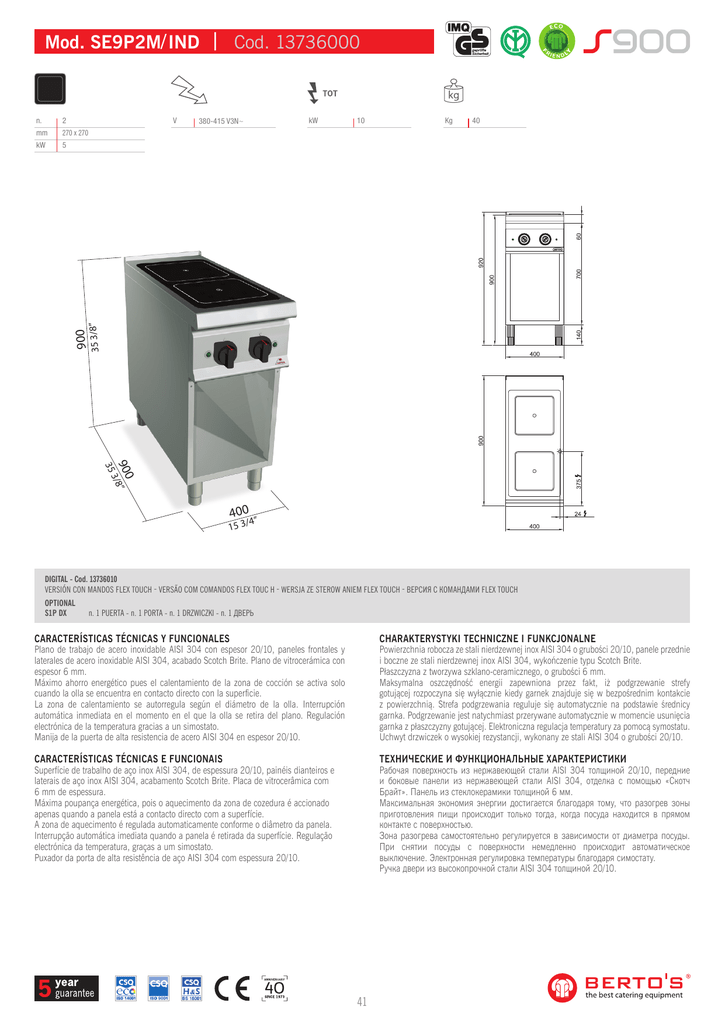 Mod. SE9P2M/ IND | Cod. 13736000 V 2 mm 270 x 270 kW 5 kW 380-415 V3N~ 10 Kg 40 900 35 3/8” n. 35 900/8” 3 400 4” 15 3/ DIGITAL - Cod. 13736010 VERSIÓN CON MANDOS FLEX TOUCH - VERSÃO COM COMANDOS FLEX TOUC H - WERSJA ZE STEROW ANIEM FLEX TOUCH - ВЕРСИЯ С КОМАНДАМИ FLEX TOUCH OPTIONAL S1P DX n. 1 PUERTA - n. 1 PORTA - n. 1 DRZWICZKI - n. 1 ДВЕРЬ CARACTERÍSTICAS TÉCNICAS Y FUNCIONALES CHARAKTERYSTYKI TECHNICZNE I FUNKCJONALNE Plano de trabajo de acero inoxidable AISI 304 con espesor 20/10, paneles frontales y laterales de acero inoxidable AISI 304, acabado Scotch Brite. Plano de vitrocerámica con espesor 6 mm. Máximo ahorro energético pues el calentamiento de la zona de cocción se activa solo cuando la olla se encuentra en contacto directo con la superficie. La zona de calentamiento se autorregula según el diámetro de la olla. Interrupción automática inmediata en el momento en el que la olla se retira del plano. Regulación electrónica de la temperatura gracias a un simostato. Manija de la puerta de alta resistencia de acero AISI 304 en espesor 20/10. Powierzchnia robocza ze stali nierdzewnej inox AISI 304 o grubości 20/10, panele przednie i boczne ze stali nierdzewnej inox AISI 304, wykończenie typu Scotch Brite. Płaszczyzna z tworzywa szklano-ceramicznego, o grubości 6 mm. Maksymalna oszczędność energii zapewniona przez fakt, iż podgrzewanie strefy gotującej rozpoczyna się wyłącznie kiedy garnek znajduje się w bezpośrednim kontakcie z powierzchnią. Strefa podgrzewania reguluje się automatycznie na podstawie średnicy garnka. Podgrzewanie jest natychmiast przerywane automatycznie w momencie usunięcia garnka z płaszczyzny gotującej. Elektroniczna regulacja temperatury za pomocą symostatu. Uchwyt drzwiczek o wysokiej rezystancji, wykonany ze stali AISI 304 o grubości 20/10. CARACTERÍSTICAS TÉCNICAS E FUNCIONAIS ТЕХНИЧЕСКИЕ И ФУНКЦИОНАЛЬНЫЕ ХАРАКТЕРИСТИКИ Superfície de trabalho de aço inox AISI 304, de espessura 20/10, painéis dianteiros e laterais de aço inox AISI 304, acabamento Scotch Brite. Placa de vitrocerâmica com 6 mm de espessura. Máxima poupança energética, pois o aquecimento da zona de cozedura é accionado apenas quando a panela está a contacto directo com a superfície. A zona de aquecimento é regulada automaticamente conforme o diâmetro da panela. Interrupção automática imediata quando a panela é retirada da superfície. Regulação electrónica da temperatura, graças a um simostato. Puxador da porta de alta resistência de aço AISI 304 com espessura 20/10. Рабочая поверхность из нержавеющей стали AISI 304 толщиной 20/10, передние и боковые панели из нержавеющей стали AISI 304, отделка с помощью «Скотч Брайт». Панель из стеклокерамики толщиной 6 мм. Максимальная экономия энергии достигается благодаря тому, что разогрев зоны приготовления пищи происходит только тогда, когда посуда находится в прямом контакте с поверхностью. Зона разогрева самостоятельно регулируется в зависимости от диаметра посуды. При снятии посуды с поверхности немедленно происходит автоматическое выключение. Электронная регулировка температуры благодаря симостату. Ручка двери из высокопрочной стали AISI 304 толщиной 20/10. 41