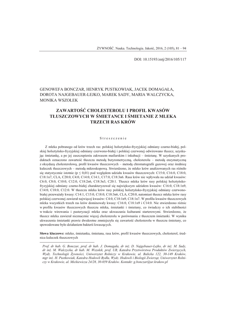 ŻYWNOŚĆ. Nauka. Technologia. Jakość, 2016, 2 (105), 81 – 94 DOI: 10.15193/zntj/2016/105/117 GENOWEFA BONCZAR, HENRYK PUSTKOWIAK, JACEK DOMAGAŁA, DOROTA NAJGEBAUER-LEJKO, MAREK SADY, MARIA WALCZYCKA, MONIKA WSZOŁEK ZAWARTOŚĆ CHOLESTEROLU I PROFIL KWASÓW TŁUSZCZOWYCH W ŚMIETANCE I ŚMIETANIE Z MLEKA TRZECH RAS KRÓW Streszczenie Z mleka pobranego od krów trzech ras: polskiej holsztyńsko-fryzyjskiej odmiany czarno-białej, polskiej holsztyńsko-fryzyjskiej odmiany czerwono-białej i polskiej czerwonej odwirowano tłuszcz, uzyskując śmietankę, a po jej zaszczepieniu zakwasem maślarskim i inkubacji – śmietanę. W uzyskanych produktach oznaczono zawartość tłuszczu metodą butyrometryczną, cholesterolu – metodą enzymatyczną z oksydazą cholesterolową, profil kwasów tłuszczowych – metodą chromatografii gazowej oraz średnicę kuleczek tłuszczowych – metodą mikroskopową. Stwierdzono, że mleko krów analizowanych ras różniło się statystycznie istotnie (p ≤ 0,01) pod względem udziału kwasów tłuszczowych: C15:0, C16:0, C18:0, C18:1n7, CLA, C20:0, C4:0, C14:0, C14:1, C17:0, C18:3n6. Rasa krów nie wpływała na udział kwasów: C6:0, C8:0, C10:0, C12:0, C18:2n6, C18:3n3, C20:1. Tłuszcz mleka krów rasy polskiej holsztyńskofryzyjskiej odmiany czarno-białej charakteryzował się największym udziałem kwasów: C16:0, C18:1n9, C14:0, C18:0, C12:0. W tłuszczu mleka krów rasy polskiej holsztyńsko-fryzyjskiej odmiany czerwonobiałej przeważały kwasy: C14:1, C15:0, C18:0, C18:3n6, CLA, C20:0, natomiast tłuszcz mleka krów rasy polskiej czerwonej zawierał najwięcej kwasów: C4:0, C18:1n9, C18:1n7. W profilu kwasów tłuszczowych mleka wszystkich trzech ras krów dominowały kwasy: C16:0, C18:1n9 i C14:0. Nie stwierdzono różnic w profilu kwasów tłuszczowych tłuszczu mleka, śmietanki i śmietany, co świadczy o ich stabilności w trakcie wirowania i pasteryzacji mleka oraz ukwaszania kulturami starterowymi. Stwierdzono, że tłuszcz mleka zawierał nieznacznie więcej cholesterolu w porównaniu z tłuszczem śmietanki. W wyniku ukwaszenia śmietanki prawie dwukrotne zmniejszyła się zawartość cholesterolu w tłuszczu śmietany, co spowodowane było działaniem bakterii kwaszących. Słowa kluczowe: mleko, śmietanka, śmietana, rasa krów, profil kwasów tłuszczowych, cholesterol, średnica kuleczek tłuszczowych Prof. dr hab. G. Bonczar, prof. dr hab. J. Domagała, dr inż. D. Najgebauer-Lejko, dr inż. M. Sady, dr inż. M. Walczycka, dr hab. M. Wszołek, prof. UR, Katedra Przetwórstwa Produktów Zwierzęcych, Wydz. Technologii Żywności, Uniwersytet Rolniczy w Krakowie, ul. Balicka 122, 30-149 Kraków, mgr inż. H. Pustkowiak, Katedra Hodowli Bydła, Wydz. Hodowli i Biologii Zwierząt, Uniwersytet Rolniczy w Krakowie, al. Mickiewicza 24/28, 30-059 Kraków. Kontakt: [email protected] 82 Genowefa Bonczar i wsp. Wprowadzenie Tłuszcz mlekowy jest składnikiem wpływającym na wartość energetyczną, odżywczą, dietetyczną oraz przydatność technologiczną mleka. Ze względu na stopień rozproszenia jest najlepiej strawnym tłuszczem pochodzenia zwierzęcego. O dużej dyspersji tłuszczu świadczy liczba 2 ÷ 6 mld kuleczek tłuszczowych w 1 ml mleka, których 80 % ma średnicę 3 ÷ 4 μm [9, 14, 22, 35]. Tłuszcz mlekowy to mieszanina tłuszczów prostych (triacylogliceroli – 98,3 %, diacylogliceroli – 0,3 %, monoacylogliceroli – 0,03 %), złożonych (fosfolipidów – 0,5 ÷ 1 %) oraz substancji towarzyszących: steroli – 0,2 ÷ 0,5 % (w tym cholesterolu 0,2 ÷ 0,4 %), karotenoidów, witamin A, D, E i K, wolnych kwasów tłuszczowych (0,1 %) i związków zapachowych (śladowe ilości) [14, 35, 36]. Oprócz glicerolu tłuszcze proste zawierają kwasy tłuszczowe karboksylowe, głównie monokarboksylowe [36]. W tłuszczu mlekowym znajduje się 400 ÷ 500 kwasów tłuszczowych. Spośród nich ok. 15 występuje w ilości ponad 1 %, co stanowi ok. 95 % masy kwasów tłuszczowych tłuszczu mleka. Pozostałe kwasy występują w mniejszych, a nawet w śladowych ilościach [35, 36]. Rozróżnia się kwasy tłuszczowe (KT) nasycone (SFA, ang. Saturated Fatty Acids) i nienasycone (UFA, ang. Unsaturated Fatty Acids) [35, 36]. W grupie nasyconych kwasów tłuszczowych (60 ÷ 70 % KT) krótko- i średniołańcuchowe (SFAsmc – C4:0 ÷ C10:0) stanowią 17 ÷ 25 %, a długołańcuchowe (SFAlc – od C12:0) – 45 ÷ 53 % [33, 34, 36]. SFAsmc są dobrymi składnikami energetycznymi dla organizmu człowieka, pozytywnie oddziałują na ścianę żołądka i jelit oraz procesy trawienne, regulują tworzenie triacylogliceroli i cholesterolu, dzięki czemu wykazują działanie przeciwmiażdżycowe. Przeciwdziałają też chorobom układu krążenia [28]. Z kolei SFAlc są podstawą budowy lipidów, fosfolipidów, glikoprotein i lipoprotein w organizmie człowieka [28, 29]. Przypisuje im się właściwości hiperlipidemiczne i hipercholesterolemiczne, co jest podważane przez niektórych autorów [6, 7, 28]. Nienasycone kwasy tłuszczowe, stanowiące 30 ÷ 35 % KT w mleku, składają się z kwasów: jednonienasyconych (MUFA, ang. Monounsaturated Fatty Acids) z jednym wiązaniem podwójnym oraz z wielonienasyconych (PUFA, ang. Polyunsaturated Fatty Acids) o dwóch wiązaniach podwójnych lub większej ich liczbie [34, 35, 36]. Głównym przedstawicielem MUFA jest kwas oleinowy (C18:1 n-9), natomiast PUFA są reprezentowane przez kwasy: linolowy (n-6) i α-linolenowy (n-3), należące do niezbędnych nienasyconych kwasów tłuszczowych (NNKT) [29]. Kwas oleinowy obniża poziom frakcji LDL cholesterolu we krwi, działa hipolipidemicznie, przeciwnowotworowo, przeciwmiażdżycowo i obniża ciśnienie krwi [28]. Funkcja PUFA, a zwłaszcza CLA, polega na działaniu przeciwnowotworowym, cytotoksycznym (w stosunku do patogenów), chroniącym przed wolnymi rodnikami, hamującym enzymy powodujące ZAWARTOŚĆ CHOLESTEROLU I PROFIL KWASÓW TŁUSZCZOWYCH W 