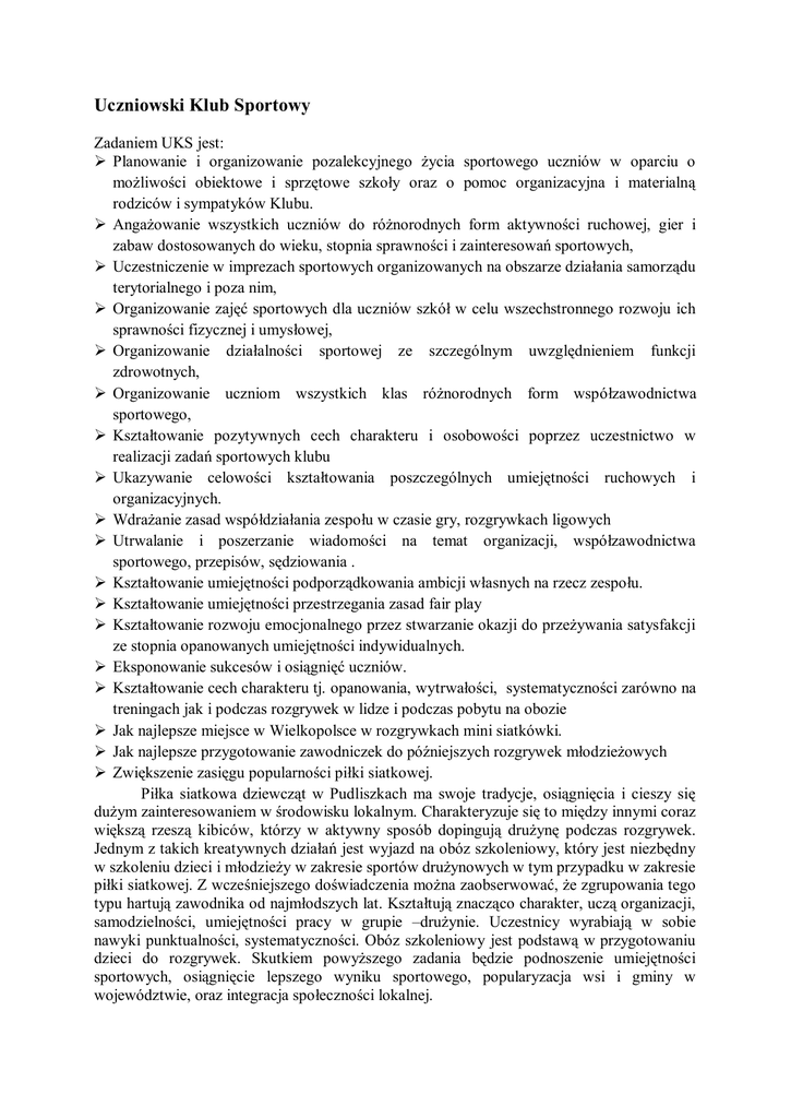 Uczniowski Klub Sportowy Zadaniem UKS jest: Planowanie i organizowanie pozalekcyjnego życia sportowego uczniów w oparciu o możliwości obiektowe i sprzętowe szkoły oraz o pomoc organizacyjna i materialną rodziców i sympatyków Klubu. Angażowanie wszystkich uczniów do różnorodnych form aktywności ruchowej, gier i zabaw dostosowanych do wieku, stopnia sprawności i zainteresowań sportowych, Uczestniczenie w imprezach sportowych organizowanych na obszarze działania samorządu terytorialnego i poza nim, Organizowanie zajęć sportowych dla uczniów szkół w celu wszechstronnego rozwoju ich sprawności fizycznej i umysłowej, Organizowanie działalności sportowej ze szczególnym uwzględnieniem funkcji zdrowotnych, Organizowanie uczniom wszystkich klas różnorodnych form współzawodnictwa sportowego, Kształtowanie pozytywnych cech charakteru i osobowości poprzez uczestnictwo w realizacji zadań sportowych klubu Ukazywanie celowości kształtowania poszczególnych umiejętności ruchowych i organizacyjnych. Wdrażanie zasad współdziałania zespołu w czasie gry, rozgrywkach ligowych Utrwalanie i poszerzanie wiadomości na temat organizacji, współzawodnictwa sportowego, przepisów, sędziowania . Kształtowanie umiejętności podporządkowania ambicji własnych na rzecz zespołu. Kształtowanie umiejętności przestrzegania zasad fair play Kształtowanie rozwoju emocjonalnego przez stwarzanie okazji do przeżywania satysfakcji ze stopnia opanowanych umiejętności indywidualnych. Eksponowanie sukcesów i osiągnięć uczniów. Kształtowanie cech charakteru tj. opanowania, wytrwałości, systematyczności zarówno na treningach jak i podczas rozgrywek w lidze i podczas pobytu na obozie Jak najlepsze miejsce w Wielkopolsce w rozgrywkach mini siatkówki. Jak najlepsze przygotowanie zawodniczek do późniejszych rozgrywek młodzieżowych Zwiększenie zasięgu popularności piłki siatkowej. Piłka siatkowa dziewcząt w Pudliszkach ma swoje tradycje, osiągnięcia i cieszy się dużym zainteresowaniem w środowisku lokalnym. Charakteryzuje się to między innymi coraz większą rzeszą kibiców, którzy w aktywny sposób dopingują drużynę podczas rozgrywek. Jednym z takich kreatywnych działań jest wyjazd na obóz szkoleniowy, który jest niezbędny w szkoleniu dzieci i młodzieży w zakresie sportów drużynowych w tym przypadku w zakresie piłki siatkowej. Z wcześniejszego doświadczenia można zaobserwować, że zgrupowania tego typu hartują zawodnika od najmłodszych lat. Kształtują znacząco charakter, uczą organizacji, samodzielności, umiejętności pracy w grupie –drużynie. Uczestnicy wyrabiają w sobie nawyki punktualności, systematyczności. Obóz szkoleniowy jest podstawą w przygotowaniu dzieci do rozgrywek. Skutkiem powyższego zadania będzie podnoszenie umiejętności sportowych, osiągnięcie lepszego wyniku sportowego, popularyzacja wsi i gminy w województwie, oraz integracja społeczności lokalnej. W ramach działalności UKS są organizowane zajęcia z mini siatkówki 5 razy w tygodniu po dwie godziny. Zarówno zajęcia treningowe jak i uczestnictwo w obozie przeznaczone są dla dzieci, które chcą w aktywny sposób spędzić wolny czas, podnosząc swoje umiejętności sportowe, a jednocześnie reprezentować swoją miejscowość, szkołę oraz gminę w rozgrywkach piłki siatkowej dziewcząt na etapie mini siatkówki w turniejach na szczeblu wielkopolskim jak i ogólnopolskim. https://www.facebook.com/ukspudliszki?ref=hl Szkolne Koło Sportowe Sport i tradycje z nim związane odgrywają w codziennym życiu mojej szkoły dość istotną rolę. Jako szkoła posiadamy dobrą bazę dla rozwoju aktywności ruchowej naszych wychowanków. Dlatego też wychodząc naprzeciw oczekiwaniom naszych uczniów każdego roku prowadzone są dodatkowe zajęcia sportowe, które odbywają się po zakończeniu lekcji. Planując zakres zajęć brane są pod uwagę sugestie samych uczniów – to oni określają w dużej mierze tematykę naszych cotygodniowych spotkań. Dotyczy ona przede wszystkim piłki nożnej i piłki siatkowej, zgodnie z tradycjami sportowymi szkoły i lokalnego klubu sportowego. Zimą, dla „odmiany”, chłopacy chętnie również rozkładają stoły do tenisa stołowego i organizowane są turnieje indywidualne lub deblowe. Celem prowadzenia tych zajęć jest, oprócz sprostania oczekiwaniom dzieci, także przygotowanie uczniów do uczestnictwa w rywalizacji sportowej. Udział dzieci w zawodach sportowych jest uwieńczeniem wielotygodniowych treningów. Pragnę zaznaczyć, że sukcesy sportowe naszych wychowanków mają wpływ na dobre postrzeganie naszej szkoły. Podczas zajęć staramy się zawsze wpajać zasady uczciwego uczestnictwa w rywalizacji oraz poszanowania przeciwnika – zwycięstwo nie koniecznie za wszelką cenę. Poza tym młodzież w czasie tych zajęć nabywa również nowych umiejętności, uczniowie ujawniają często swoje ukryte talenty, rozwijają się i zaspokajają naturalną potrzebę zabawy i zaprezentowania się. Staramy się kształtować w uczniach postawę, w której aktywność sportowa, aktywność fizyczna jest składnikiem nowoczesnego stylu życia, który wyrywa go z bierności, pobudza do podejmowania aktywności ruchowej i kształtuje nawyk spędzania wolnego czasu. Dzień Dziecka połączony z Dniem Sportu Szkolnego Impreza integrująca. zawsze prowadzona była w formie zawodów sportowych (w tych trudno wykluczyć zjawisko rywalizacji), których jednak głównym celem była zabawa, uśmiech i możliwość spotkania całej społeczności szkolnej w jednym miejscu i czasie. Dzieci mogą wtedy porównać swoje umiejętności nie tylko z rówieśnikami – to normalnie robią na lekcjach wychowania fizycznego, ale także z kolegami starszymi i młodszymi. Przyznać trzeba, że uczeń młodszy nie zawsze ustępuje tym starszym, pozornie silniejszym i sprawniejszym. Do naszych – nauczycieli wychowania f