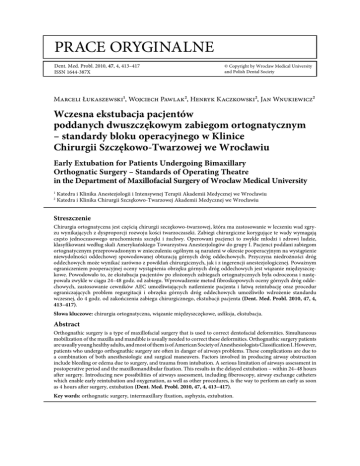 prace oryginalne Dent. Med. Probl. 2010, 47, 4, 413–417 ISSN 1644-387X © Copyright by Wroclaw Medical University and Polish Dental Society Marceli Łukaszewski¹, Wojciech Pawlak², Henryk Kaczkowski², Jan Wnukiewicz² Wczesna ekstubacja pacjentów poddanych dwuszczękowym zabiegom ortognatycznym – standardy bloku operacyjnego w Klinice Chirurgii Szczękowo-Twarzowej we Wrocławiu Early Extubation for Patients Undergoing Bimaxillary Orthognatic Surgery – Standards of Operating Theatre in the Department of Maxillofacial Surgery of Wroclaw Medical University 1 2 Katedra i Klinika Anestezjologii i Intensywnej Terapii Akademii Medycznej we Wrocławiu Katedra i Klinika Chirurgii Szczękowo-Twarzowej Akademii Medycznej we Wrocławiu Streszczenie Chirurgia ortognatyczna jest częścią chirurgii szczękowo-twarzowej, która ma zastosowanie w leczeniu wad zgryzu wynikających z dysproporcji rozwoju kości twarzoczaszki. Zabiegi chirurgiczne korygujące te wady wymagają często jednoczasowego uruchomienia szczęki i żuchwy. Operowani pacjenci to zwykle młodzi i zdrowi ludzie, klasyfikowani według skali Amerykańskiego Towarzystwa Anestezjologów do grupy I. Pacjenci poddani zabiegom ortognatycznym przeprowadzonym w znieczuleniu ogólnym są narażeni w okresie pooperacyjnym na wystąpienie niewydolności oddechowej spowodowanej obturacją górnych dróg oddechowych. Przyczyna niedrożności dróg oddechowych może wynikać zarówno z powikłań chirurgicznych, jak i z ingerencji anestezjologicznej. Poważnym ograniczeniem pooperacyjnej oceny wystąpienia obrzęku górnych dróg oddechowych jest wiązanie międzyszczękowe. Powodowało to, że ekstubacja pacjentów po złożonych zabiegach ortognatycznych była odroczona i następowała zwykle w ciągu 24–48 godz. od zabiegu. Wprowadzenie metod fibroskopowych oceny górnych dróg oddechowych, zastosowanie cewników AEC umożliwiających natlenienie pacjenta i łatwą reintubację oraz procedur ograniczających problem regurgitacji i obrzęku górnych dróg oddechowych umożliwiło wdrożenie standardu wczesnej, do 4 godz. od zakończenia zabiegu chirurgicznego, ekstubacji pacjenta (Dent. Med. Probl. 2010, 47, 4, 413–417). Słowa kluczowe: chirurgia ortognatyczna, wiązanie międzyszczękowe, asfiksja, ekstubacja. Abstract Orthognathic surgery is a type of maxillofacial surgery that is used to correct dentofacial deformities. Simultaneous mobilization of the maxilla and mandible is usually needed to correct these deformities. Orthognathic surgery patients are usually young healthy adults, and most of them is of American Society of Anesthesiologists Classification I. However, patients who undergo orthognathic surgery are often in danger of airways problems. These complications are due to a combination of both anesthesiologic and surgical maneuvers. Factors involved in producing airway obstruction include bleeding or edema due to surgery, and trauma from intubation. A serious limitation of airways assessment in postoperative period and the maxillomandibular fixation. This results in the delayed extubation – within 24–48 hours after surgery. Introducing new possibilities of airways assessment, including fiberoscopy, airway exchange catheters which enable early reintubation and oxygenation, as well as other procedures, is the way to perform an early as soon as 4 hours after surgery, extubation (Dent. Med. Probl. 2010, 47, 4, 413–417). Key words: orthognatic surgery, intermaxillary fixation, asphyxia, extubation. 414 Znieczulenie ogólne pacjentów poddanych zabiegom ortognatycznym (wskazania: korekta zniekształceń twarzowo-szczękowo-zgryzowych) jest w swojej specyfice odmienne od znieczulenia w innych działach chirurgii. Operowani pacjenci to zwykle osoby na granicy wieku dorosłego, w pełni zdrowe, klasyfikowane według skali ASA na 1. miejscu, ale miejsce operacji obejmujące górne drogi oddechowe może stwarzać poważne niebezpieczeństwo wystąpienia niewydolności oddechowej w okresie okołooperacyjnym, co powoduje, że chorzy ci wymagają szczególnego przygotowania i nadzoru anestezjologicznego [1–5]. Intubacja pacjentów poddanych zabiegom ortognatycznym następuje w większości przypadków przez przewód nosowy [6] (ryc. 1). W praktyce klinicznej istnieje również możliwość zastosowania intubacji podbródkowej [7, 8]. Uwidocznienie wejścia do krtani jest standardową procedurą anestezjologiczną i w przypadku tzw. zespołu trudnej intubacji jej przeprowadzenie opiera się na ustalonych wytycznych [9]. Ważną kwestią pozostaje dobór najodpowiedniejszego momentu ekstubacji pacjenta po zabiegu. W tym przypadku wiele argumentów przeciwko wczesnej ekstubacji powoduje, że często odracza się moment usunięcia rurki intubacyjnej, a pacjenci w stanie sedacji zostają przekazani na oddział intensywnej terapii (OIT) [1, 2]. Przyczyna niedrożności górnych dróg oddechowych (g.d.o.), a następnie niedotlenienia jest często złożona. Dochodzi do niej w wyniku wielu powikłań zarówno chirurgicznych, jak i anestezjologicznych. Brak możliwości wizualizacji jamy ustnej przed ekstubacją, będącej następstwem obecności i unieruchomienia międzyszczękowego (ryc. 2) powoduje, że sam moment ekstubacji, a następnie kilkugodzinny okres po usunięciu rurki intubacyjnej jest newralgiczny, podczas którego może zaistnieć konieczność reintubacji chorego. Zabieg chirurgiczny zmieniający anatomię jamy nosowo-gardłowej, obrzęk i krwawienia do tkanek miękkich przestrzeni okołogardłowej powodują, że opisywana reintubacja jest procedurą bardzo trudną. Poza dużym doświadczeniem lekarza anestezjologa wymaga zapewnienia szybkiego dostępu do odpowiedniego sprzętu do intubacji, w tym fiberoskopu, a w ostateczności przeprowadzenia zabiegu konikotomii lub tracheotomii [10, 11]. Wśród wspólnych chirurgicznych i anestezjologicznych przyczyn okołooperacyjnej niewydolności oddechowej należy wymienić o