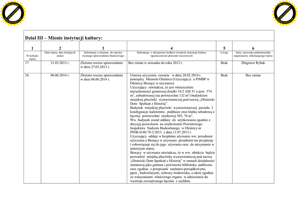 F -X C h a n ge F -X C h a n ge c u -tr a c k N y bu to k lic Dzia III – Mienie instytucji kultury: 1 Nr kolejny wpisu 2 3 4 5 6 Data wpisu, daty kolejnych zmian Informacja o z eniu do rejestru rocznego sprawozdania finansowego Informacja o obci eniu rodków trwa ych instytucji kultury ograniczonymi prawami rzeczowymi Uwagi Imi i nazwisko pe nomocnika organizatora dokonuj cego wpisu Brak Zbigniew Rybak Brak Bez zmian 17. 31.03.2013 r. ono roczne sprawozdanie w dniu 27.03.2013 r. 18. 06.06.2014 r. ono roczne sprawozdanie w dniu 06.06.2014 r. Bez zmian w stosunku do roku 2012 r. Umowa u yczenia zawarta w dniu 28.02.2014 r. pomi dzy Miastem Ole nica (U yczaj cy) a PiMBP w Ole nicy Bior cy w u ywanie). yczaj cy o wiadcza, e jest w cicielem nieruchomo ci gruntowej dzia ki 16/2 AM 51 o pow. 374 m2, zabudowanej (na powierzchni 132 m2) budynkiem miejskiej placówki wystawienniczej pod nazw „Ole nicki Dom Spotka z Histori ”. Budynek miejskiej placówki wystawienniczej posiada 2 kondygnacje nadziemne, poddasze oraz klatk schodow o cznej powierzchni u ytkowej 303, 74 m2. Ww. budynek zosta oddany do u ytkowania zgodnie z decyzj pozwolenia na u ytkowanie Powiatowego Inspektora Nadzoru Budowlanego w Ole nicy nr PINB.4140.78-2/2013 z dnia 11.07.2013 r. yczaj cy oddaje w bezp atne u ywanie ww. przedmiot yczenia a Bior cy w u ywanie przedmiot ten przyjmuje i zobowi zuje si do jego u ywania oraz do utrzymania w nale ytym stanie. Bior cy w u ywanie o wiadcza, e w ww. obiekcie b dzie prowadzi miejsk placówk wystawiennicz pod nazw „Ole nicki Dom Spotka z Histori ” w ramach dzia alno ci statutowej jako gminna i powiatowa biblioteka publiczna oraz zgodnie z przepisami sanitarno-porz dkowymi, ppo ., budowlanymi, ochrony rodowiska, a tak e zgodnie ze wskazaniami w ciwego organu w odniesieniu do wystroju zewn trznego cznie z szyldem. .d o o .c m C m w o .d o w w w w w C lic k to bu y N O W ! PD O W ! PD c u -tr a c k .c F -X C h a n ge F -X C h a n ge c u -tr a c k N y bu to k lic Bior cy w u ywanie o wiadcza, e jest w posiadaniu ww. przedmiotu u yczenia i stwierdza, e znajduje si on w stanie przydatnym do umówionego u ytku. Wydanie ww. obiektu nast pi o na podstawie protoko u zdawczo – odbiorczego, zawieraj cego szczegó owy opis cz ci nieruchomo ci. Usterki ujawnione w okresie gwarancji i r kojmi zostan usuni te przez wykonawc inwestycji (przedmiotu yczenia) lub na jego koszt przez U yczaj cego. W czasie trwania stosunku u yczenia bior cy w u ywanie zobowi zany jest do: - wykonywania napraw: pod óg posadzek, stolarki okiennej i drzwiowej, mebli wbudowanych , ciennych ok adzin ceramicznych, lusarki oraz instalacji wewn trz obiektów, - usuwania niedro no ci przewodów odp ywowych od urz dze sanitarnych w obiekcie, - odnawianie obiektów i przynale nych do niego pomieszcze co najmniej raz na 3 lata w sposób gwarantuj cy utrzymanie obiektu w nale ytej czysto ci i w ciwym stanie technicznym poprzez: * malowanie sufitów, cian oraz napraw uszkodze tynkowych, * malowanie i konserwacja okien i drzwi, urz dze sanitarnych, gazowych, elektrycznych i lusarki w celu zabezpieczenia przed korozj , - naprawy im wymiany wyposa enia obiektu na asny koszt. Bior cy w u ywanie poza ww. naprawami zobowi zany jest do naprawiania szkód powsta ych z jego winy w substancji obiektu oraz szkód poniesionych przez osoby trzecie korzystaj ce z pomieszcze obiektu lub szkód powsta ych bez winy Bior cego w u yczenie wskutek oberwania si cz ci budynku lub spadni cia, przesuni cia oraz zepsucia rzeczy, zwi zanych z funkcjonowaniem miejskiej placówki wystawienniczej. Bior cy w u ywanie mo e dokona nak adów i ulepsze w obiekcie trwale zwi zanych z u yczanym obiektem, celowych dla rodzaju prowadzonej przez siebie .d o o .c m C m w o .d o w w w w w C lic k to bu y N O W ! PD O W ! PD c u -tr a c k .c F -X C h a n ge F -X C h a n ge c u -tr a c k N y bu to k lic dzia alno ci. Je eli bior cy w u ywanie poczyni bez zgody yczaj cego zmiany w przedmiocie u yczenia dla którego wymagana jest zgoda, obowi zany jest do przywrócenia stanu pierwotnego zgodnie z protoko em zdawczo-odbiorczym. Koszty poniesionych przez Bior cego w u ywanie ww. nak adów i ulepsze nie b podlega y zwrotowi. Po zako czeniu u ytkowania i opró nieniu obiektu Bior cy w u ywanie jest obowi zany: - odnowi pomieszczenia obiektu i dokona obci aj cych go napraw, - zwróci U yczaj cemu równowarto zu ytych elementów wyposa enia technicznego, które znajdowa y si w pomieszczeniach obiektu w chwili wydania go Bior cemu w u ywanie, je eli Bior cy w u ywanie dokona wymiany niektórych elementów tego wyposa enia, przys uguje mu zwrot kwoty odpowiadaj cej ró nicy ich warto ci pomi dzy stanem istniej cym w dniu obj cia obiektu oraz w dniu jego opró nienia. Je eli w czasie trwania stosunku u yczenia zajdzie potrzeba wykonania napraw, które obci aj yczaj cego, Bior cy w u ywanie zobowi zany jest natychmiast o tym zawiadomi U yczaj cego, w przeciwnym wypadku odpowiedzialny jest za ewentualne szkody. Bior cy w u ywanie ma obowi zek: 1) zawarcia umów : -ubezpieczenia odpowiedzialno ci cywilnej z tytu u prowadzonej dzia alno ci w obiektach i na terenie przedmiotu u yczenia oraz u ytkowania przedmiotu u yczenia, - ubezpieczenia przedmiotu u yczenia od ognia i innych zdarze losowych, -dostaw energii elektrycznej, -dostaw wody i odprowadzenie cieków oraz wywóz nieczysto ci sta ych, .d o o .c m C m w o .d o w w w w w C lic k to bu y N O W ! PD O W ! PD c u -tr a c k .c F -X C h a n ge F -X C h a n ge c u -tr a c k N y bu to k lic -dostaw energii cieplnej, -na us ugi internetowe, - na ochron obiektu. 2) utrzymanie porz dku i czysto ci na zewn trz budynków w obr bie nieruchomo ci b cej przedmiotem u yczenia 3) utrzymanie estetycznego wygl du budynku. Bior cy w u ywanie mo e odda w cz ci obiekt osobie trzeciej do bezp atnego u ywania albo w podnajem lub udost pni do korzystania na podstawie innego stosunku prawnego. Bior cy w u ywanie nie mo e bez zgody U yczaj cego czyni na u 